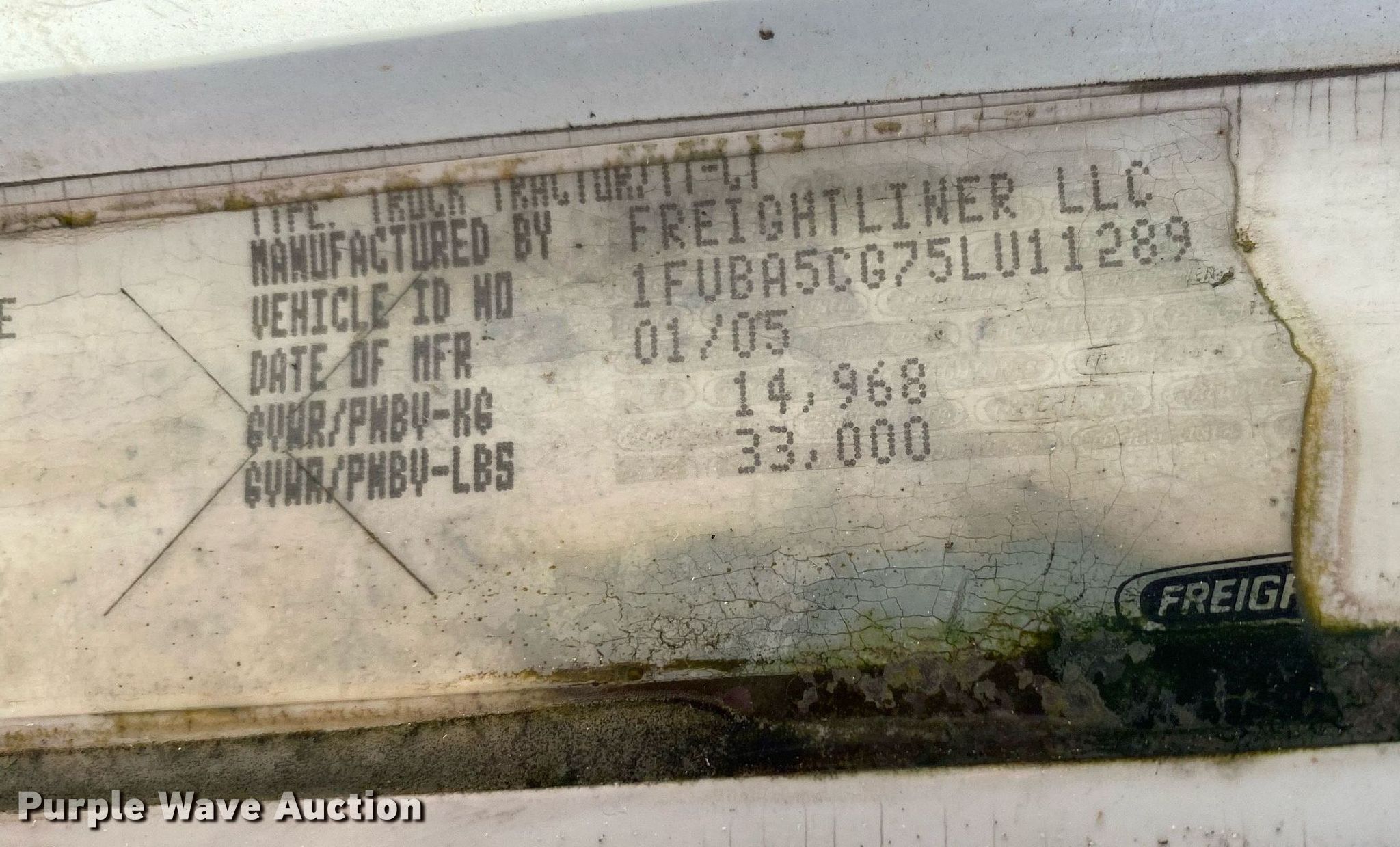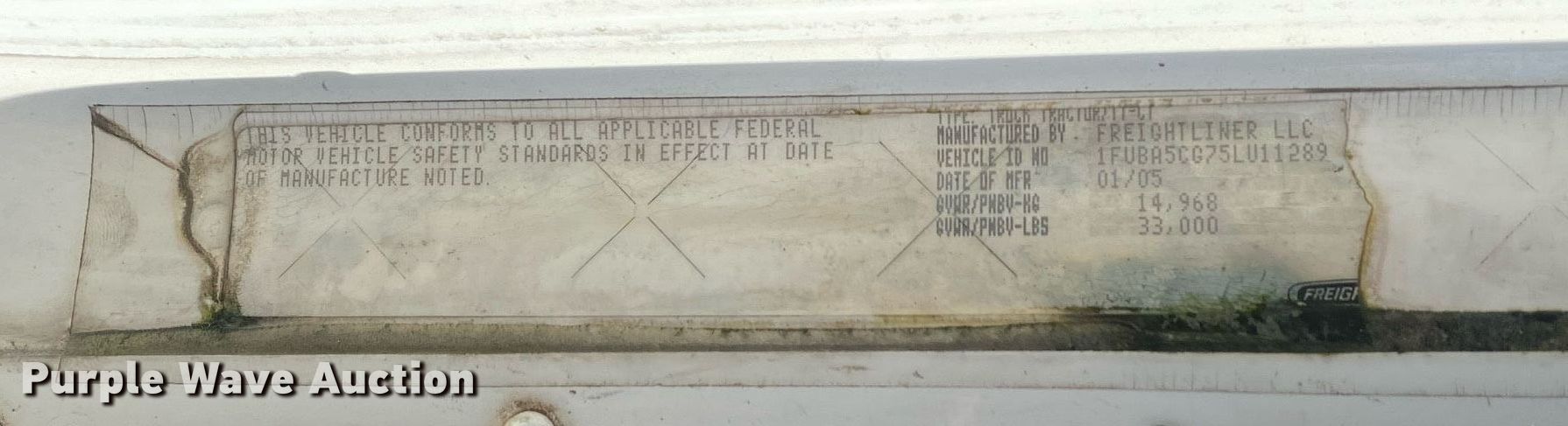 Purple Wave is selling a used Truck Tractor in Oklahoma. This item is a 2005 Freightliner Columbia semi truck with the following: Miles: 116,489 on odometer, Hours: 7,636 on meter, VIN: 1FUBA5CG75LU11289