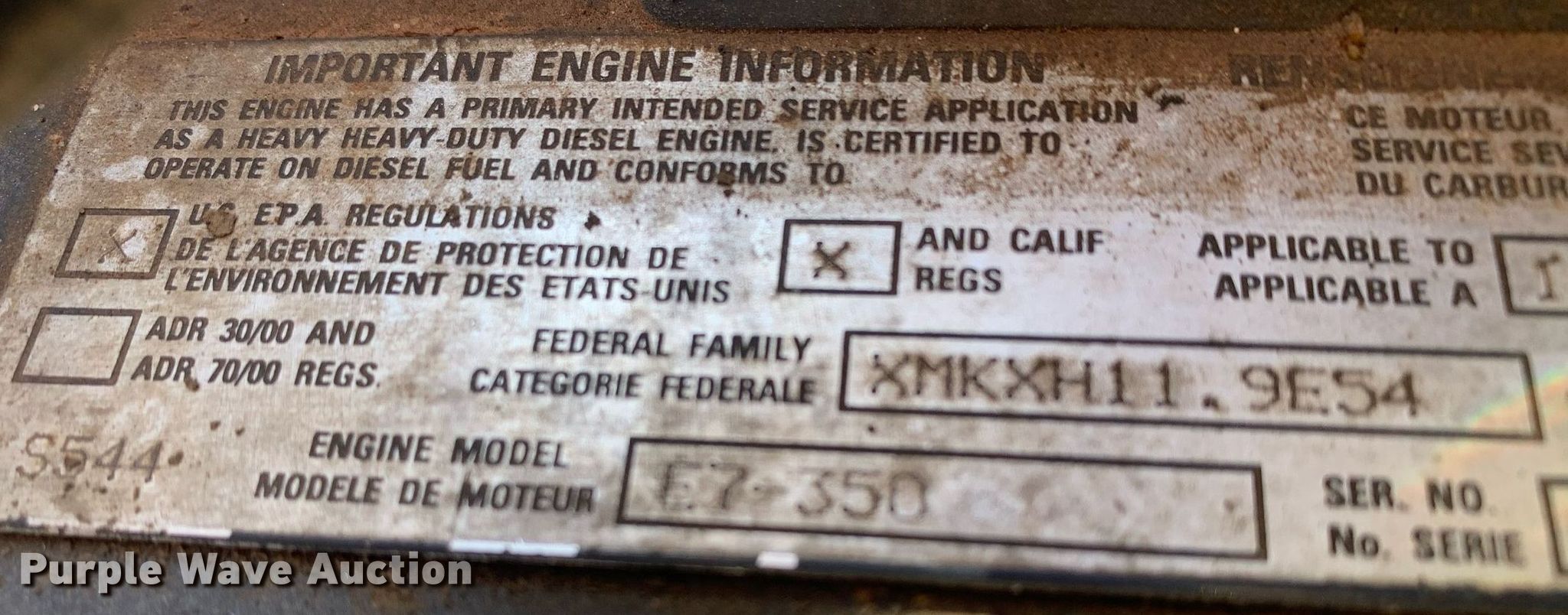2000 Mack CH613 semi truck. Miles: 455,946 on odometer, Hours: 16,523 on meter, Miles or hours may vary, unit still in use, VIN: 1M1AA13Y7YW118967. Engine Cummins E7-350, Serial: 901683, Displacement: 12.0L, Cylinders: 6, Fuel type: Diesel. Transmission Eaton Fuller, Manual, Speed: 10. Chassis Axles: Tandem, Differential lock: Inter-axle, Suspension: Air Dump valves, Brakes: Air, PTO, GVWR: 48,000 lbs FAWR: 12,000 lbs, IAWR: 18,000 lbs, RAWR: 18,000 lbs. Interior AC, Heat, Power windows, Cruise control, Air ride cab. Features Fifth wheel type: Air operated, Sliding, Fuel tank: Single. Tires Front: 11R22.5, Rear: 295/75R22.5. View repairs. Arkansas title. Title distribution may be delayed up to 14 days from verification of funds. Kenny Mullins Trucking. 66 Rooster Road. Conway, AR 72032
