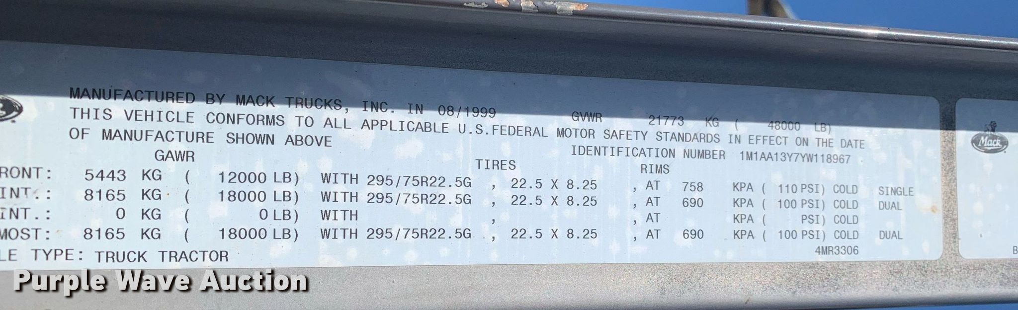 Purple Wave is selling a used Truck Tractor in Arkansas. This item is a 2000 Mack CH613 semi truck with the following: Miles: 455,946 on odometer, Hours: 16,523 on meter, Miles or hours may vary, unit still in use, VIN: 1M1AA13Y7YW118967