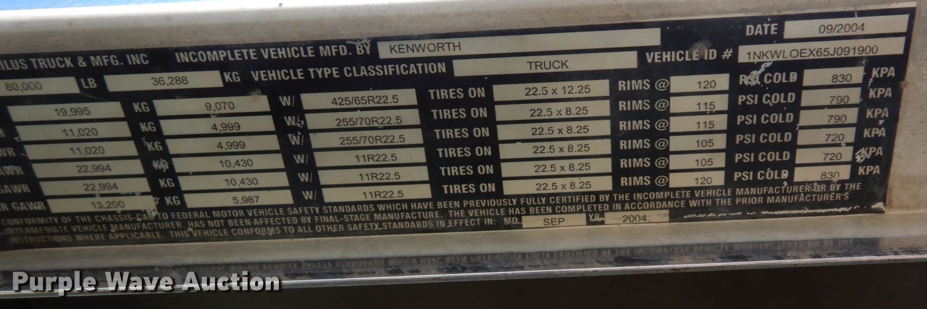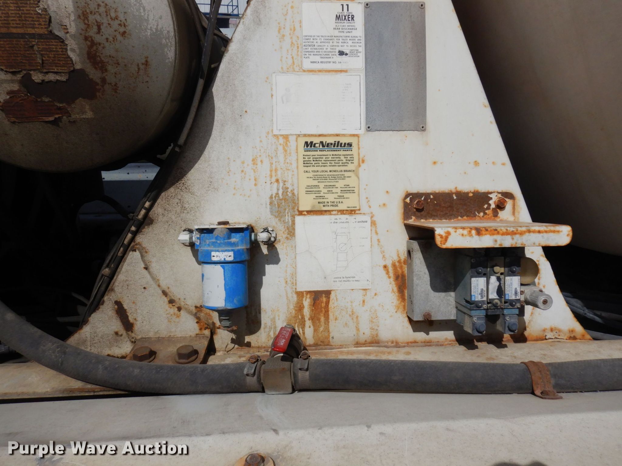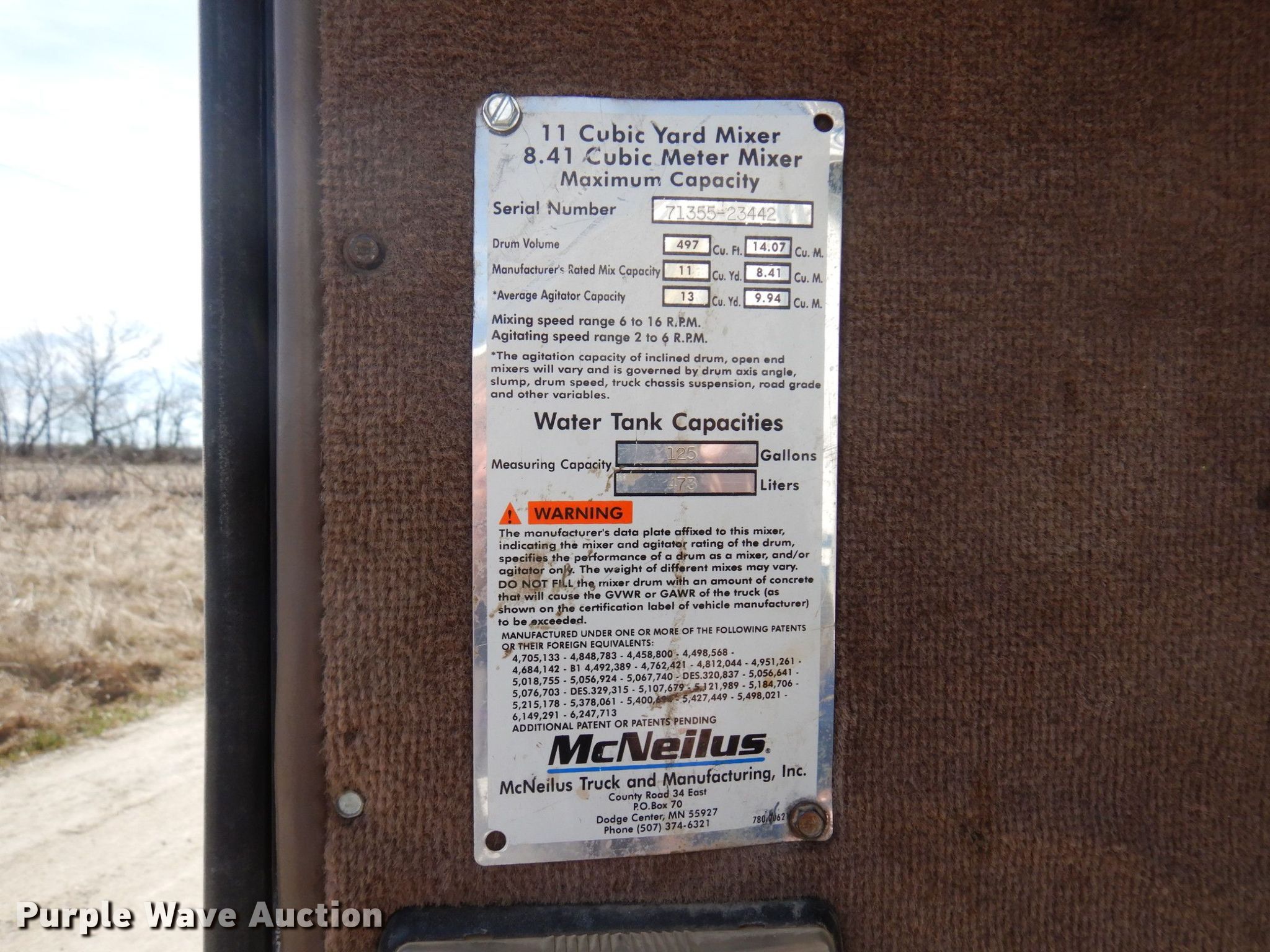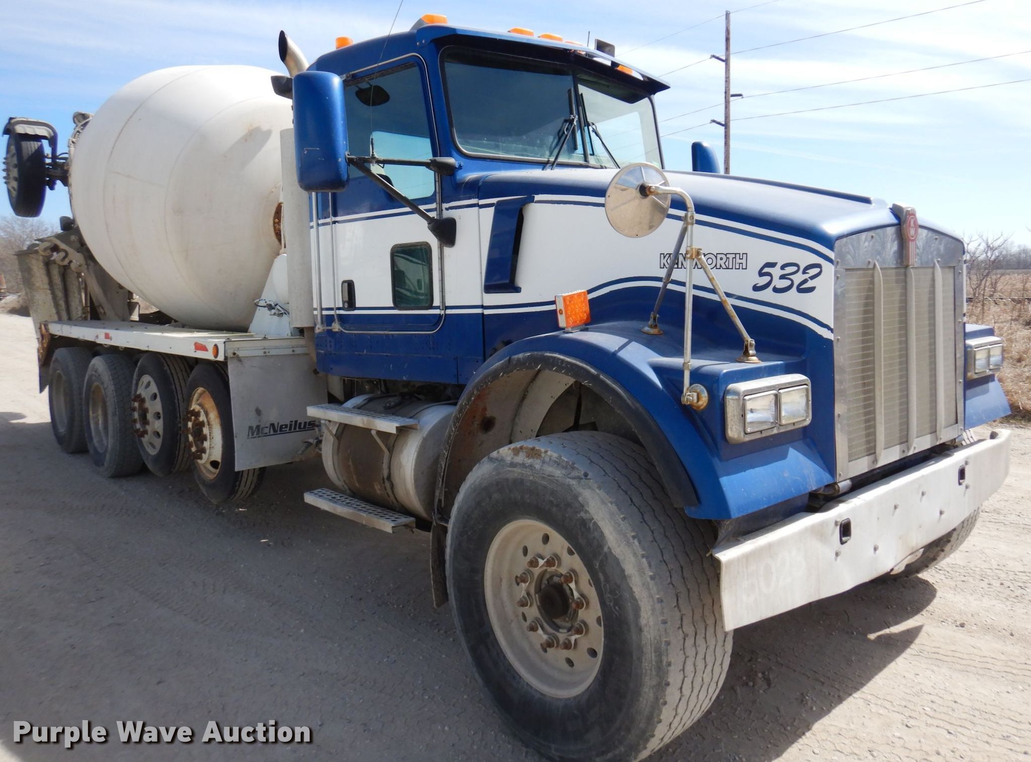 2005 Kenworth W900 ready mix truck. Miles: 45,681 on odometer, Hours: 8,432 on meter, VIN: 1NKWL0EX65J091900. Engine Cummins ISM320V, Displacement: 10.8L, Cylinders: 6, Fuel type: Diesel, HP: 350. Transmission Eaton Fuller, Manual. Chassis Axles: 5, Pusher axle Steerable, Tag axle Steerable, Differential lock: Full, Suspension: Spring over walking beam, Brakes: Air, PTO, GVWR: 80,000 lbs FAWR: 19,995 lbs, IAWR: 22,994 lbs, RAWR: 22,994 lbs, Lift axle GAWR: 11,020 lbs. Interior AC, Heat, Heated mirrors, Cruise control, Brake controller. Features Mixer McNeilus , Serial: 71355-23442, Capacity: 11 cu.yd., Discharge: Rear, In-cab controls, Rear drum controls, Water tank capacity: 125 gallons, Chute Extensions: 3, Chute type: Steel, Auto lube. Tires Front: 425/65R22.5, Rear: 11R22.5, Lift axle: 255/70R22.5. Notes Odometer replaced at approx. 189,530 miles. Minnesota title. Title distribution may be delayed up to 14 days from verification of funds. Duininck Concrete. 4967 Minnesota 29. Alexandria, MN 56308