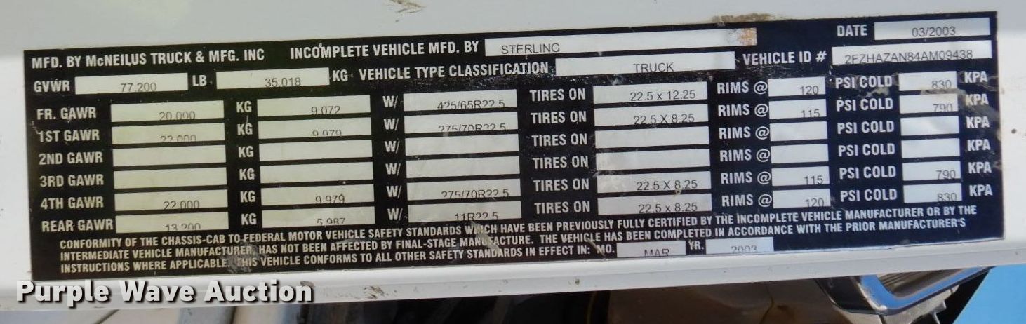 2004 Sterling LT9500 ready mix truck. Miles: 259,374 on odometer, Hours: 21,708 on meter, VIN: 2FZHAZAN84AM09438. Engine Caterpillar C10, Displacement: 10.3L, Cylinders: 6, Fuel type: Diesel, HP: 305, kW: 227.5. Transmission Eaton Fuller Roadranger RTO-9 MLL, Manual, Speed: 11. Chassis Axles: Tandem, Tag axle Steerable, Differential lock: Full, Suspension: Spring over walking beam, Brakes: Air, PTO, GVWR: 77,200 lbs FAWR: 20,000 lbs, IAWR: 22,000 lbs, RAWR: 22,000 lbs, Lift axle GAWR: 13,200 lbs. Interior AC, Heat, Heated mirrors, Cruise control. Features Mixer McNeilus , Discharge: Rear, In-cab controls, Rear drum controls, Chute Extensions: 3, Chute type: Steel.. Tires Front: 425/65R22.5, Rear: 11R22.5. Notes Air leak. Minnesota title. Title distribution may be delayed up to 14 days from verification of funds. Duininck Concrete. 21350 Highway 23 NE. New London, MN 56273