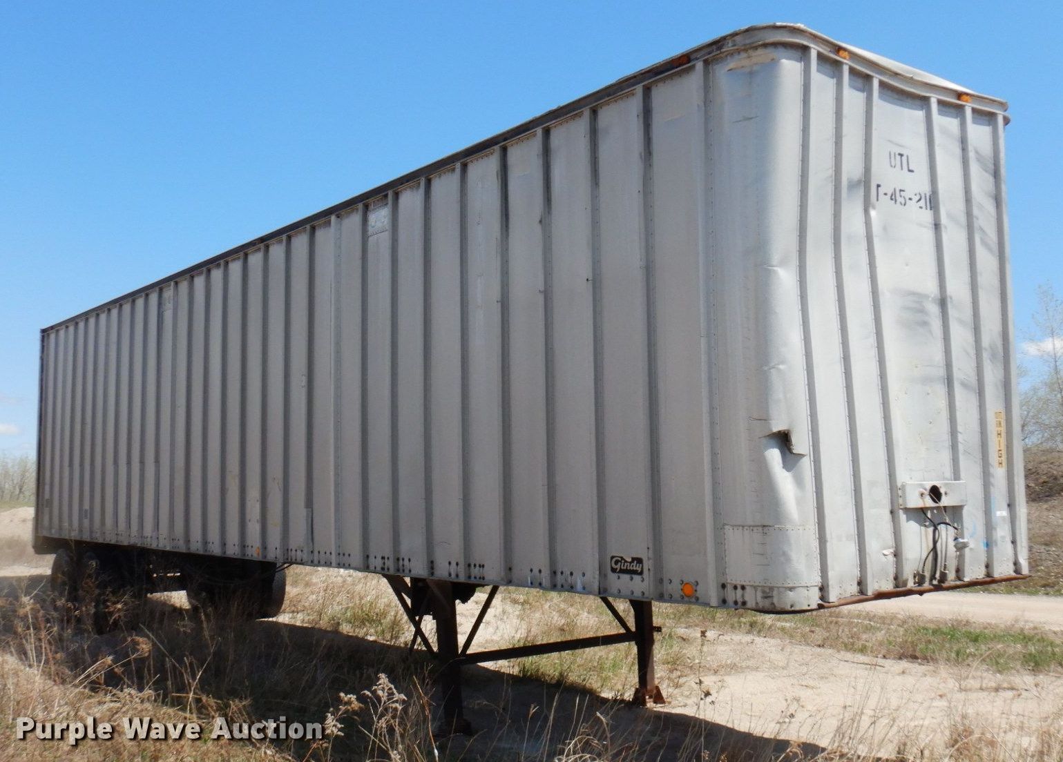 1969 Gindy dry van trailer. VIN: 58844. Dimensions Overall: 45' L x 96" W. Features Deck type: Wood. Chassis Landing gear: Dual, Suspension: Spring, Brakes: Air, Axles: Tandem. Tires Steel wheels, Size: 10.00-20. Notes Contents not included. Minnesota title. Title distribution may be delayed up to 14 days from verification of funds. Duininck Concrete. 21350 Highway 23 NE. New London, MN 56273