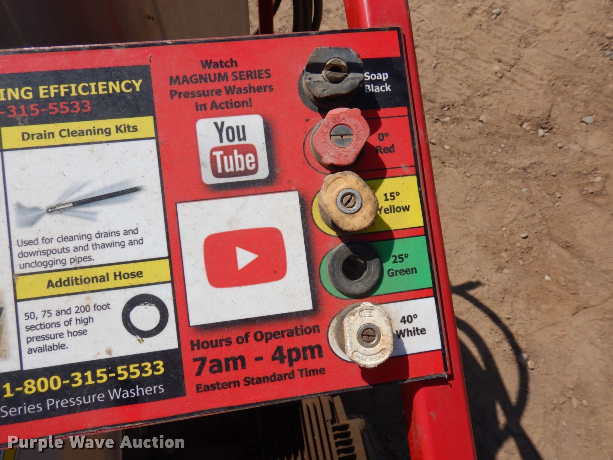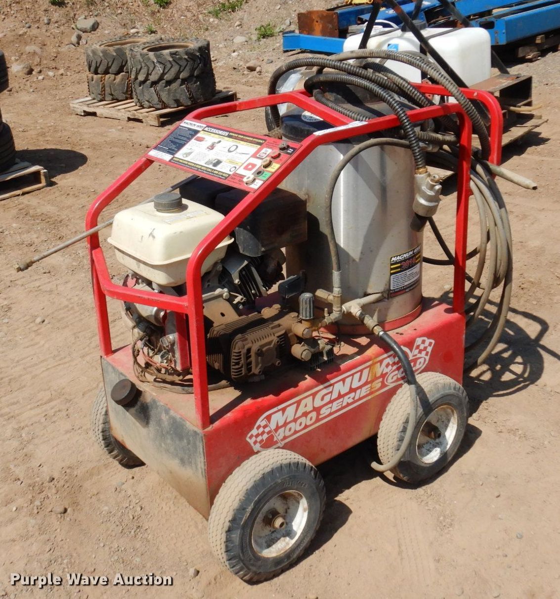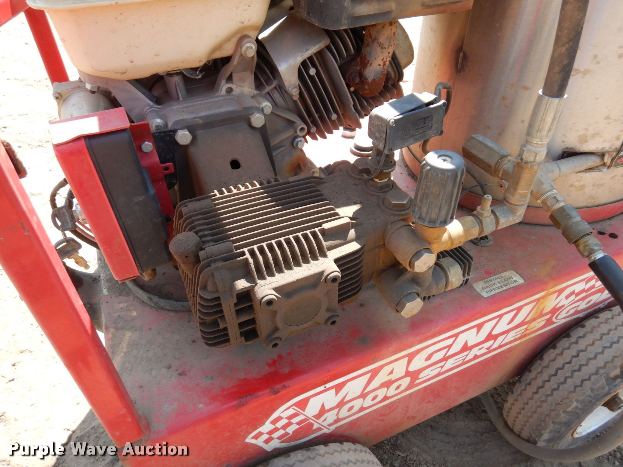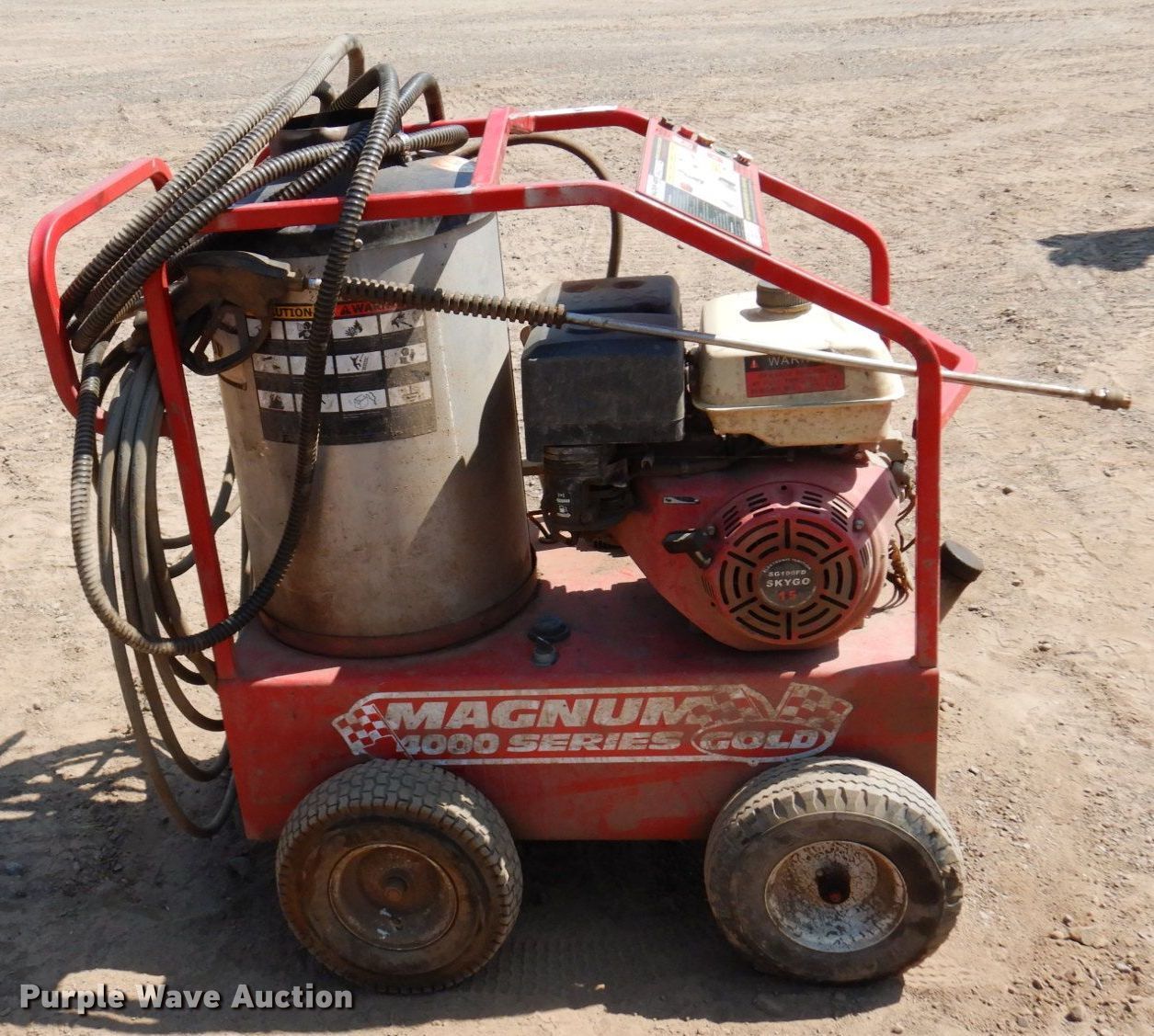 Purple Wave is selling a used Pressure Washer in Minnesota. This item is a Magnum 4000 Gold hot pressure washer with the following: Single cylinder gas engine, Burner, Fuel type: Diesel, Kerosene, PSI: 4,000, Sand blaster kit, Tires: 4.10x3.5-6