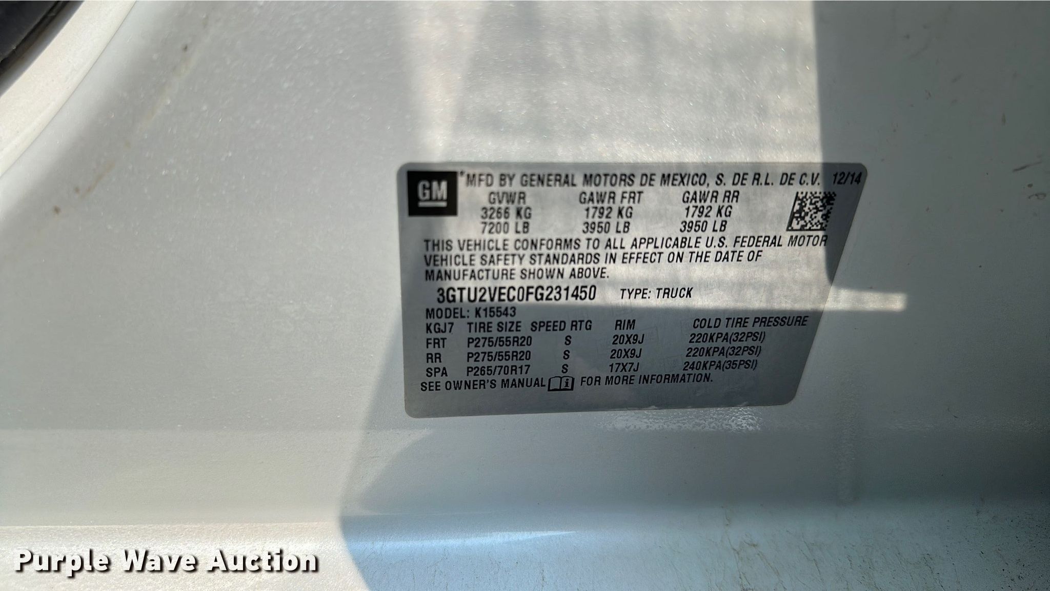 2015 GMC Sierra 1500 SLT Crew Cab pickup truck. Miles: 194,489 on odometer, VIN: 3GTU2VEC0FG231450. Engine Displacement: 5.3L V8 OHV, Cylinders: 8, Fuel type: Gas. Transmission Automatic, Four wheel drive. Interior AC, Heat, Seat: Heated, Power driver, Power passenger, Power windows, Power locks, Cruise control, Backup camera. Tires Size: P275/55R20. View repairs. Minnesota title. Title distribution may be delayed up to 14 days from verification of funds. 2203 Richland Drive Southwest. Willmar, MN 56201