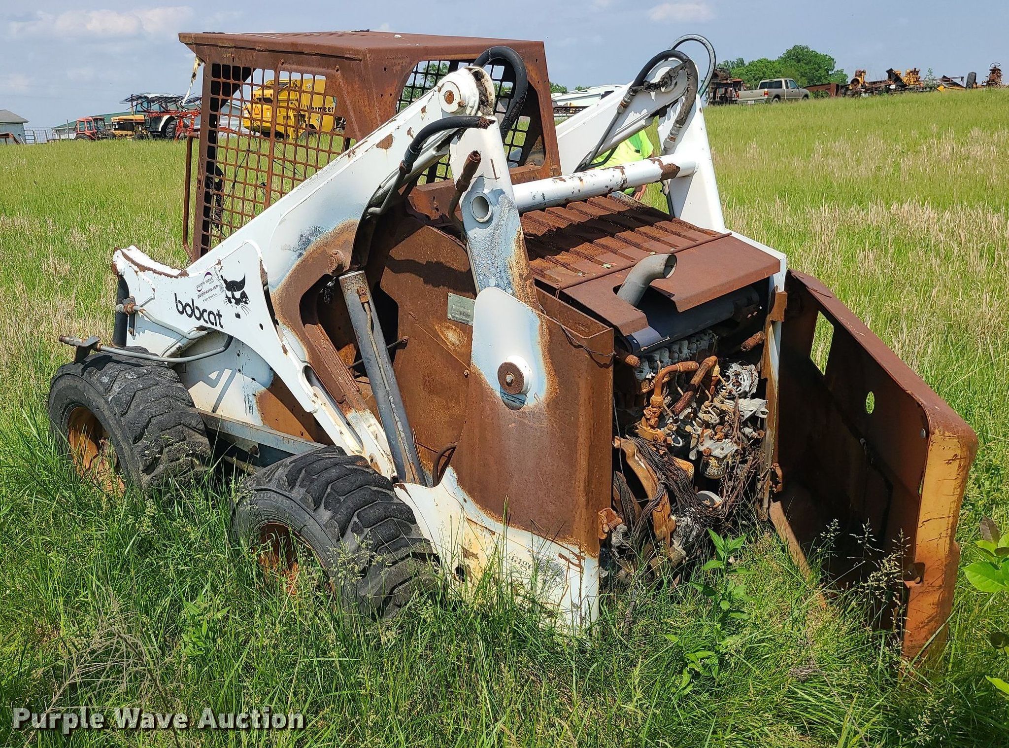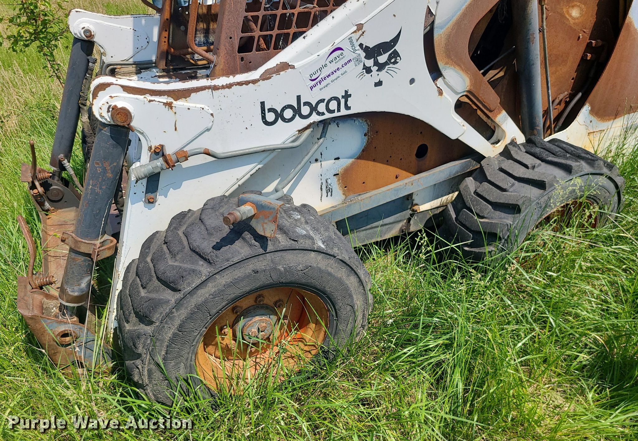 1998 Bobcat 863 skid steer loader. Hours: Unknown, Serial: 514426334. Engine Displacement: 178 C.I.D., Cylinders: 4, Fuel type: Diesel. Transmission Hydrostatic. Operators station Bucket control: Foot. Features Auxiliary hydraulics, Quick coupler: Manual. Tires Size: 12-16.5. Notes Fire damage , Non-operational unit. 1120 NE 1051 Rd. Concordia, MO 64020