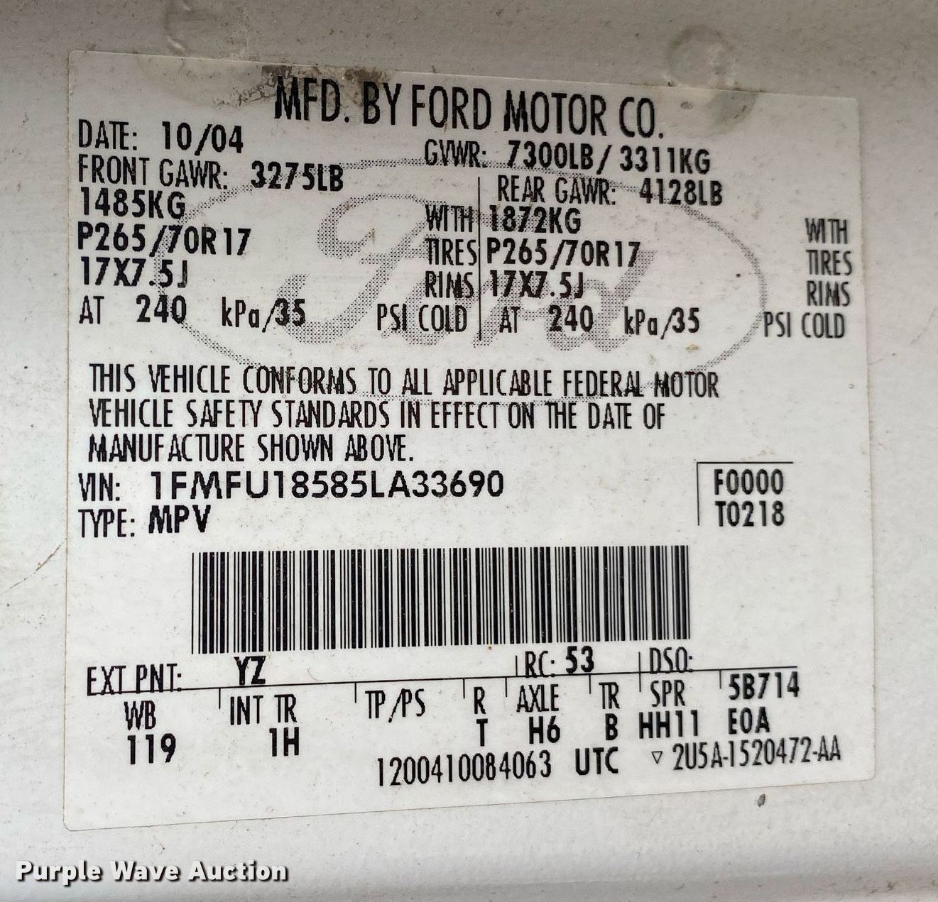 2005 Ford Expedition SUV. Miles: 298,414 on odometer, VIN: 1FMFU18585LA33690, Unit #: 500. Engine Displacement: 5.4L V8 SOHC , Cylinders: 8, Fuel type: Gas. Transmission Automatic. Interior AC, Heat, Seat: Heated, Cooled, Power driver, Power passenger, Power windows, Power locks, Cruise control, Powered sunroof. Tires Size: 265/70R17. Notes Dash warning indicator: Check engine, Check gauge. Oklahoma title. Title distribution may be delayed up to 30 days from verification of funds. ARKK Trucking, Inc.. 18912 W 51 Hy S. Sand Springs, OK 74063