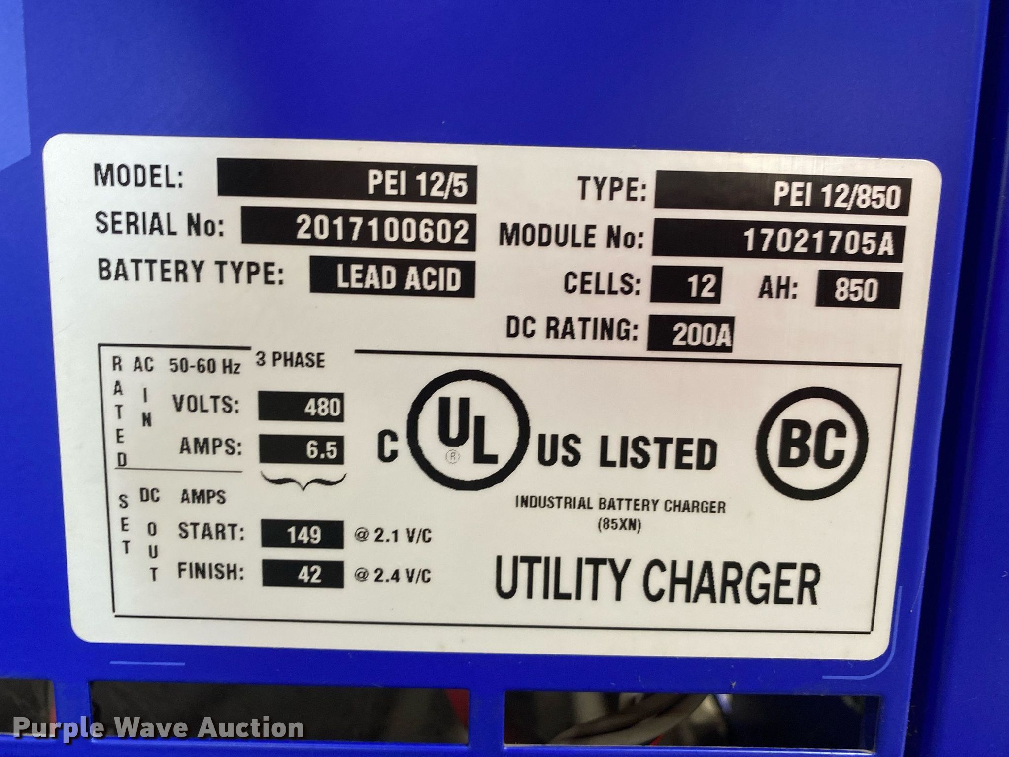Purple Wave is selling a used Forklift Attach. in Oklahoma. This item is a Infinity PEI 12/5 forklift charger with the following: Volts: 480, Phase: Three, Amp: 6.5