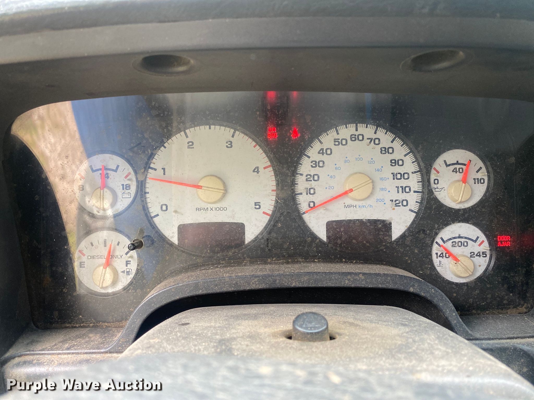 2003 Dodge Ram 3500 Quad Cab bale bed pickup truck. Miles: Unknown Actual mileage unknown, VIN: 3D7LU38C63G775183. Engine Displacement: 5.9L L6 OHV, Cylinders: 6, Fuel type: Diesel. Transmission Manual, Speed: 5, Four wheel drive. Interior AC, Heat, Seat: Power driver, Power windows, Power locks, Cruise control. Features Hydraulic bale bed 6' 8" L x 80" W, Spike, Hitch: Gooseneck, Remote control. Tires Size: 295/70R17. Notes Dash warning indicator: Airbag, Hail damage, Rust damage, Odometer illumination issues. Oklahoma title. Mileage has not been verified. Exempt will be written in the odometer disclosure on the title. Title distribution may be delayed up to 14 days from verification of funds. Mounds, OK 74047