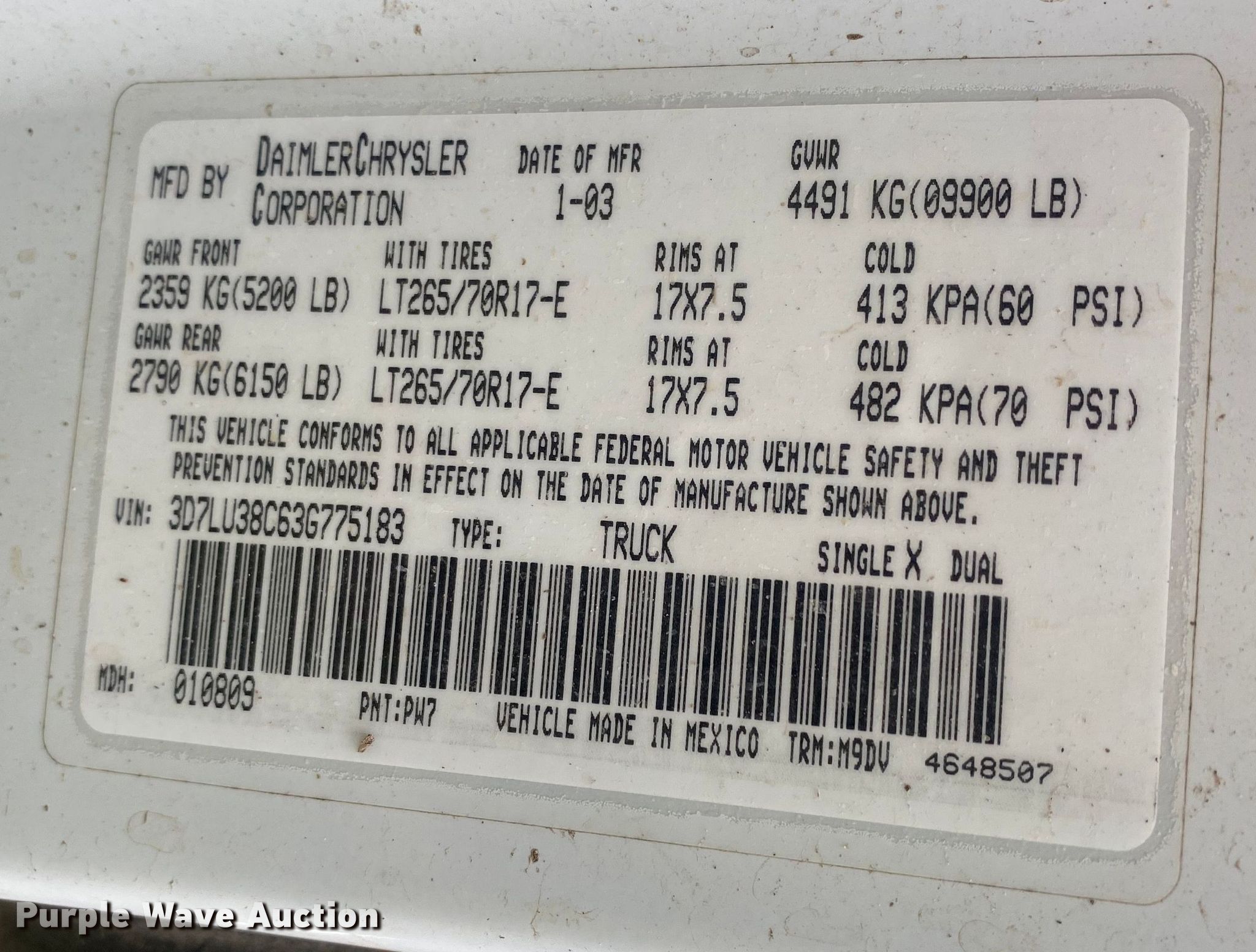 Purple Wave is selling a used 3/4 or 1 Ton Pickup or Van in Oklahoma. This item is a 2003 Dodge Ram 3500 Quad Cab bale bed pickup truck with the following: Miles: Unknown, Actual mileage unknown, VIN: 3D7LU38C63G775183