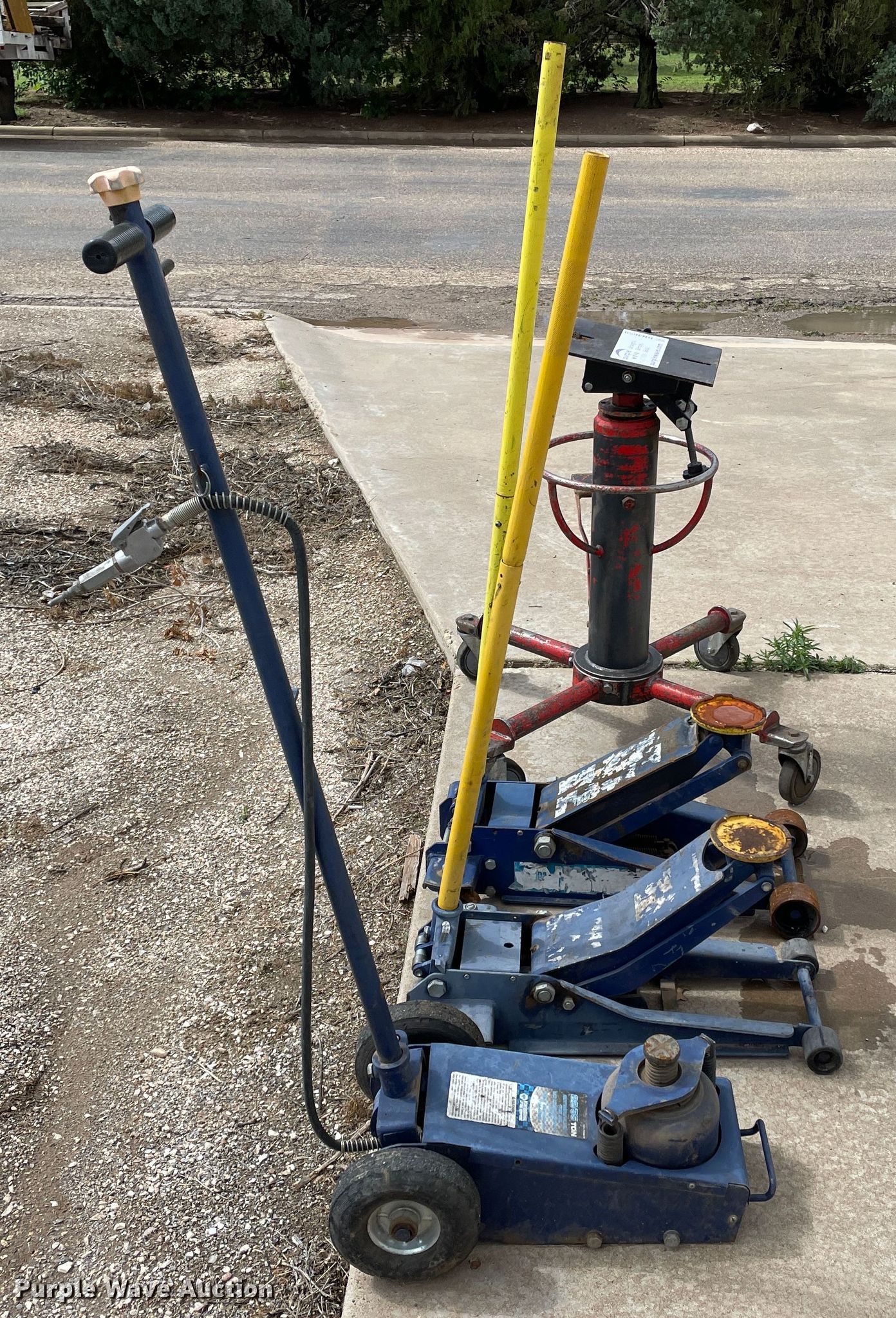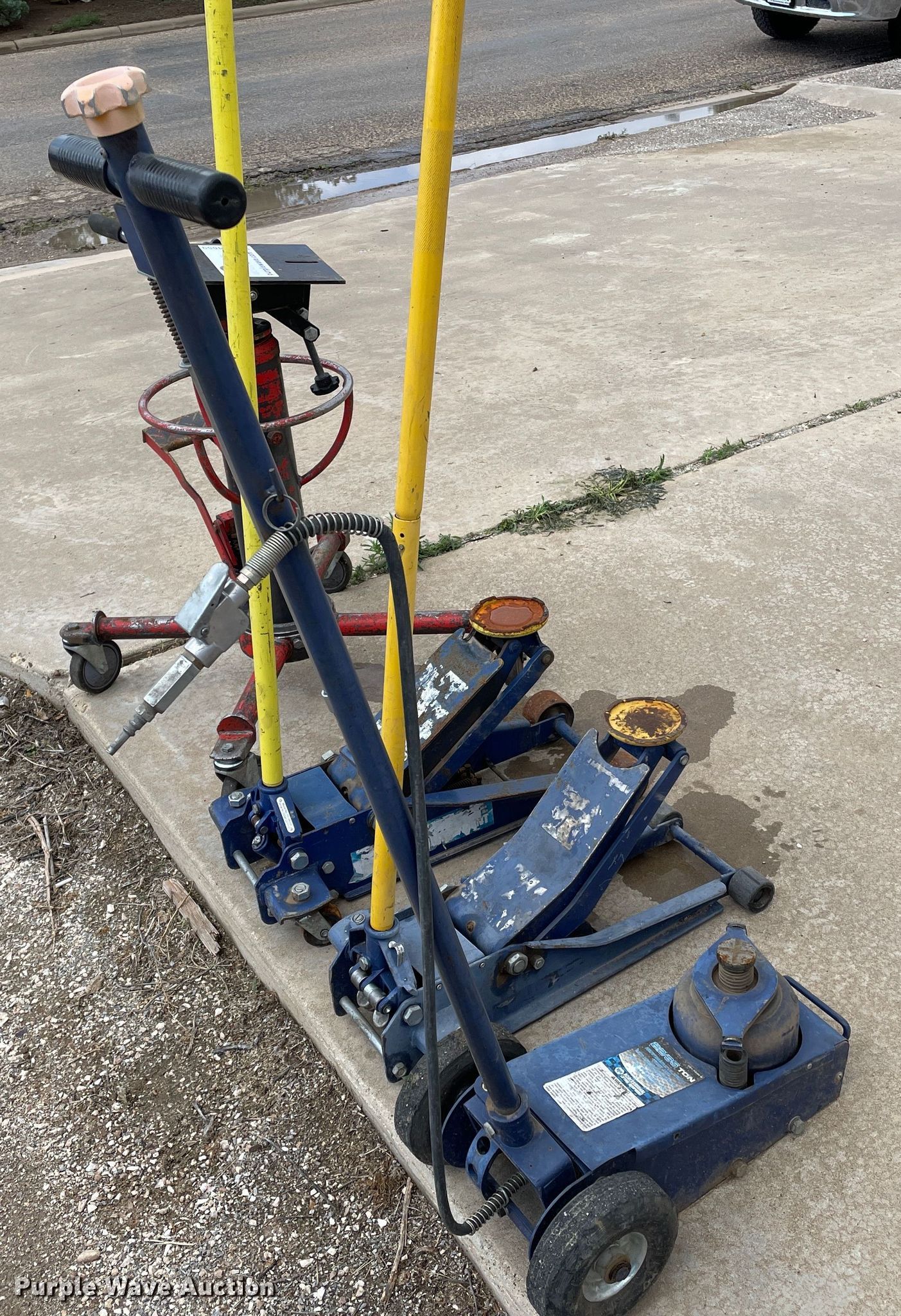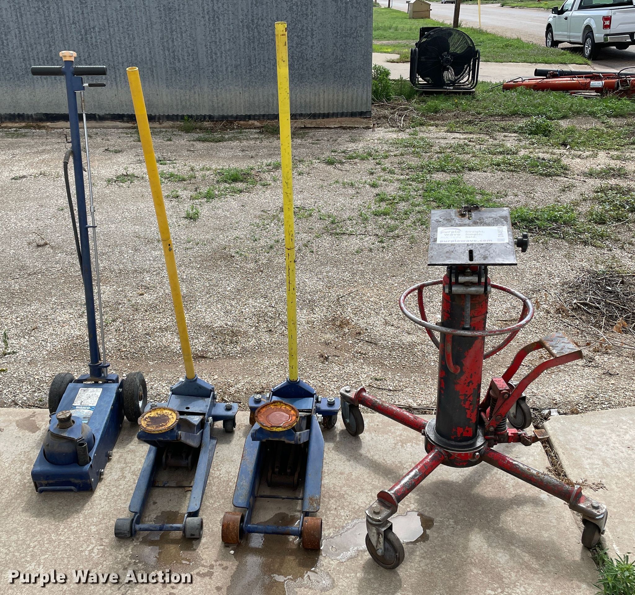 Purple Wave is selling a used Tools in Texas. This item is a Jacks with the following: (3) floor Jacks, Transmission jack, Unknown operating condition