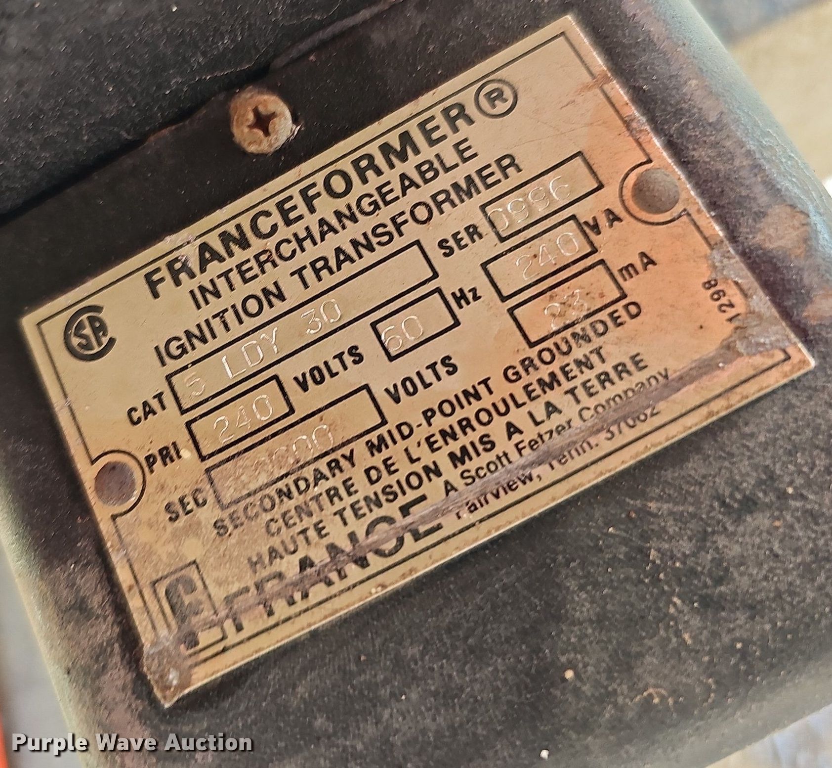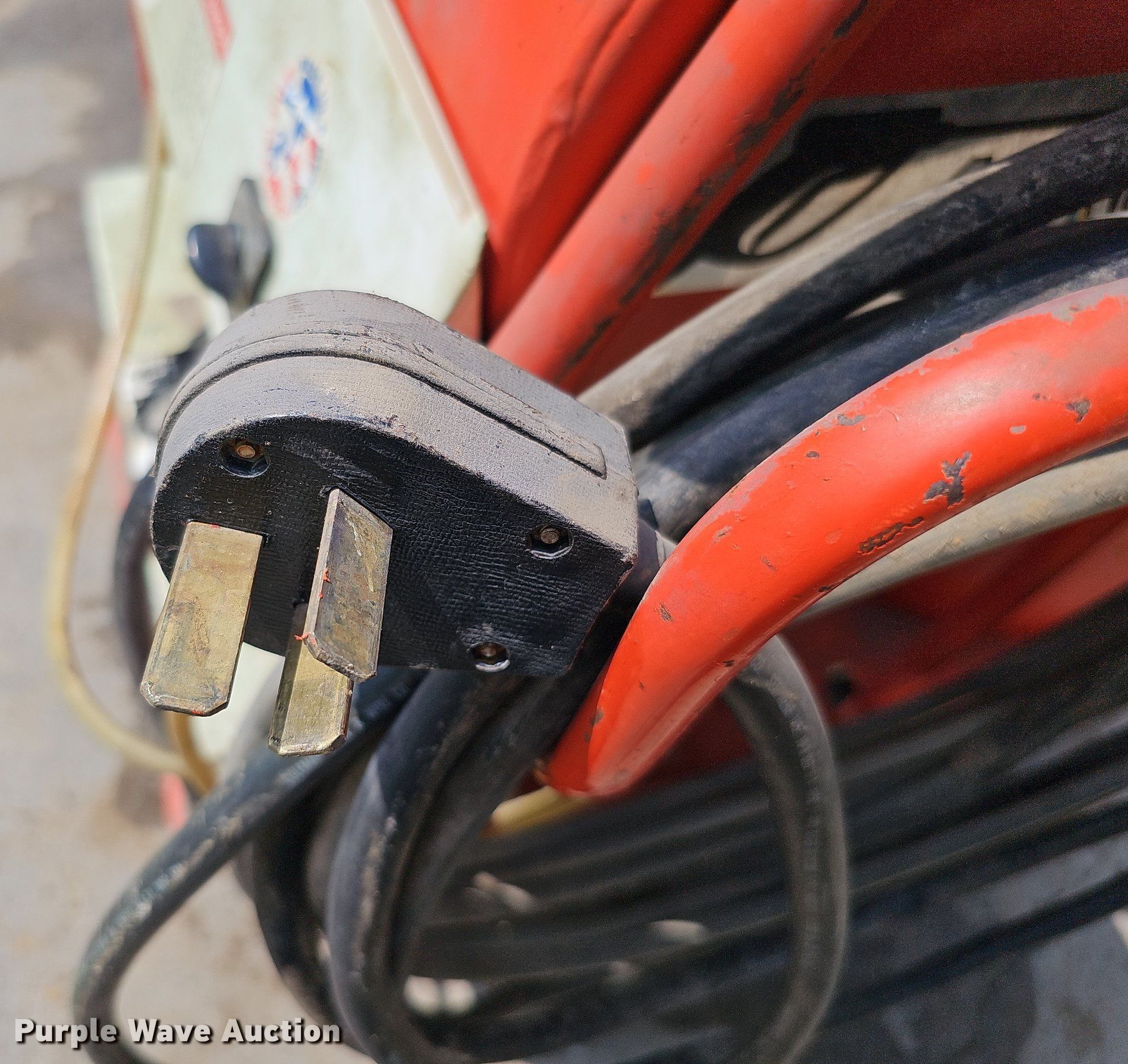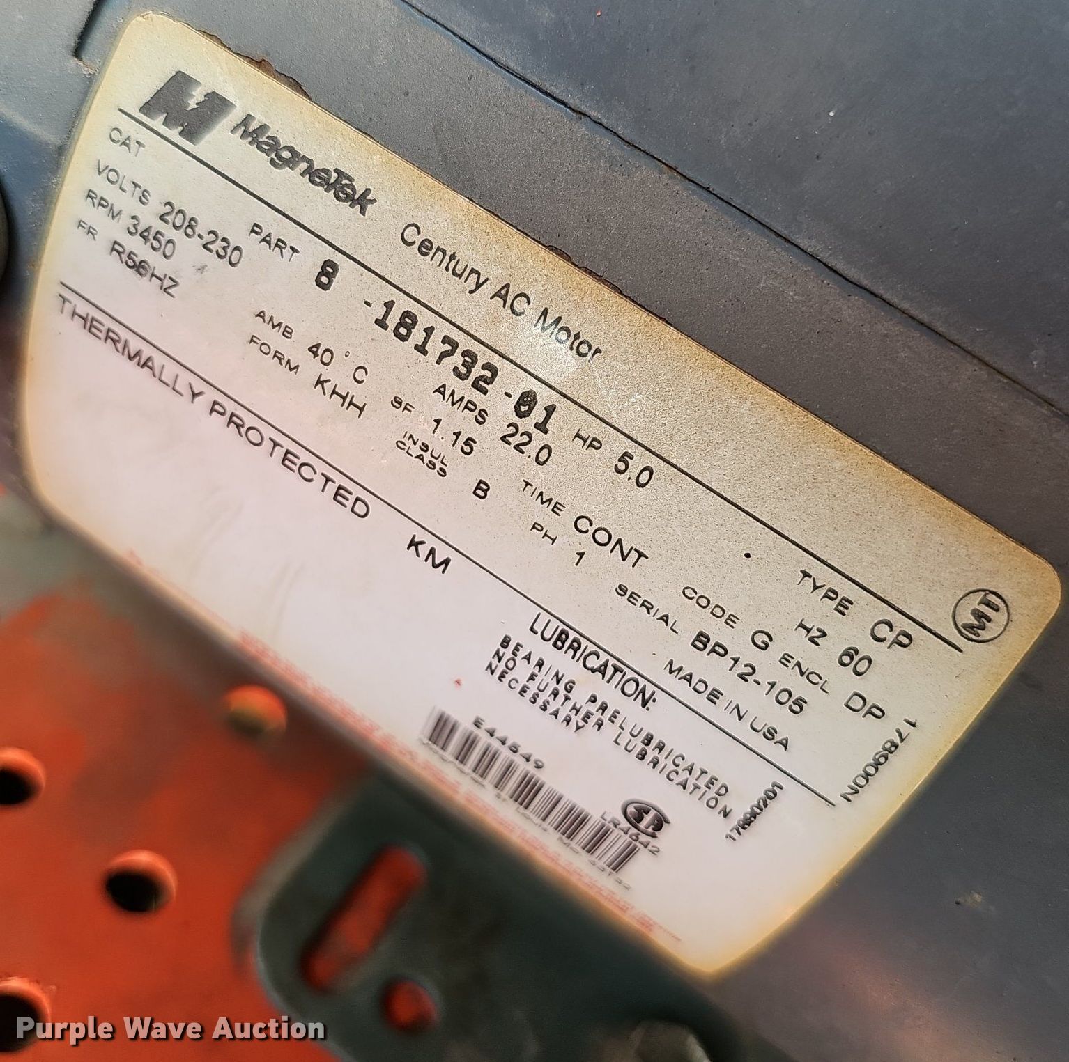 Alkota Cleaning Systems 4182 hot pressure washer. Serial: 185598. Electric Motor MagneTek 8-181732-01 Serial: BP12-105, HP: 5, Volts: 208-230, Phase: Single. Features Ignition transformer Model: 5LDY 30, Volts: 240, Serial: 0996. Tires Size: 4.10-3.50. Notes Hose damage, Non-operational wand. Inline Construction. 930 Jayhawk Rd. Marysville, KS 66508