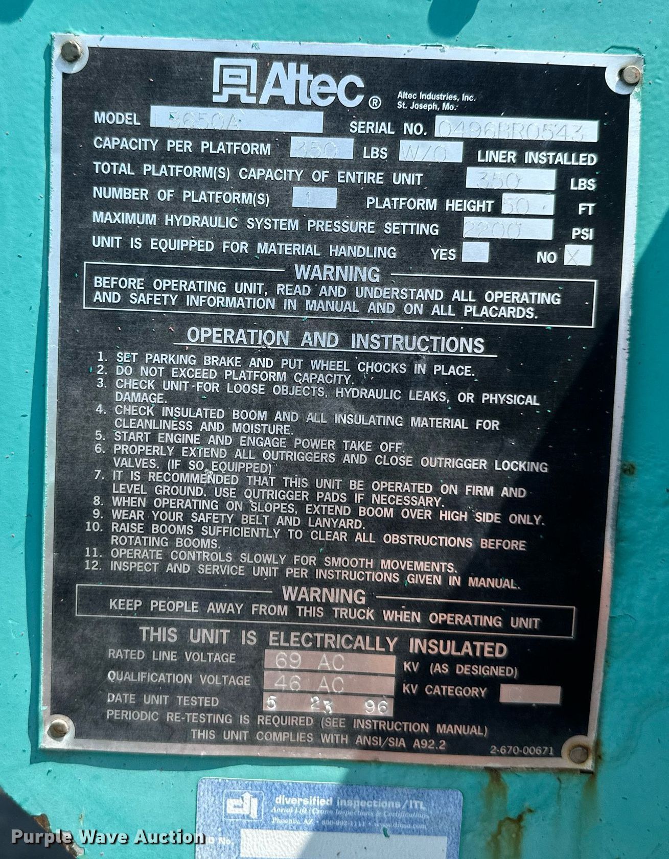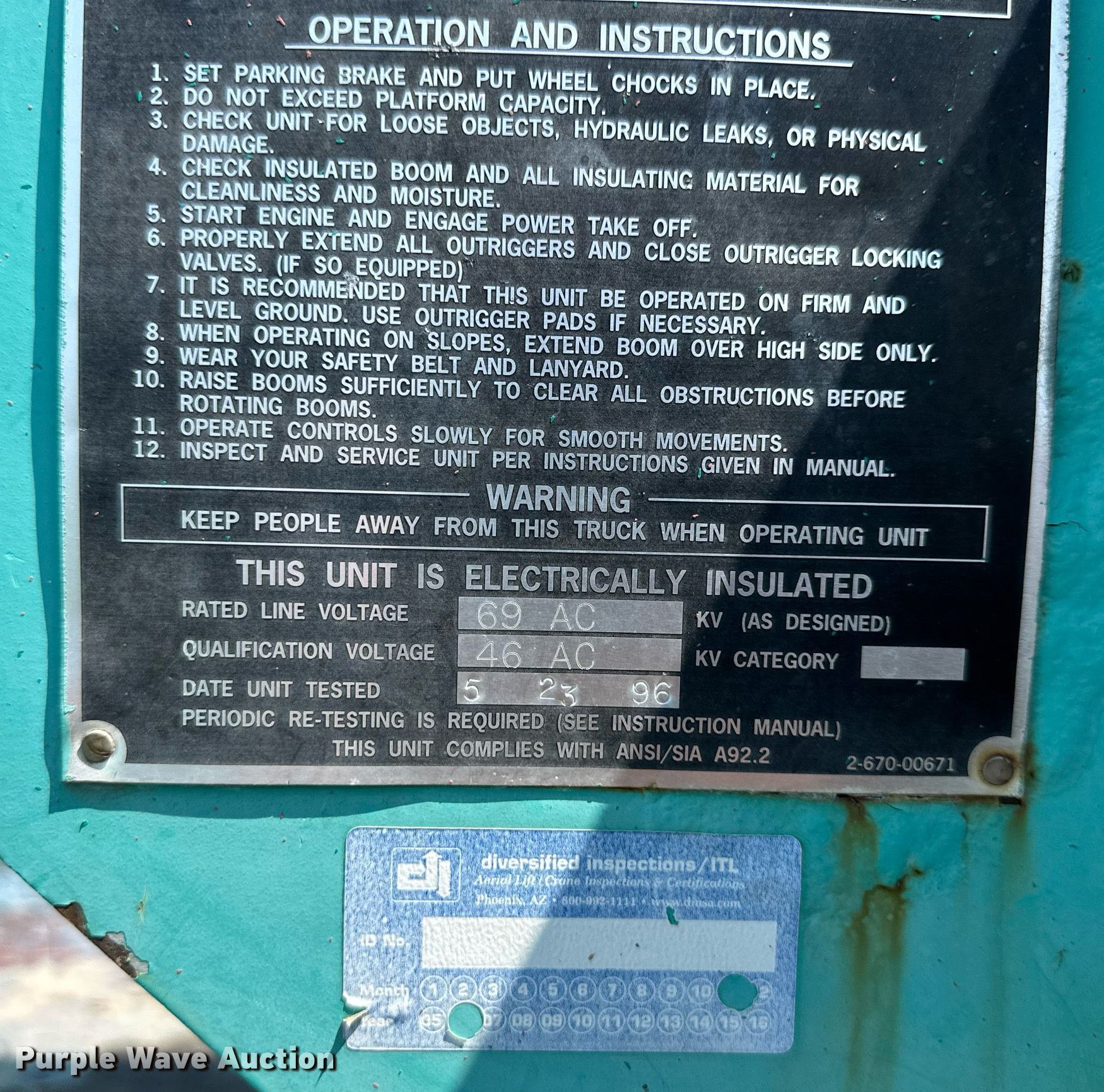1996 International 4700 bucket truck. Miles: 102,230 on odometer, Hours: 15,435 on meter, VIN: 1HTSCAAN8TH285121. Engine International DT466, Displacement: 7.6L, Cylinders: 6, Fuel type: Diesel. Transmission Automatic. Chassis Axles: Single, Suspension: Spring, Brakes: Air, PTO. Interior Heat, Cruise control, Brake controller. Features Bed 11' 4" L x 102" W, Boom Altec LB650A, Boom length: 25', Maximum lift capacity: 350 lbs, Maximum lift height: 50', Boom type: Articulating, Man basket, Boom controls Ground, Platform/ basket.. Tires Size: 11R22.5. Missouri title. Title distribution may be delayed up to 14 days from verification of funds. Saw Tree Service. 4530 Kelsey Road Southeast. Saint Joseph, MO 64507