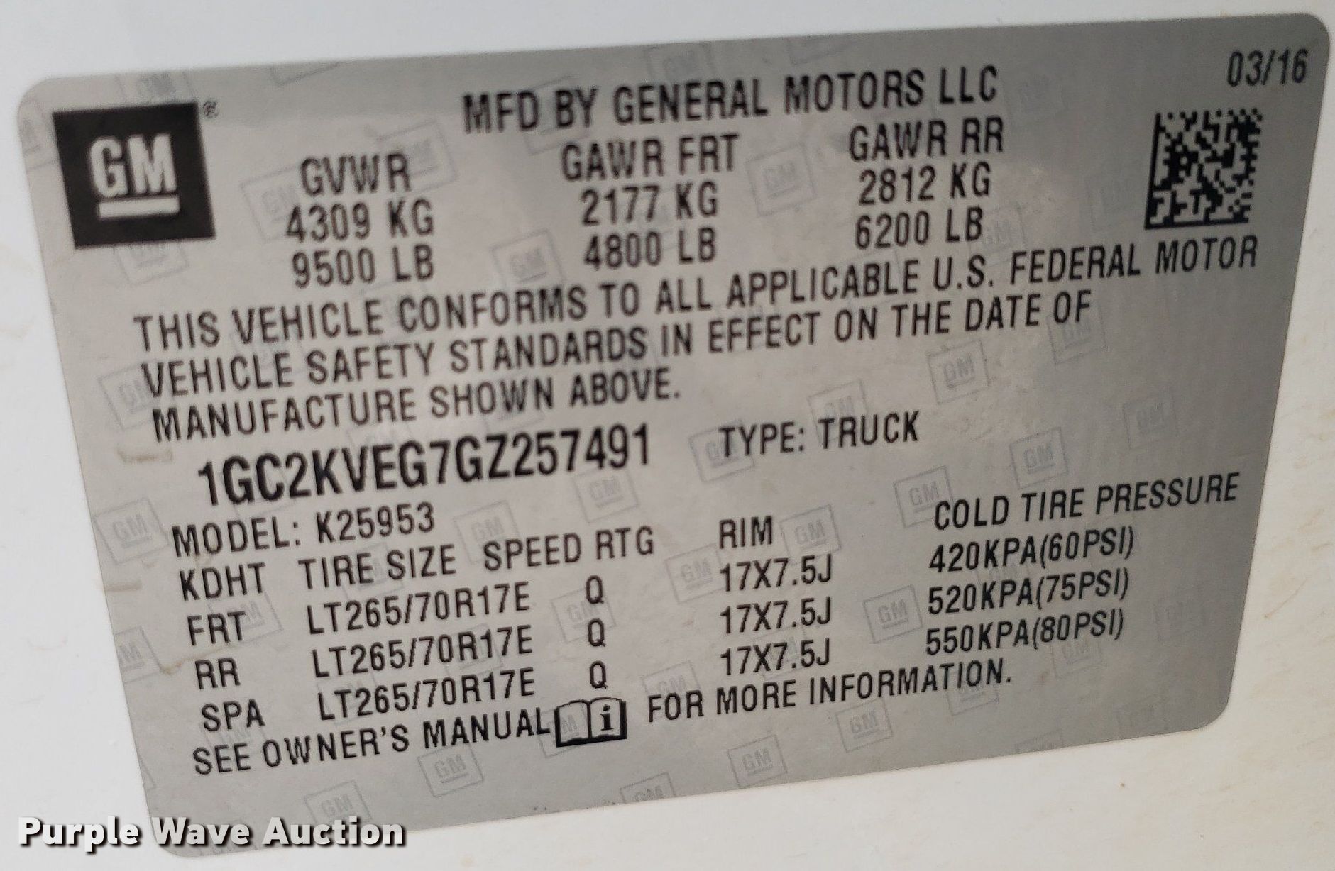 2016 Chevrolet Silverado 2500HD Double Cab pickup truck. Miles: 191,373 on odometer, VIN: 1GC2KVEG7GZ257491. Engine Displacement: 6.0L V8 OHV, Cylinders: 8, Fuel type: Gas. Transmission Automatic, Four wheel drive. Interior AC, Heat, Heated mirrors, Power windows, Power locks, Cruise control, Backup camera. Tires Size: 265/70R17. Notes Dash warning indicator: TPMS. Kansas title. Title distribution may be delayed up to 14 days from verification of funds. KanOkla Networks. 100 Kanokla Ave. Caldwell, KS 67022