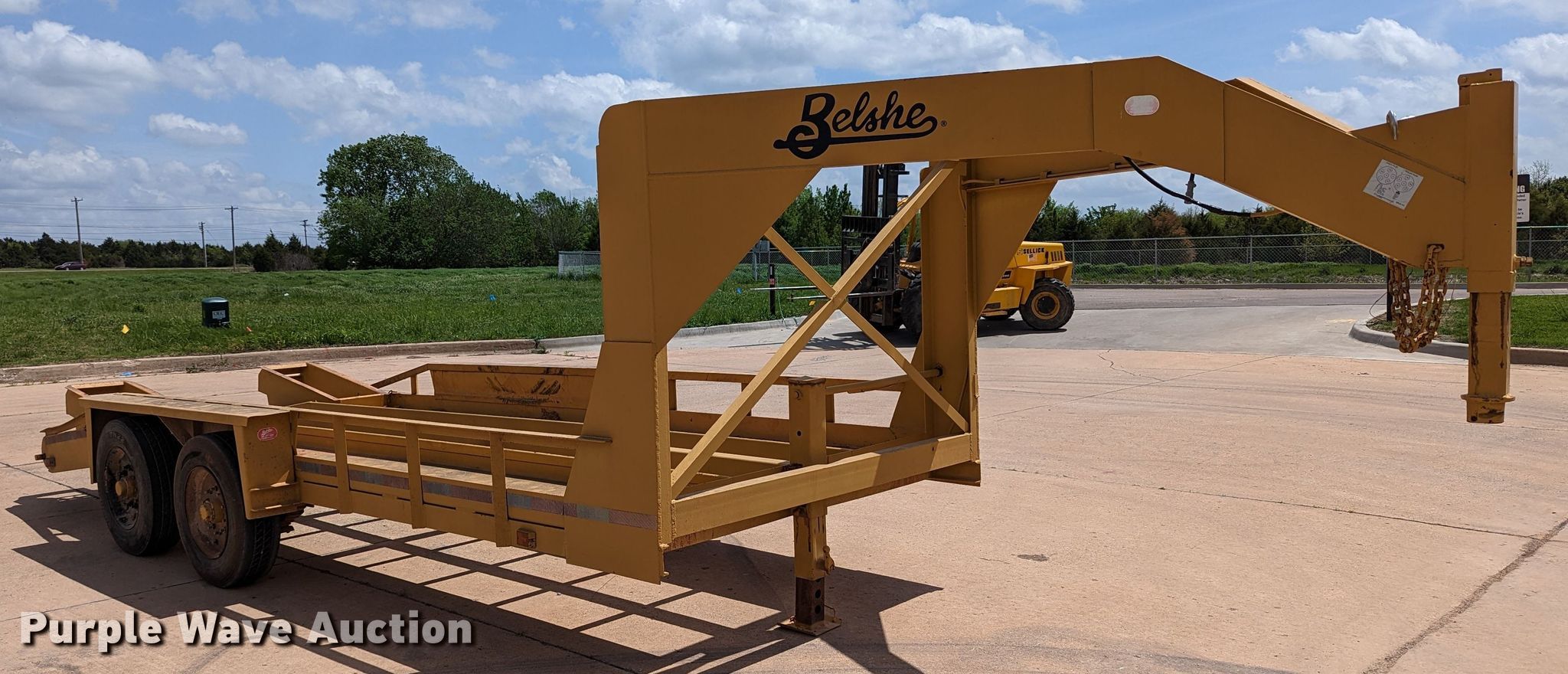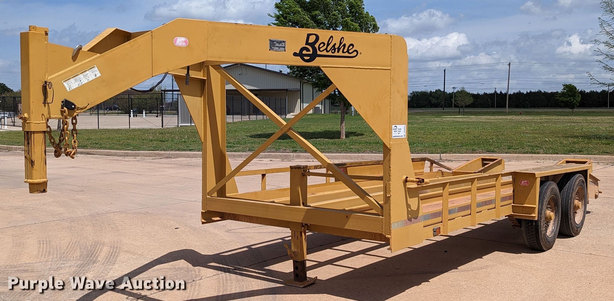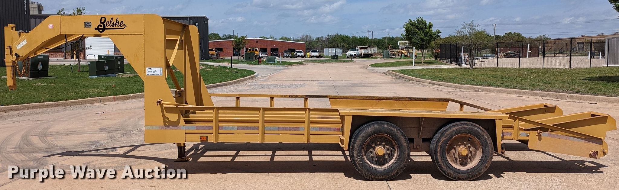 1997 Belshe T-18 equipment trailer. VIN: 16JF01629V1030369. Dimensions Overall: 28' L x 102" W, Deck: 16' L x 82" W, Tail length: 3', Ramps: Manual Length: 48". Features Deck type: Steel. Chassis Hitch: Gooseneck, Landing gear: Single, Suspension: Spring, Brakes: Electric, Axles: Tandem, GVWR: 18,000 lbs, GAWR: 9,000 lbs. Tires Steel wheels, Size: 215/75R17.5. Oklahoma title. Title distribution may be delayed up to 14 days from verification of funds. 4204 Classen Cir. Norman, OK 73071