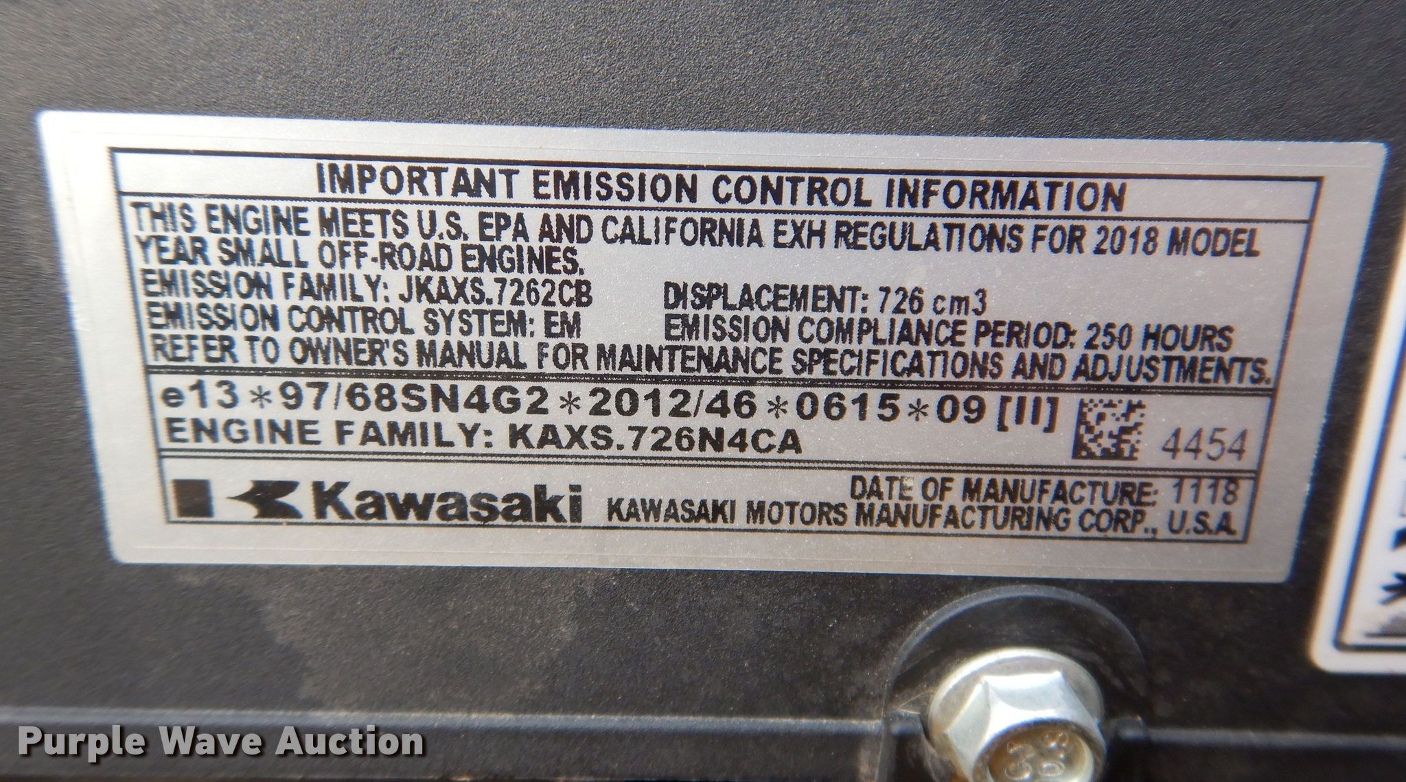 2019 Hustler FasTrak ZTR lawn mower. Hours: 325 on meter, Cutting width: 54", Serial: 18120981. Engine Kawasaki FR691V, Serial: FR691VG76246, Displacement: 726 cc, Cylinders: 2, Fuel type: Gas, HP: 23. Transmission Hydrostatic. Operators station OROPS. Features Rear discharge. Tires Front: 13x6.5-6NHS, Rear: 22x11-10NHS. Cannon Sales & Service. 1004 W. South St. Mount Ayr, IA 50854