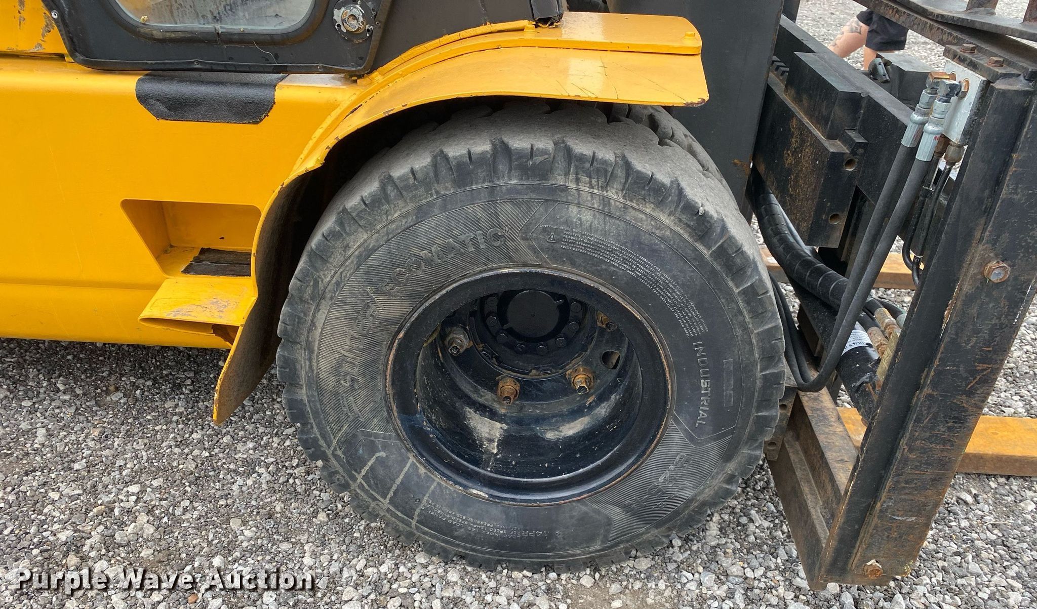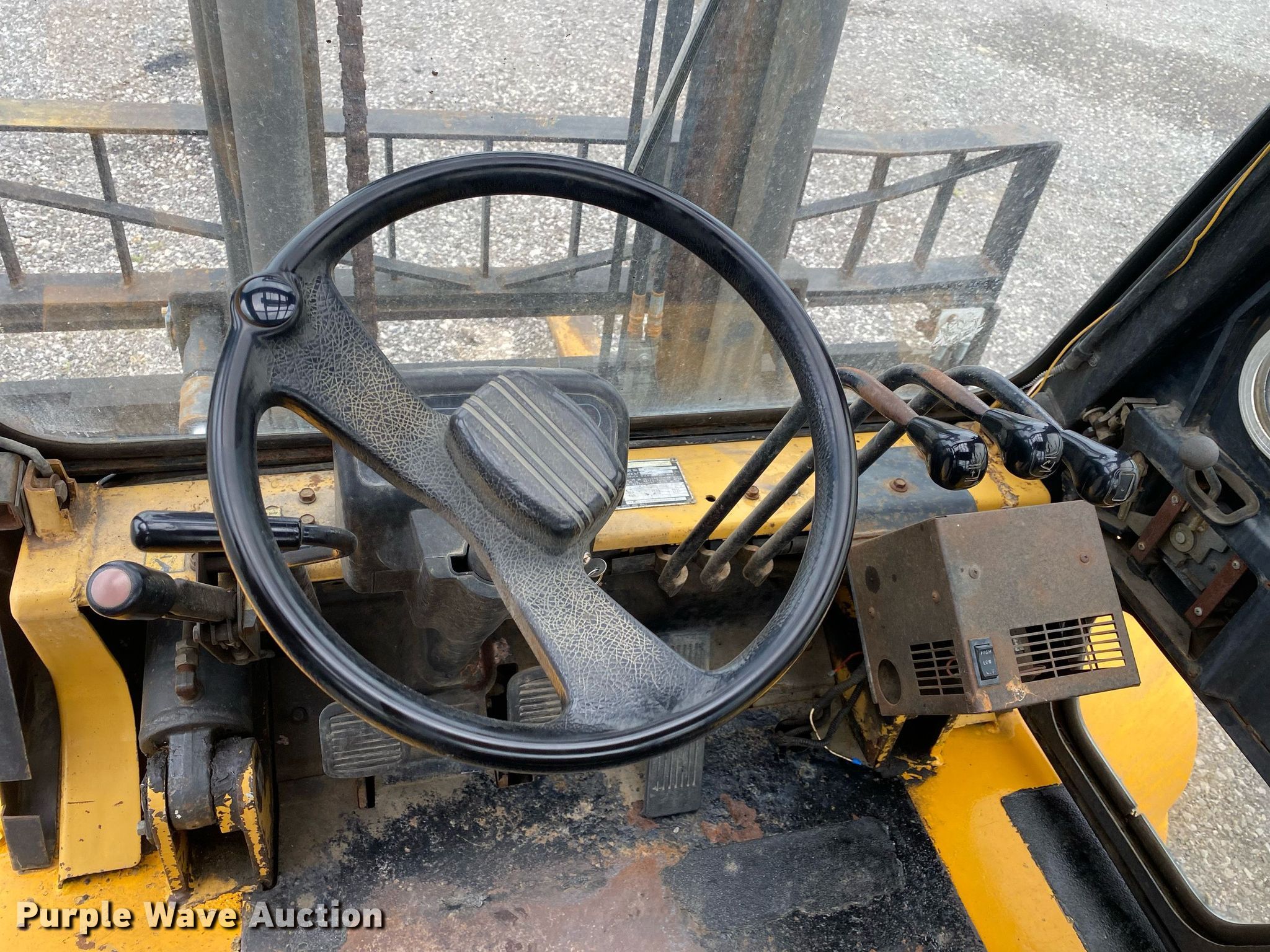1999 Caterpillar DP50 forklift. Hours: 4,632 on meter, Serial: 6CM10716. Engine Cylinders: 6, Fuel type: Diesel. Transmission Powershift. Operators station Enclosed cab, Heat. Features Maximum lift capacity: 9,570 lbs, Maximum lift height: 159", Mast stages: 2, Side shift, Mast tilt, Fork length: 59". Tires Front: 8.25-15, Rear: 7.00-12. 15107 North 137th East Avenue. Collinsville, OK 74021