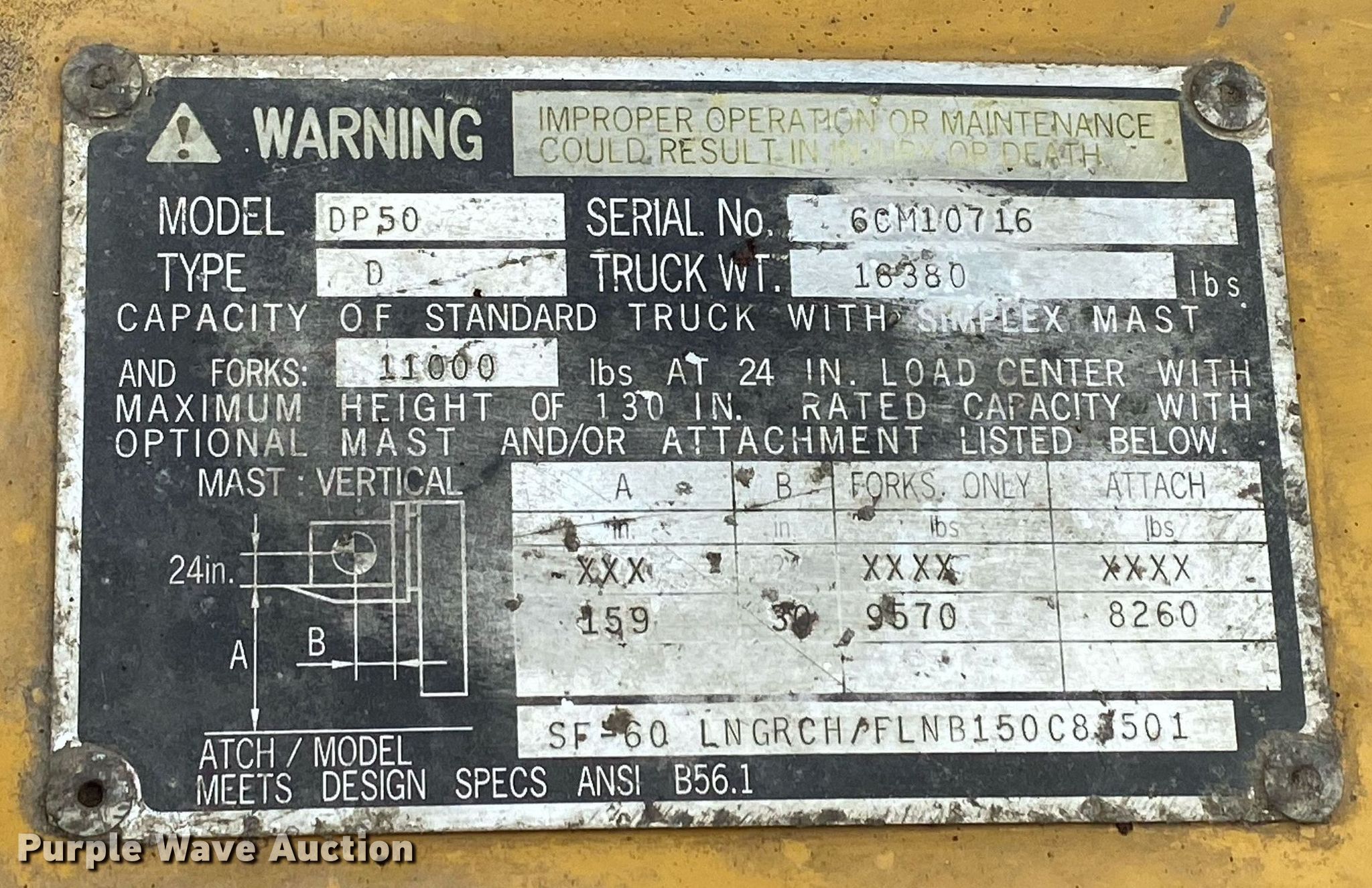 Purple Wave is selling a used Strt. Mast Rough Terr. Forklift in Oklahoma. This item is a 1999 Caterpillar DP50 forklift with the following: Hours: 4,632 on meter, Serial: 6CM10716