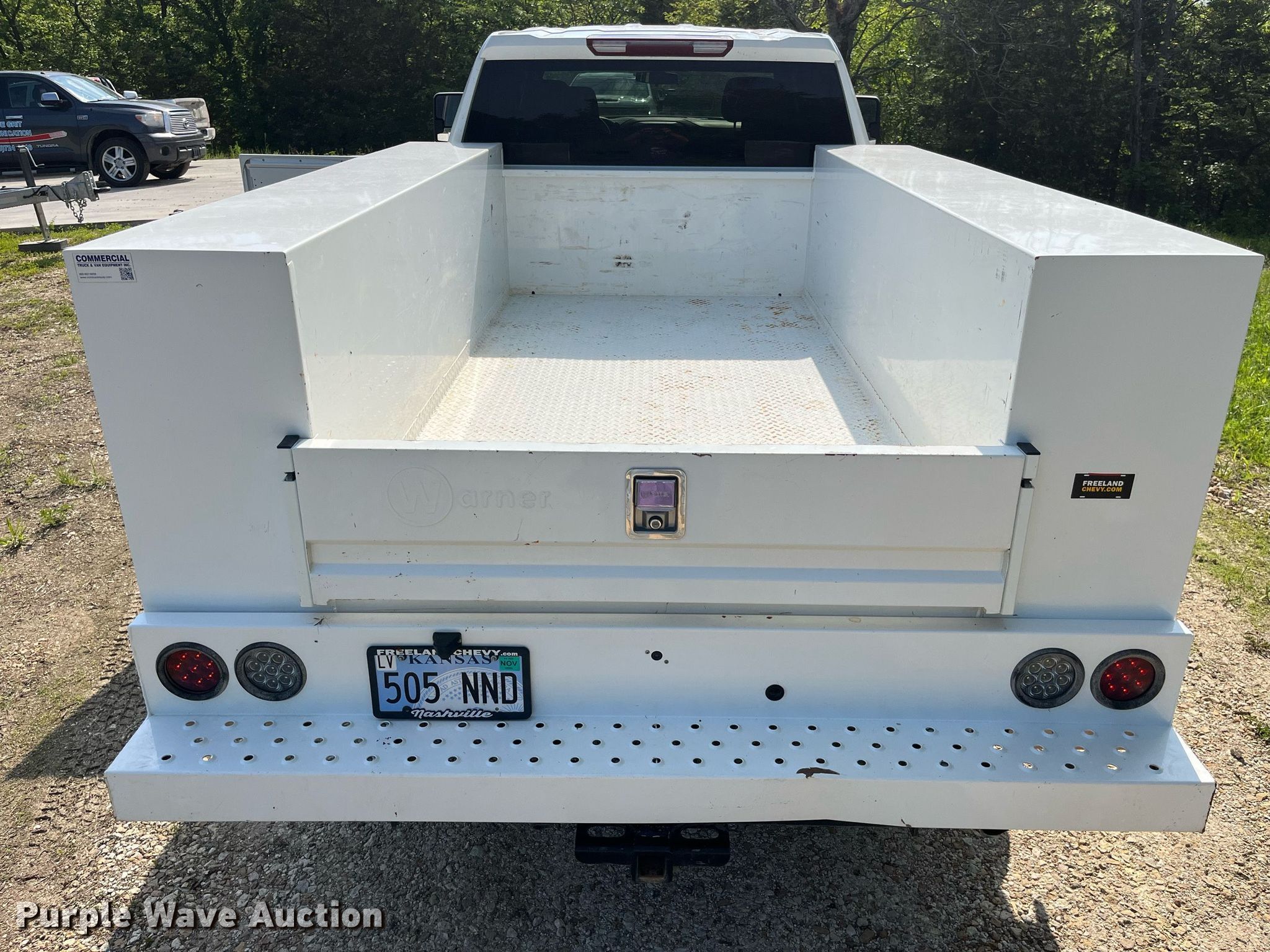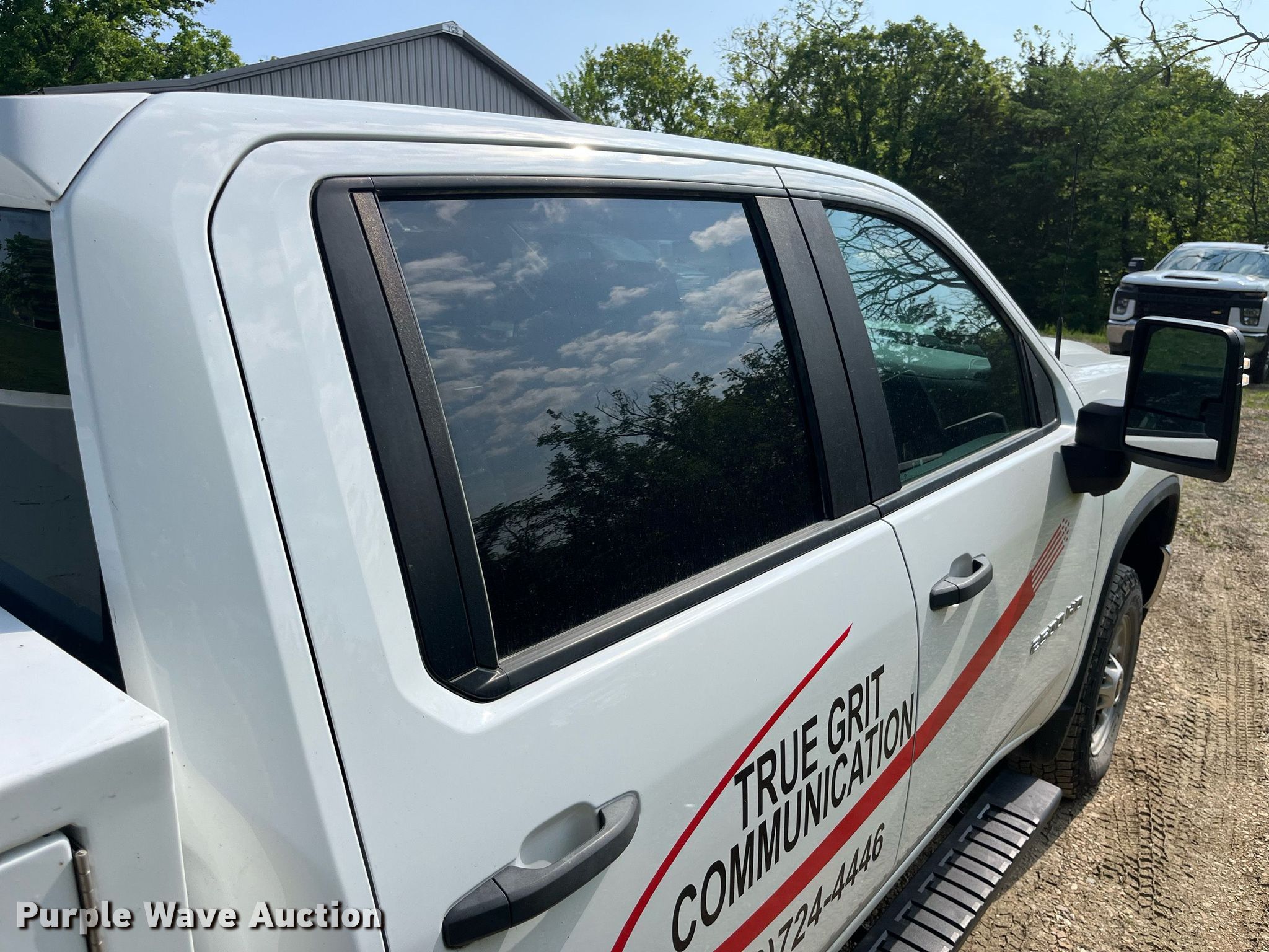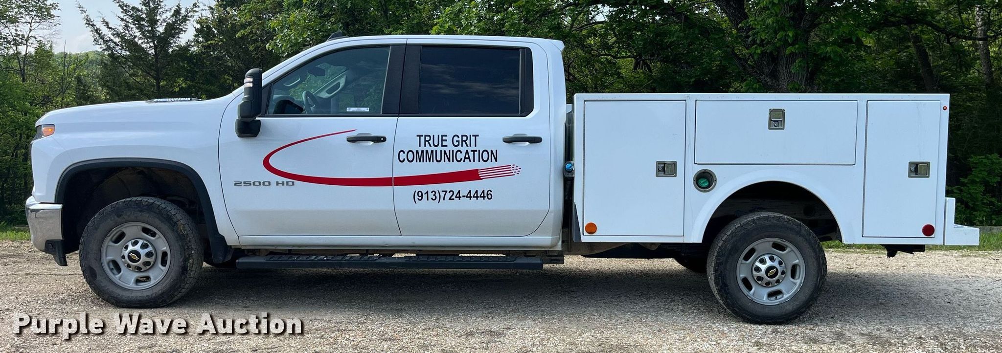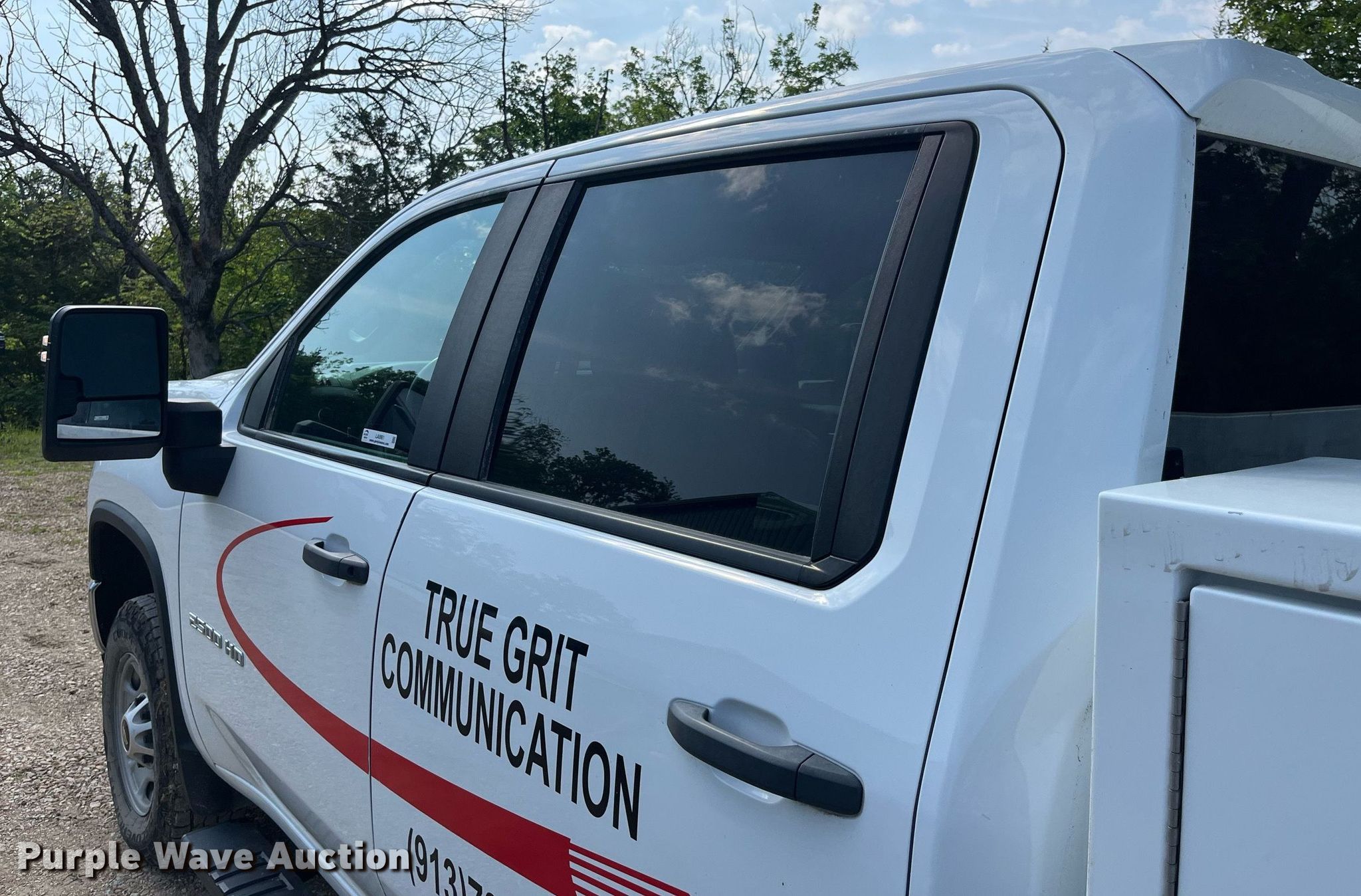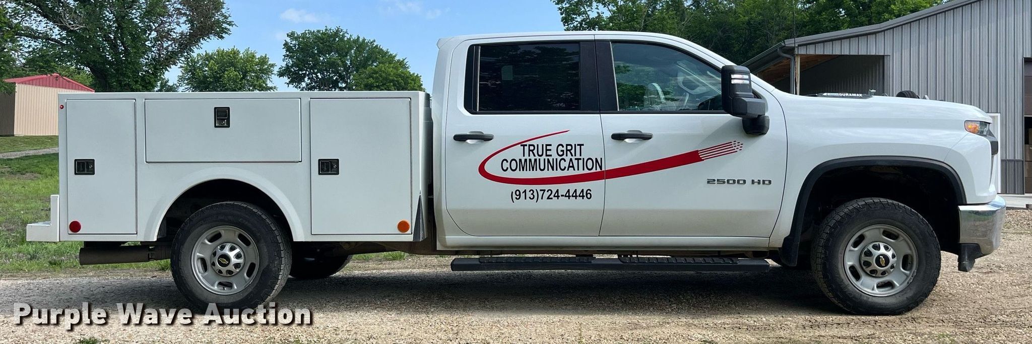 2020 Chevrolet Silverado 2500HD Crew Cab utility bed pickup truck. Miles: 76,033 on odometer, VIN: 1GC1YLEY5LF266578. Engine Displacement: 6.6L V8 OHV, Cylinders: 6, Fuel type: Diesel. Transmission Automatic, Four wheel drive. Interior AC, Heat, Power windows, Power locks, Cruise control, Backup camera. Features Utility bed Warner, 8'2" L x 78.5" W. Tires Size: 245/75R17. Notes Dash warning indicator: TPMS, Windshield chipped or cracked, Unknown operating condition of trailer wiring plug. Kansas title. Title distribution may be delayed up to 14 days from verification of funds. True Grit Communications. 17200 Abby Lane. Tonganoxie, KS 66086