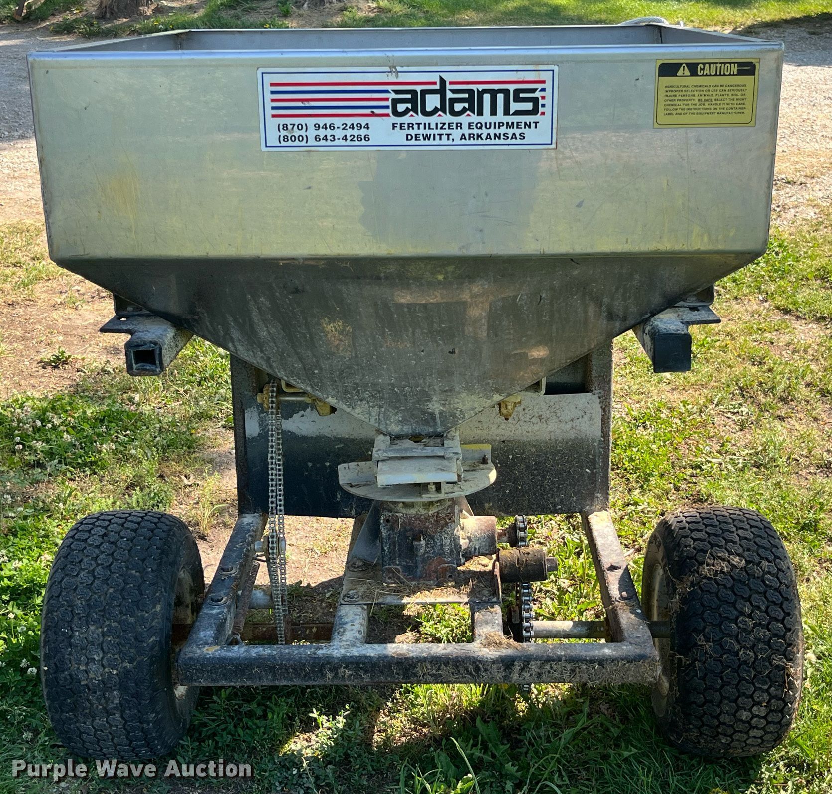 Adams spreader. Features. Hopper: 3' x 3' Type: Aluminum, Spinner. Tires Size: 18x8.50-8. Mosswood Meadows Golf Course. 1315 Lakeview Dr. Monroe City, MO 63456
