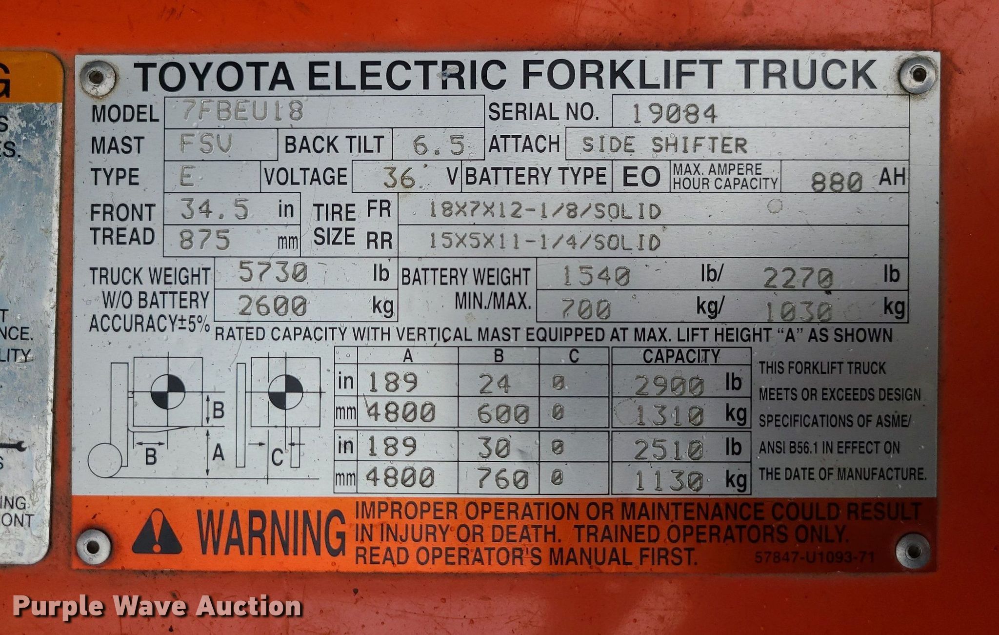 Toyota 7FBEU18 forklift. Hours: 1,954 on meter, Serial: 19084. Electric Motor Volts: 36, Charger: Three phase. Operators station Canopy. Features Maximum lift capacity: 2,900 lbs, Maximum lift height: 189", Side shift, Mast tilt, Fork length: 42". Tires Solid. Anchor Sales & Service. 106 West 31st Street. Independence, MO 64055