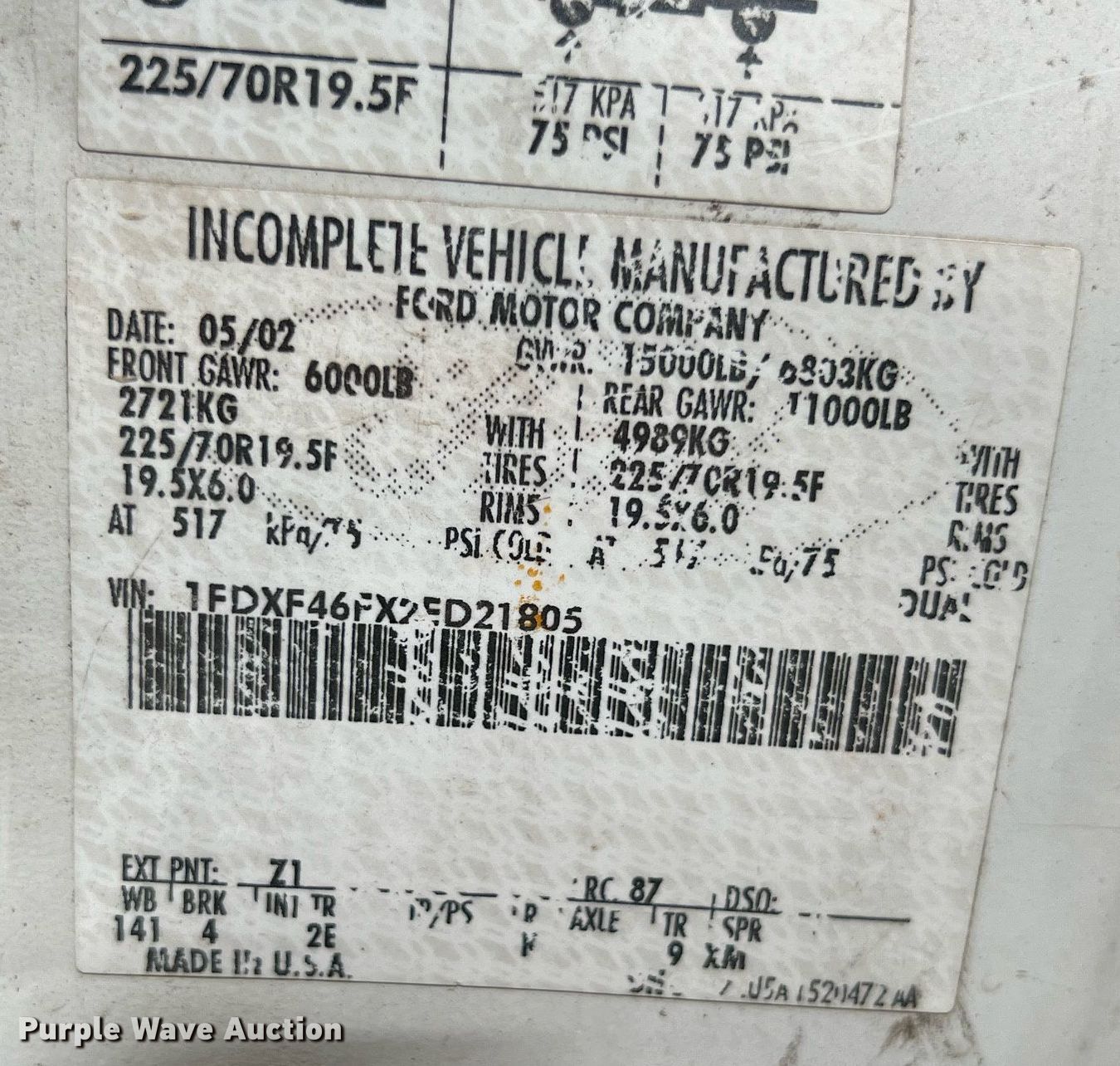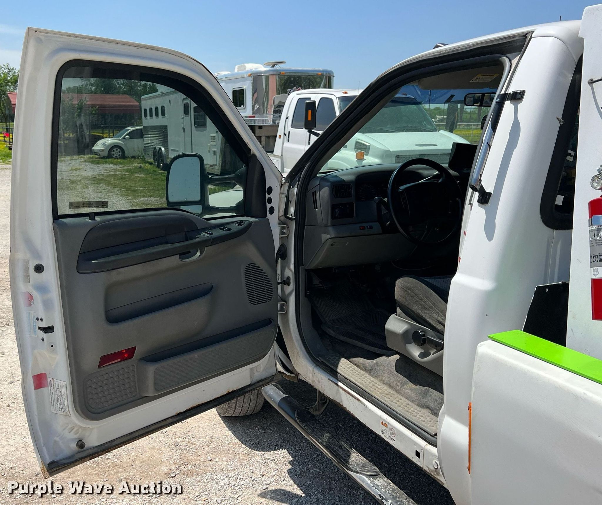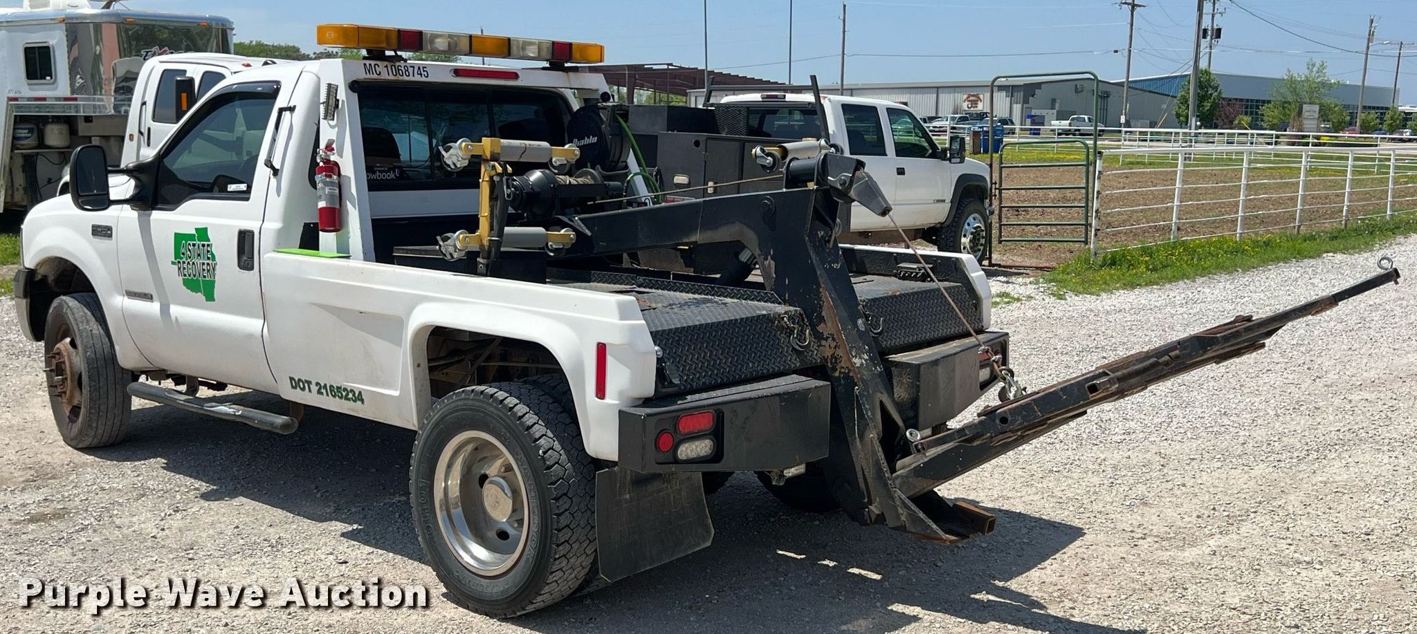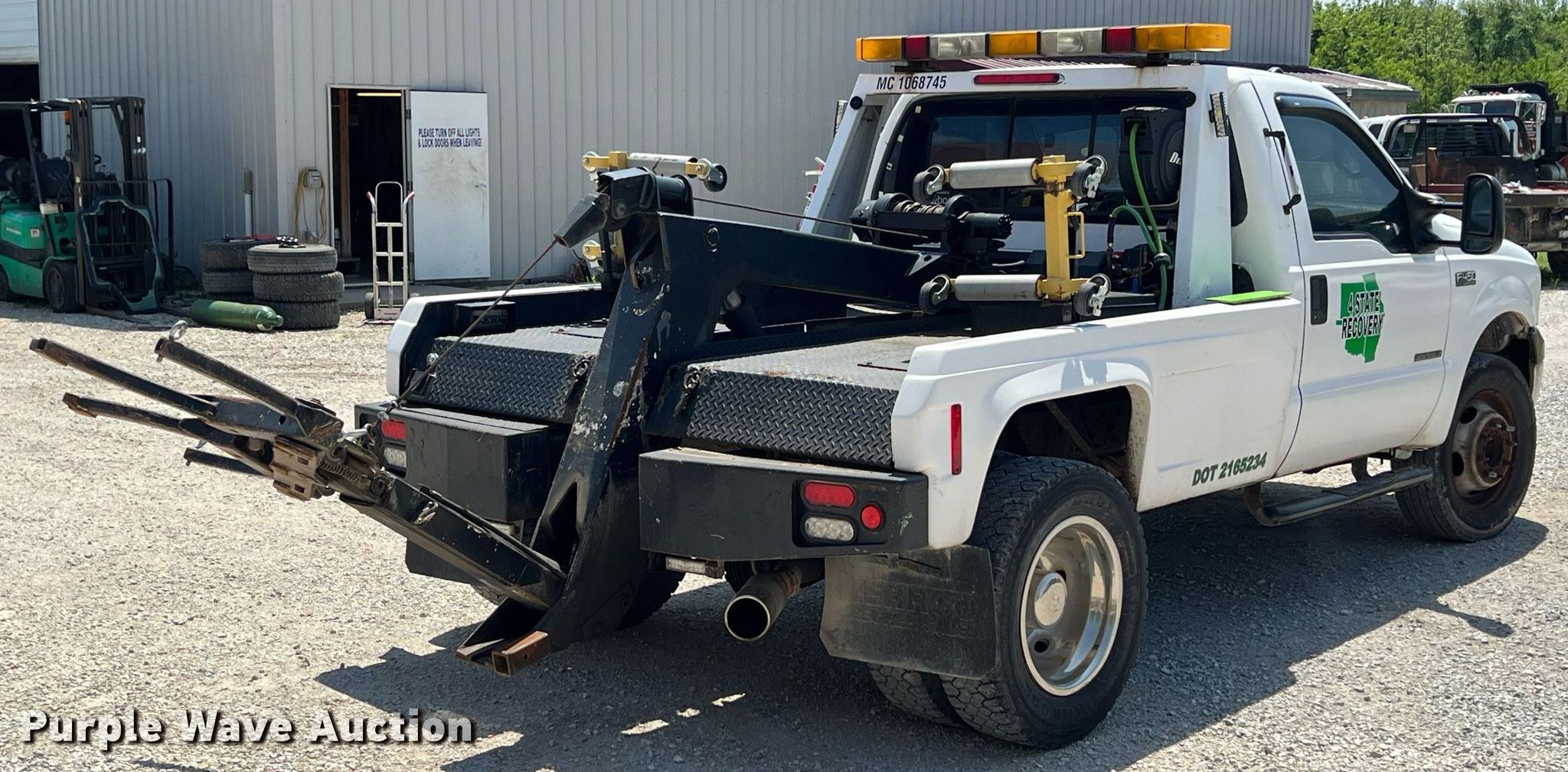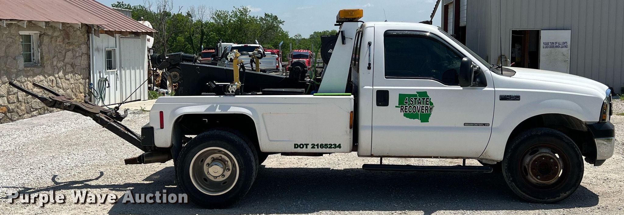 2002 Ford F450 Super Duty tow truck. Miles: 230,048 on odometer, VIN: 1FDXF46FX2ED21805. Engine Displacement: 7.3L, Cylinders: 8, Fuel type: Diesel. Transmission Automatic. Chassis Axles: Single, Suspension: Spring, Brakes: Hydraulic, GVWR: 15,000 lbs. Interior AC, Heat, Power windows, Power locks, Cruise control, Auxiliary controls. Features Wrecker bed 7' 6" L x 7' 4" W, Wrecker boom: Hydraulic extendable, Winch. Tires Size: 245/70R19.5. Missouri title. Title distribution may be delayed up to 14 days from verification of funds. Quarles Const LLC. 1315 South Hall Street. Webb City, MO 64870