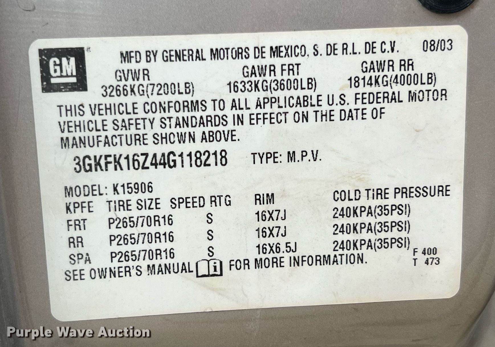 Purple Wave is selling a used Passenger Vehicle in Kansas. This item is a 2004 GMC Yukon XL SUV with the following: Miles: 253,988 on odometer, VIN: 3GKFK16Z44G118218