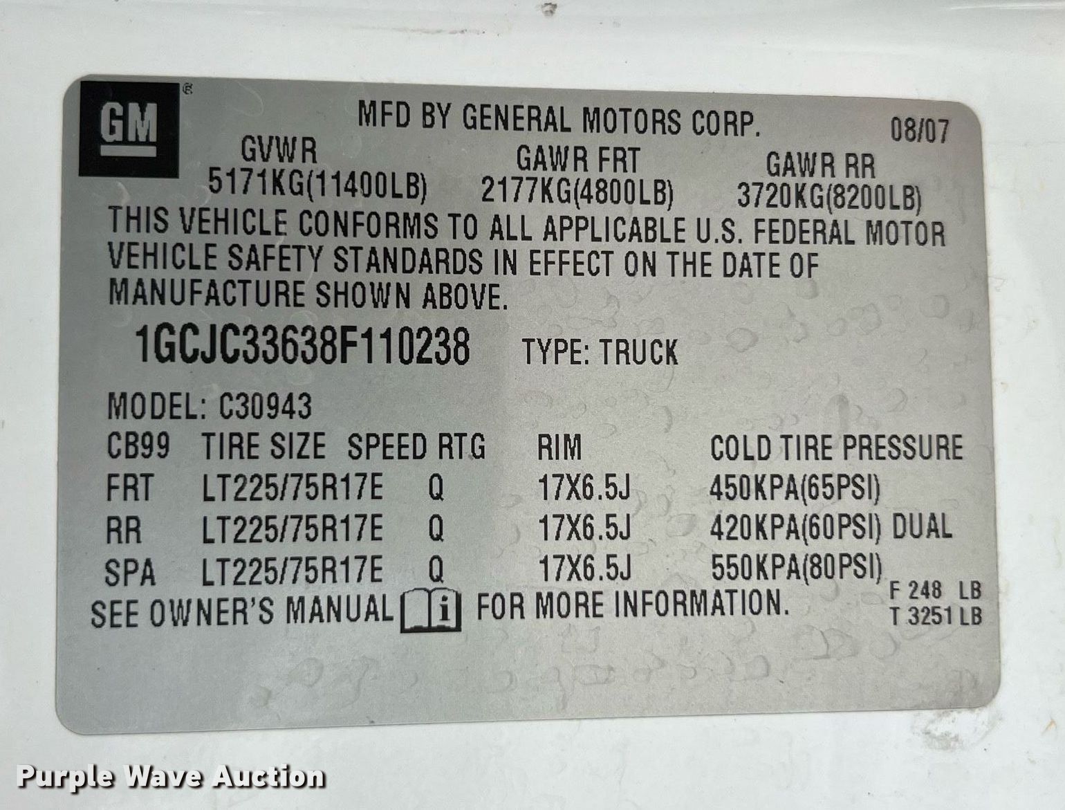 2008 Chevrolet Silverado 3500HD Crew Cab utility bed pickup truck. Miles: 216,442 on odometer, VIN: 1GCJC33638F110238. Engine Displacement: 6.6L V8 OHV, Cylinders: 8, Fuel type: Diesel. Transmission Automatic. Interior AC, Heat, Power locks. Features Utility bed 8' L x 7' 10" W. Tires Size: LT225/75R17. Notes Dead battery. Arkansas title. Title distribution may be delayed up to 14 days from verification of funds. Nabholz Inc.. 3301 N 2nd St. Rogers, AR 72756