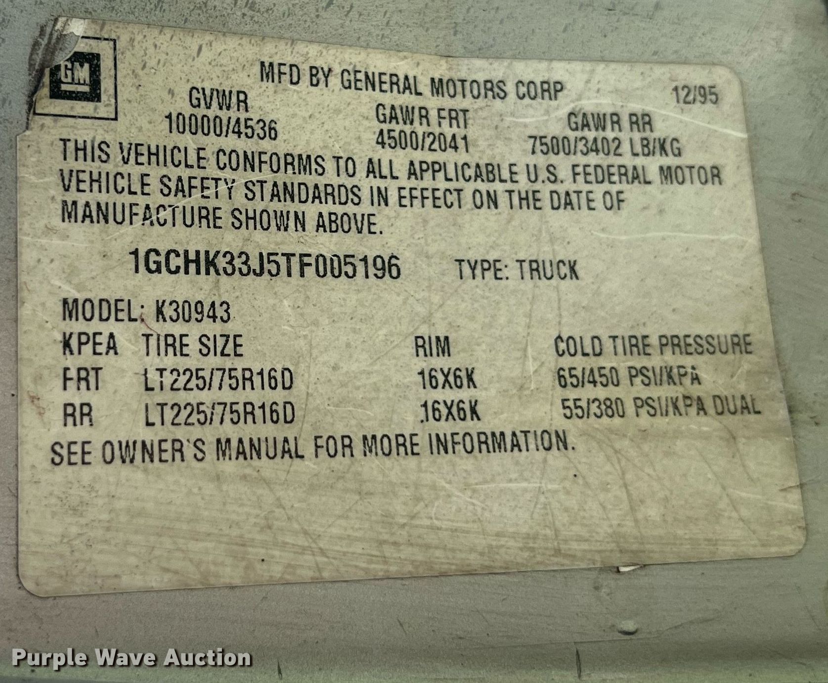 Purple Wave is selling a used 3/4 or 1 Ton Pickup or Van in Kansas. This item is a 1996 Chevrolet K3500 Crew Cab pickup truck with the following: Miles: 185,486 on odometer, Miles or hours may vary, unit still in use, VIN: 1GCHK33J5TF005196