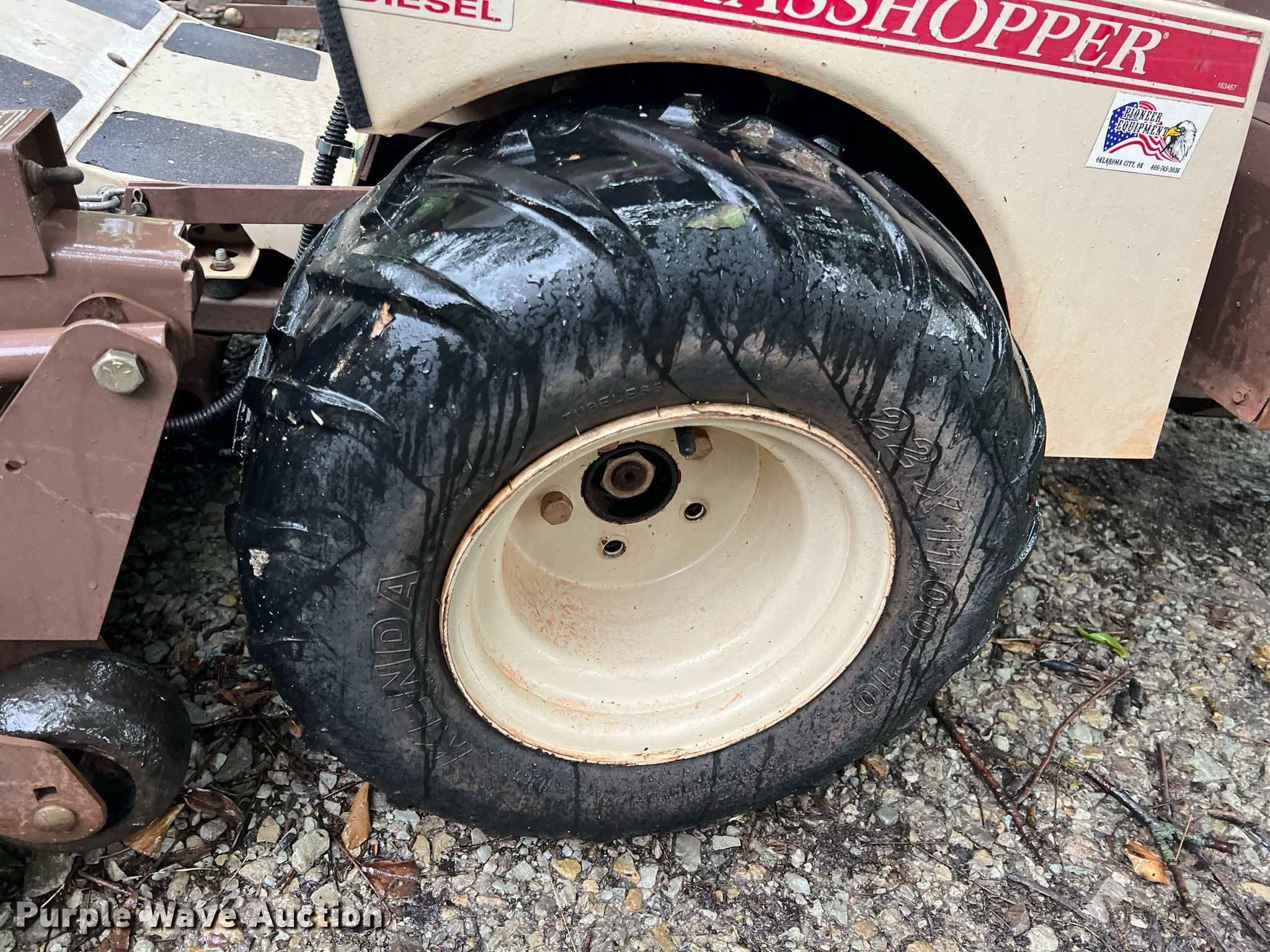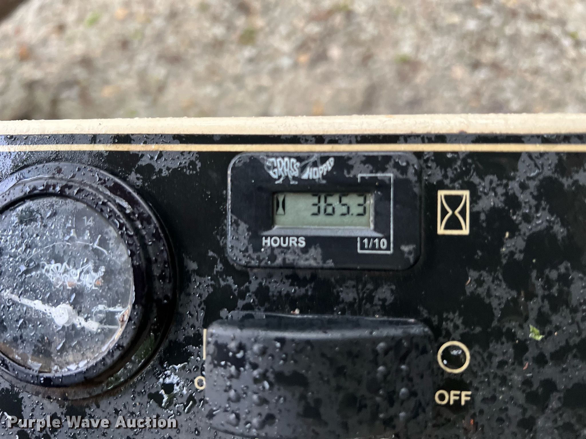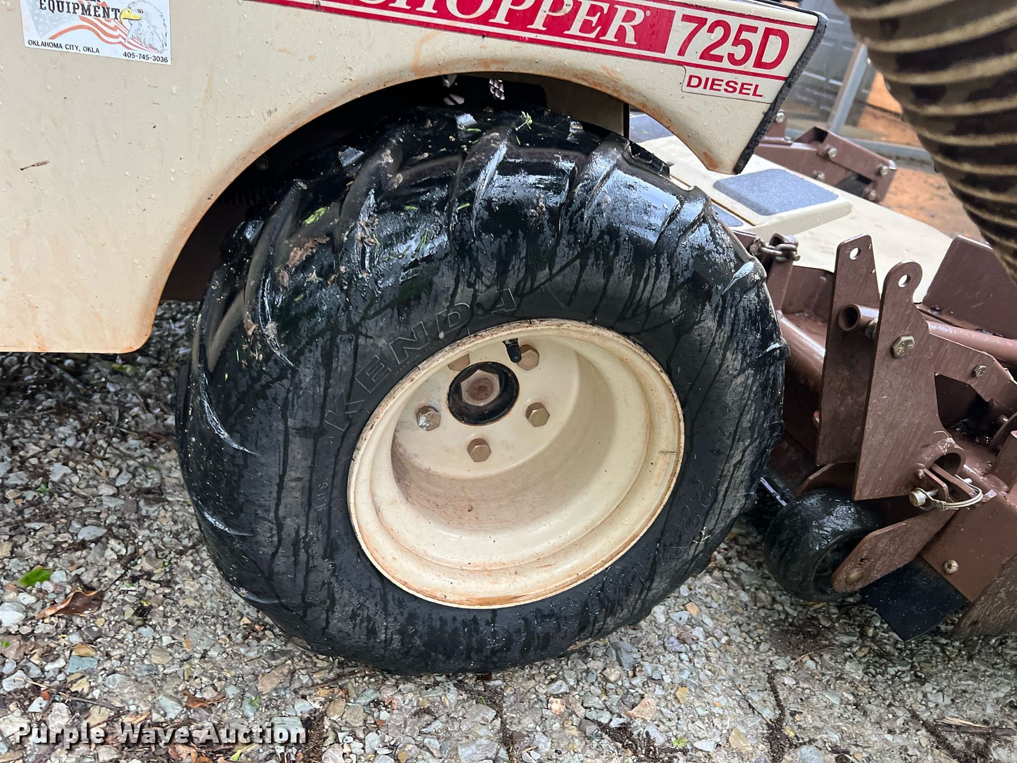 Grasshopper 725D ZTR lawn mower. Hours: 365 on meter, Cutting width: 61", Serial: 5915326. Engine Kubota, Cylinders: 3, Fuel type: Diesel. Transmission Hydrostatic. Features Grass bagger PowerVac 15B, Hydraulic fold decks, Hydraulic front deck lift. Tires Front: 22x11-10, Rear: 18x6.50-6. 419 North 3rd Street. Chetopa, KS 67336