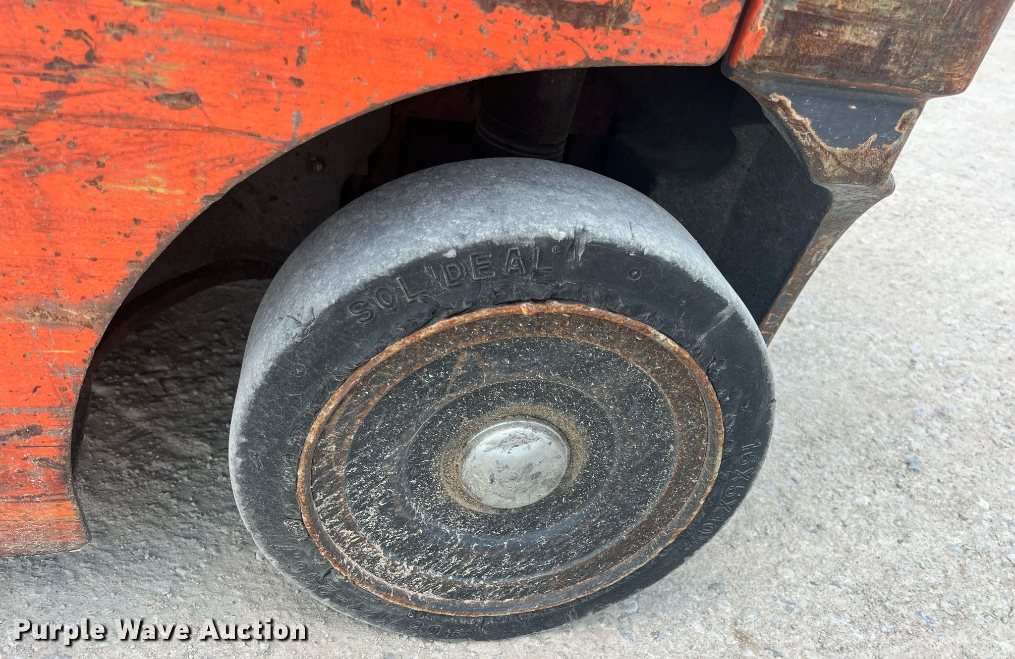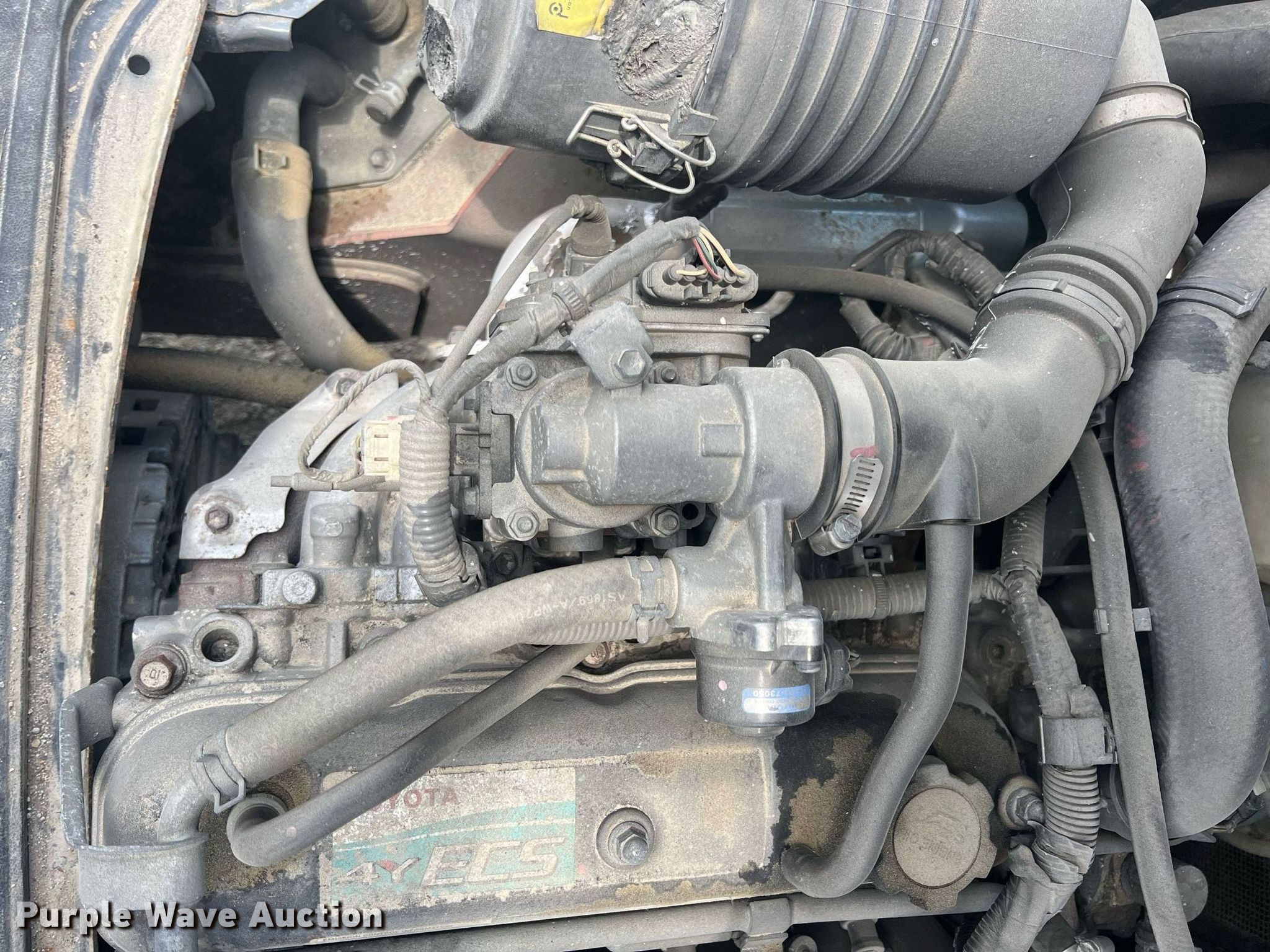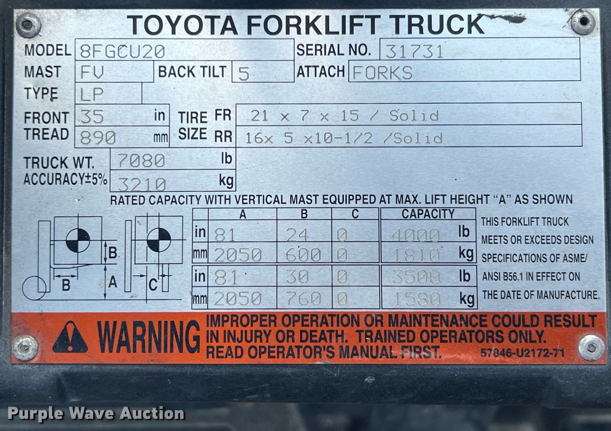 Toyota 8FGCU20 forklift. Hours: Unknown, Serial: 31731. Engine Toyota, Cylinders: 4, Fuel type: LPG LP bottle: Not included. Transmission Powershift. Operators station Canopy. Features Maximum lift capacity: 4,000 lbs, Maximum lift height: 81", Mast stages: 2, Mast tilt, Fork length: 40". Tires Front: 21x7x15, Rear: 16x5x10.5, Solid. Notes Dead battery. The Rental Station. 2029 S Santa Fe Ave. Chanute, KS 66720