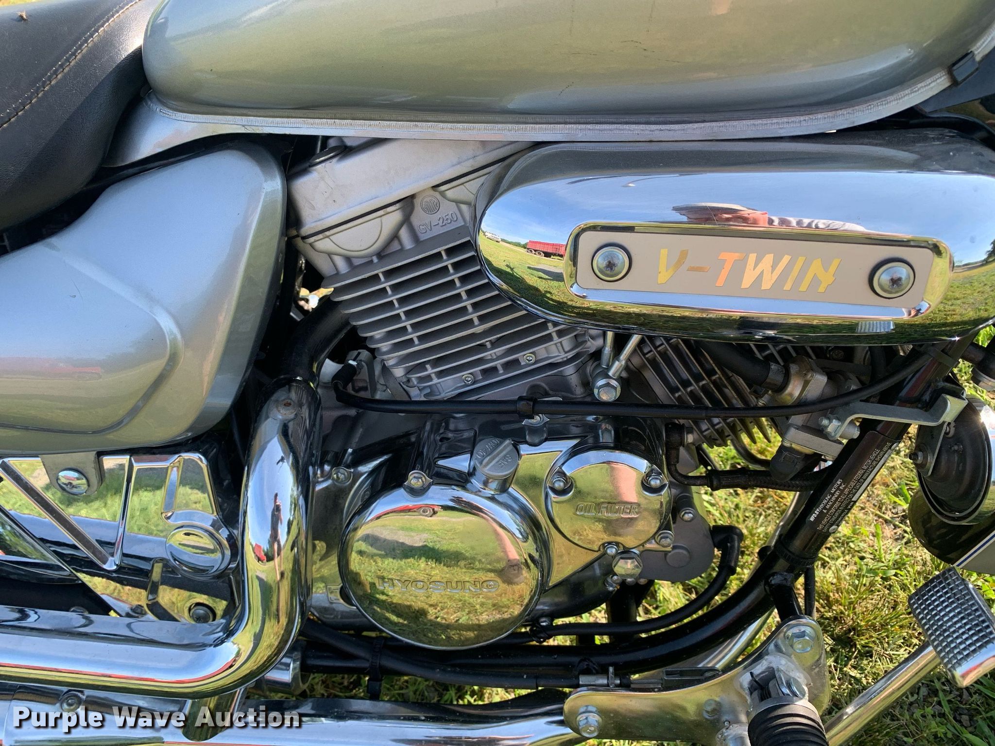 2009 Hyosung GV250 motorcycle. Miles: 3,912 on odometer, VIN: KM4MJ525691216878. Engine Hyosung V-twin 250, Displacement: 249 cc, Cylinders: 2, Fuel type: Gas. Transmission Manual, Speed: 5. Tires Front: 110/90-16, Rear: 150/80-15. Arkansas title. Title distribution may be delayed up to 14 days from verification of funds. Stover Farms. 530 State Highway 287. Morrilton, AR 72110
