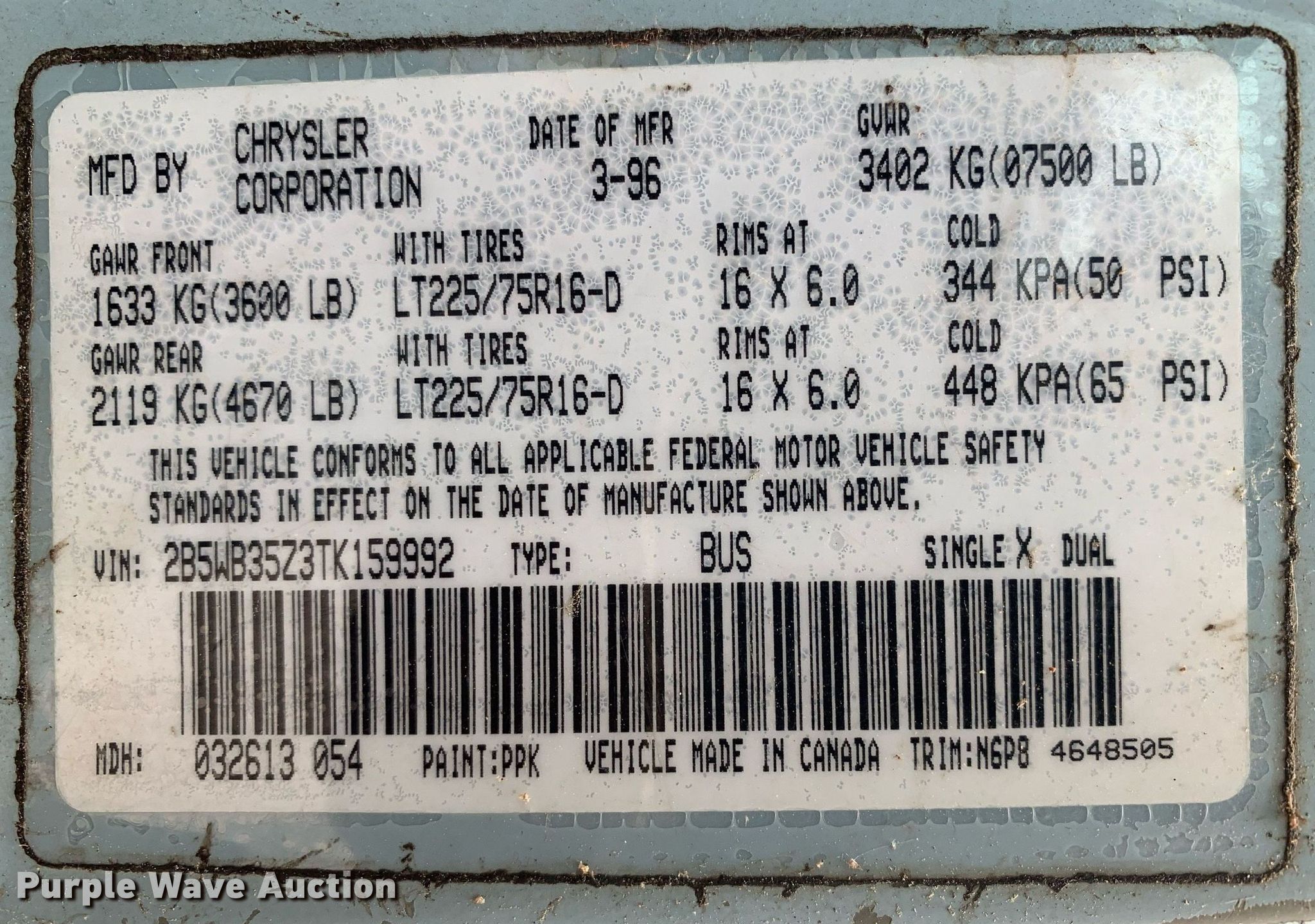 Purple Wave is selling a used 3/4 or 1 Ton Pickup or Van in Texas. This item is a 1996 Dodge Ram 3500 van with the following: Miles: 158,607 on odometer, VIN: 2B5WB35Z3TK159992, Unit #: TS-16