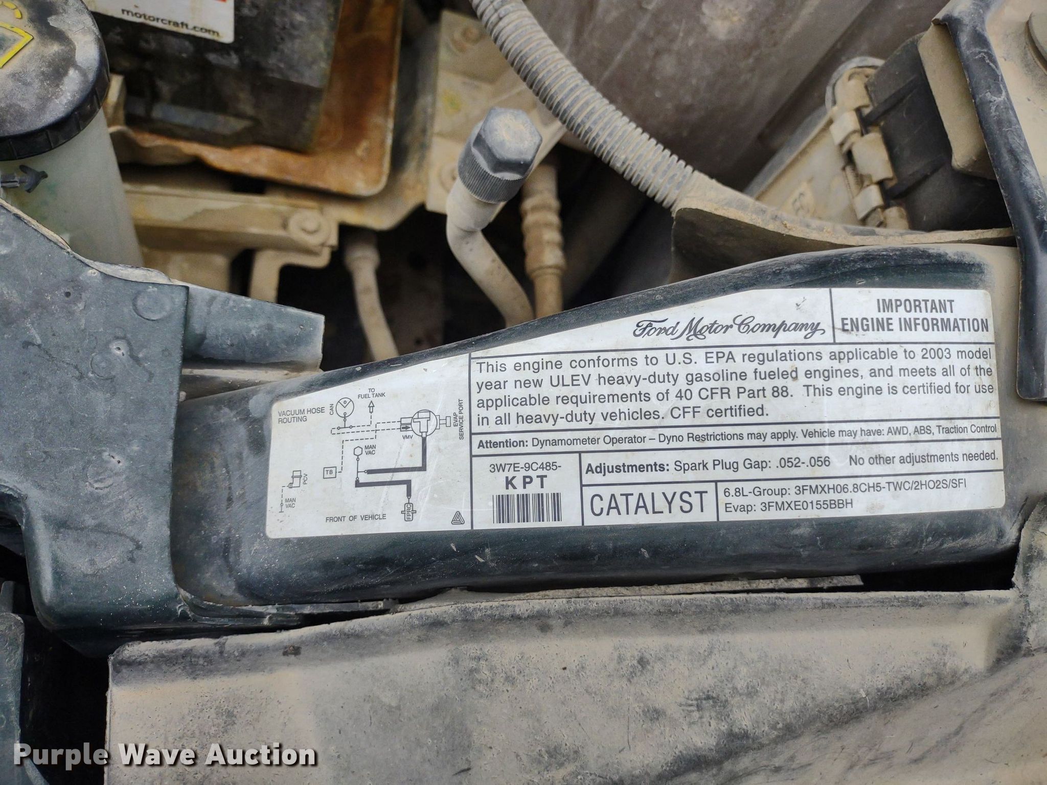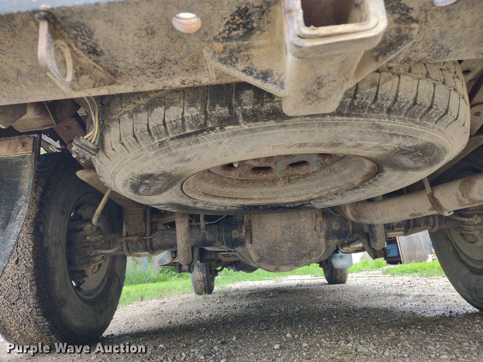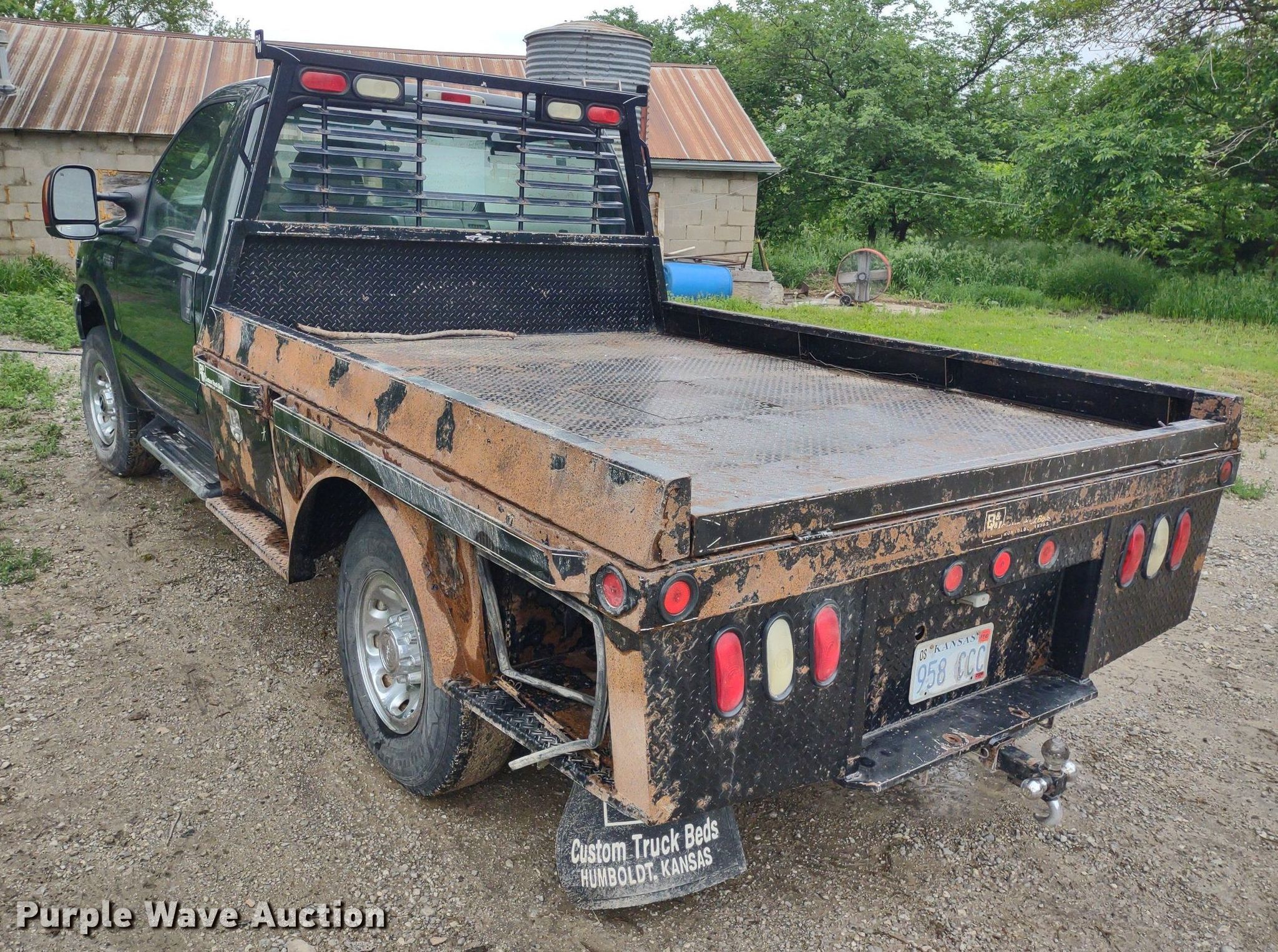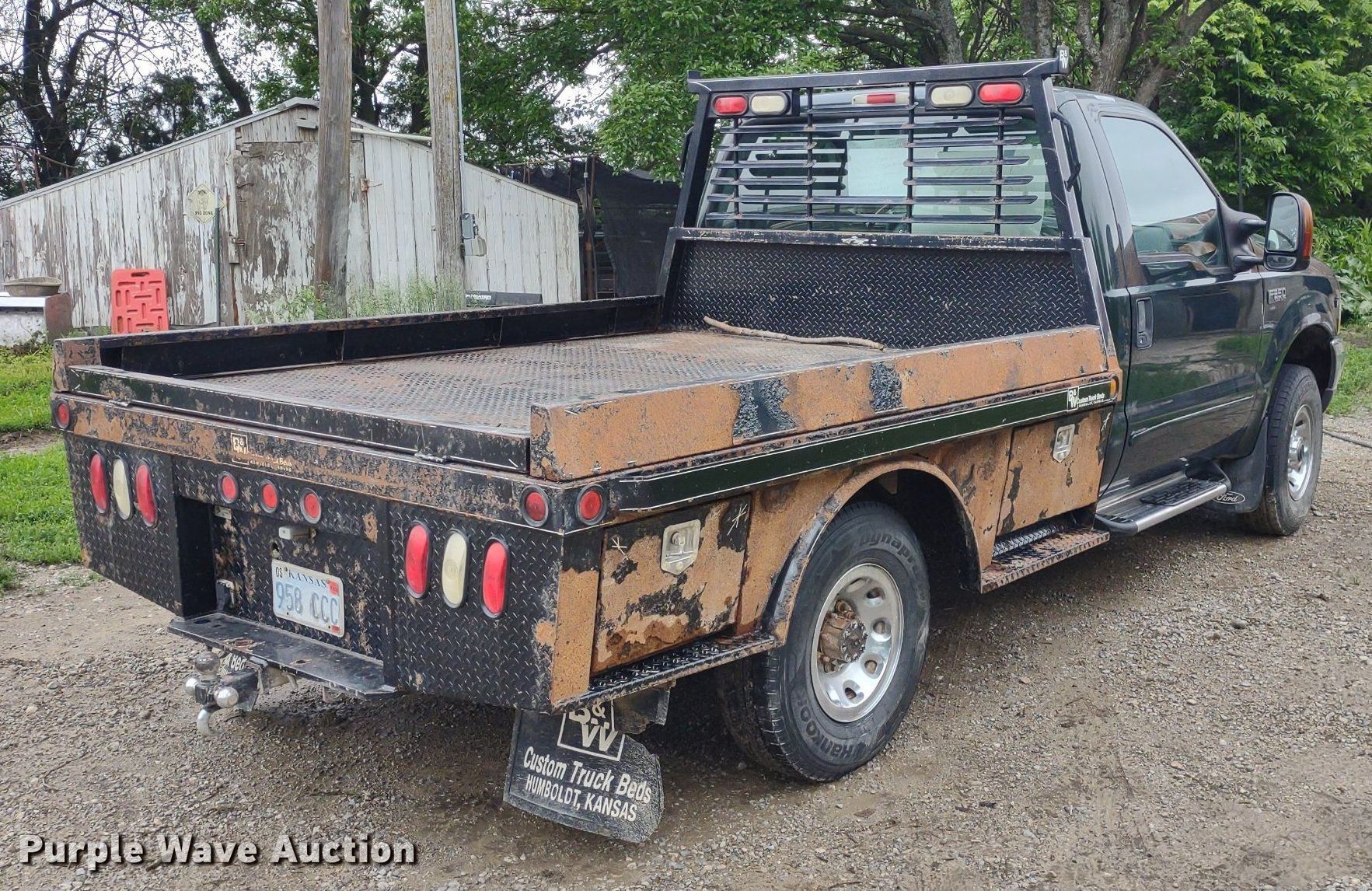 2003 Ford F250 Super Duty XL flatbed pickup truck. Miles: 172,795 on odometer, Miles or hours may vary, unit still in use, VIN: 3FTNF21SX3MB37786. Engine Displacement: 6.8L V10 SOHC, Cylinders: 10, Fuel type: Gas. Transmission Automatic, Four wheel drive. Interior AC, Heat, Heated mirrors, Power windows, Power locks, Cruise control. Features Flatbed B&W Custom Truck Beds, 8' 6" L x 7' 4" W, Hitch: Gooseneck. Tires Size: 235/85R16. Size: 235/85R16. Kansas title. Title distribution may be delayed up to 14 days from verification of funds. Mike Bond. 20300 South Paulen Road. Overbrook, KS 66524