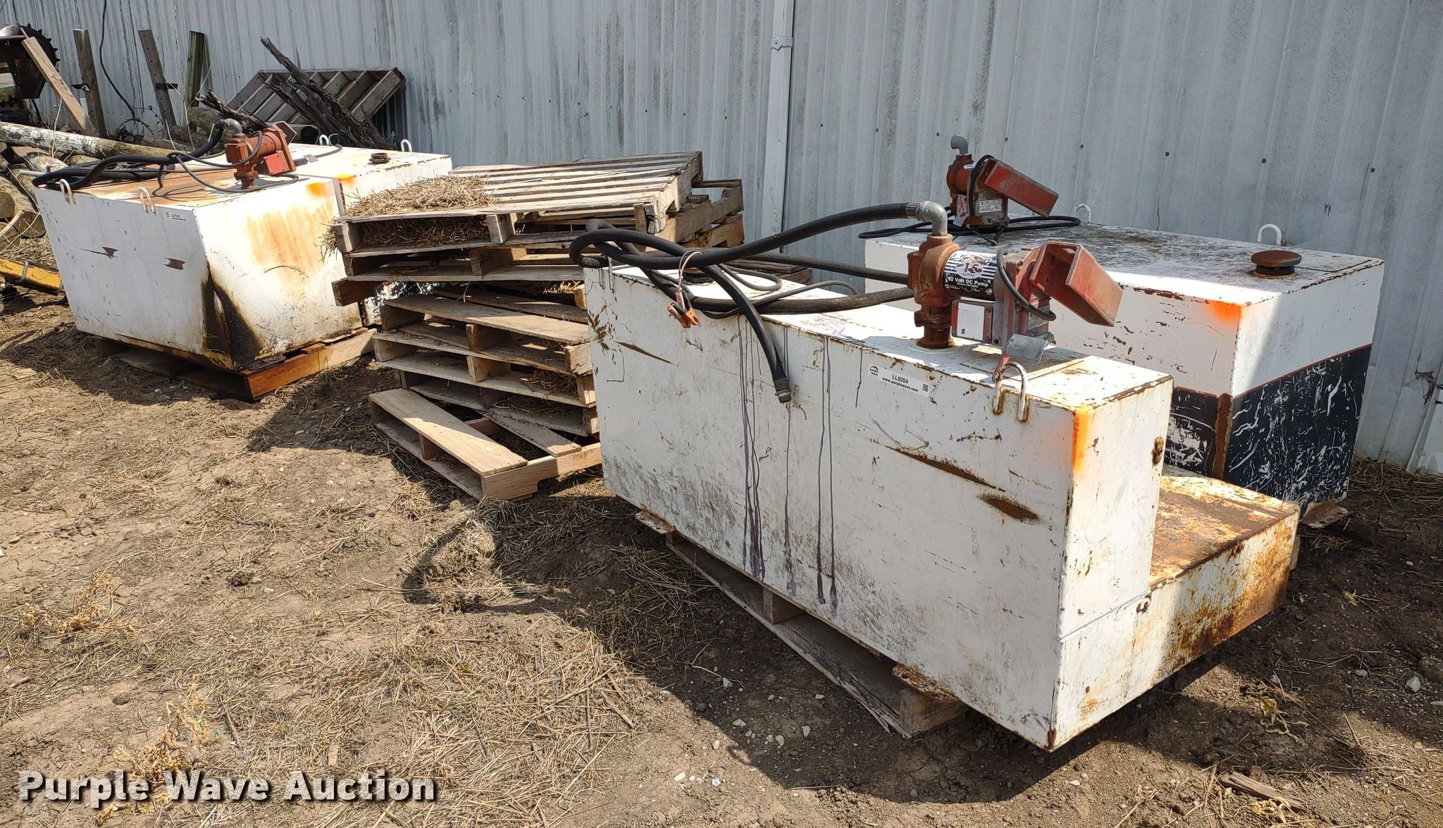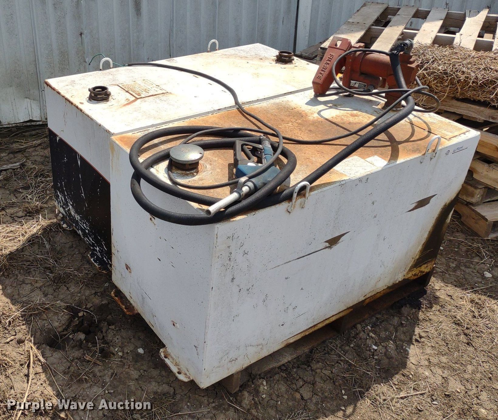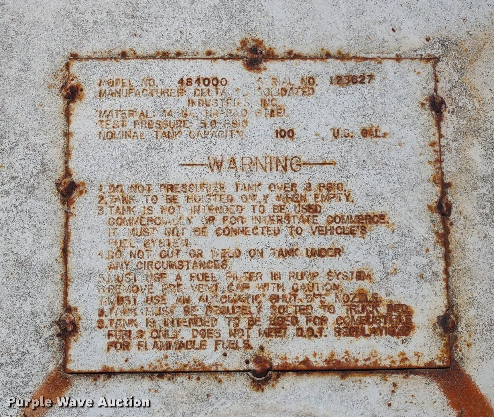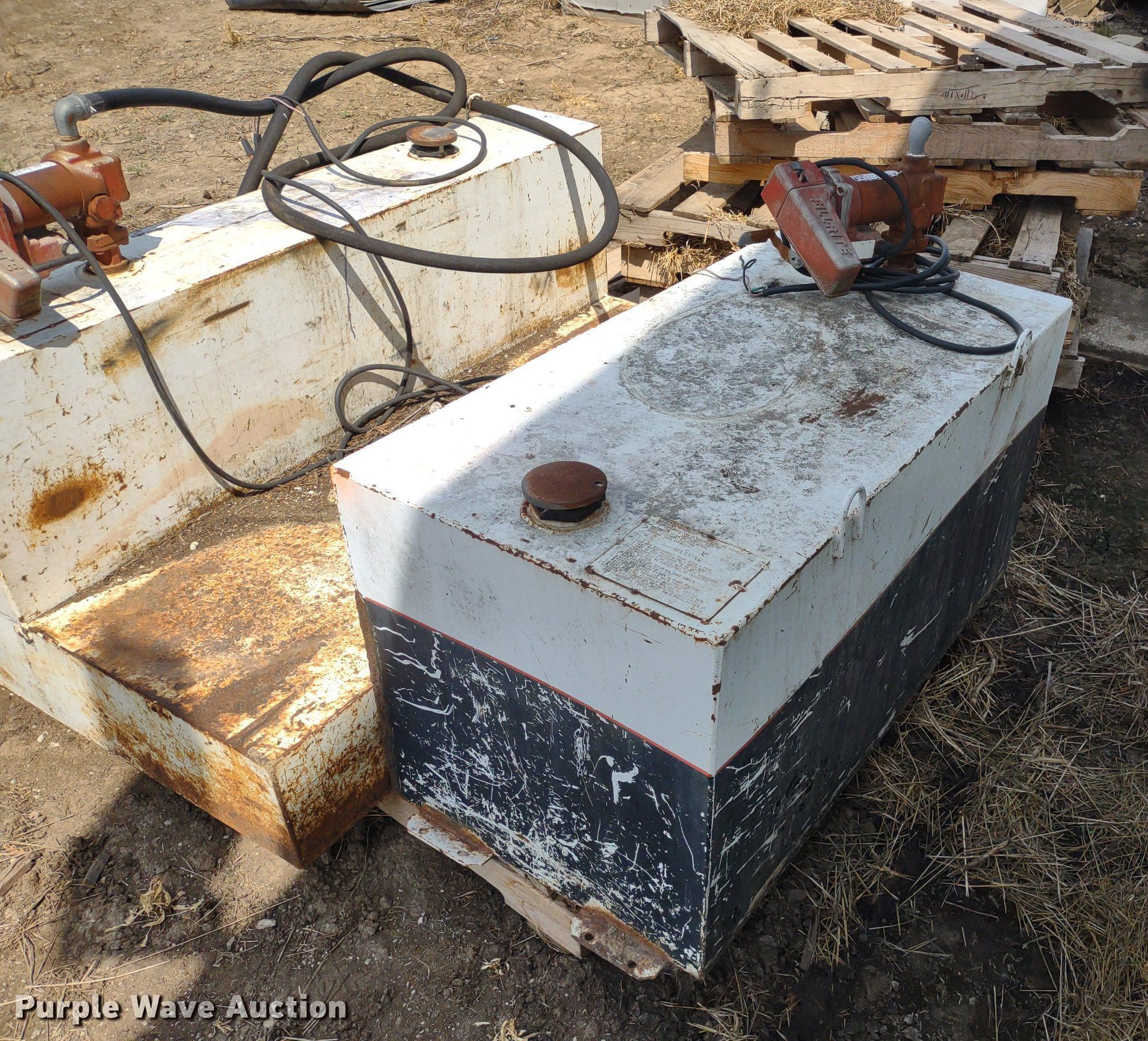 Purple Wave is selling a used Other Attach. or Equip. in Kansas. This item is a (4) Delta auxiliary fuel tanks with the following: (3) Capacity: 100 gallons, (2) Fill-Rite pumps, Capacity: 105 gallons, Fill-Rite pump, Previously used for off-road diesel