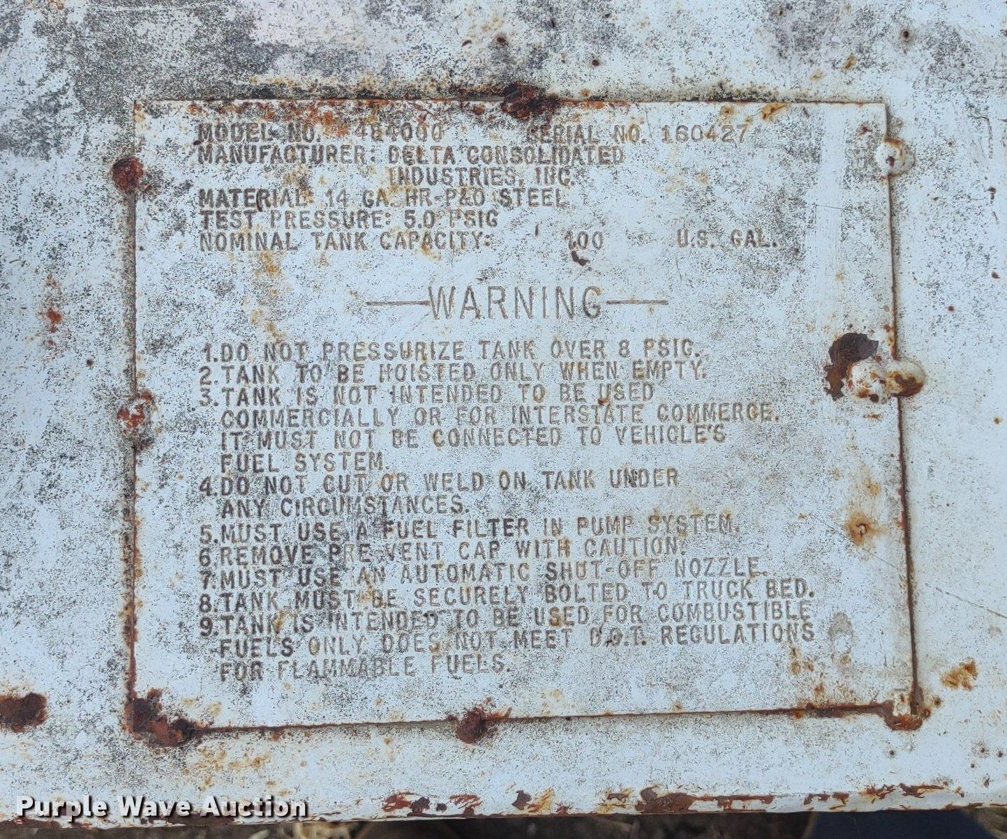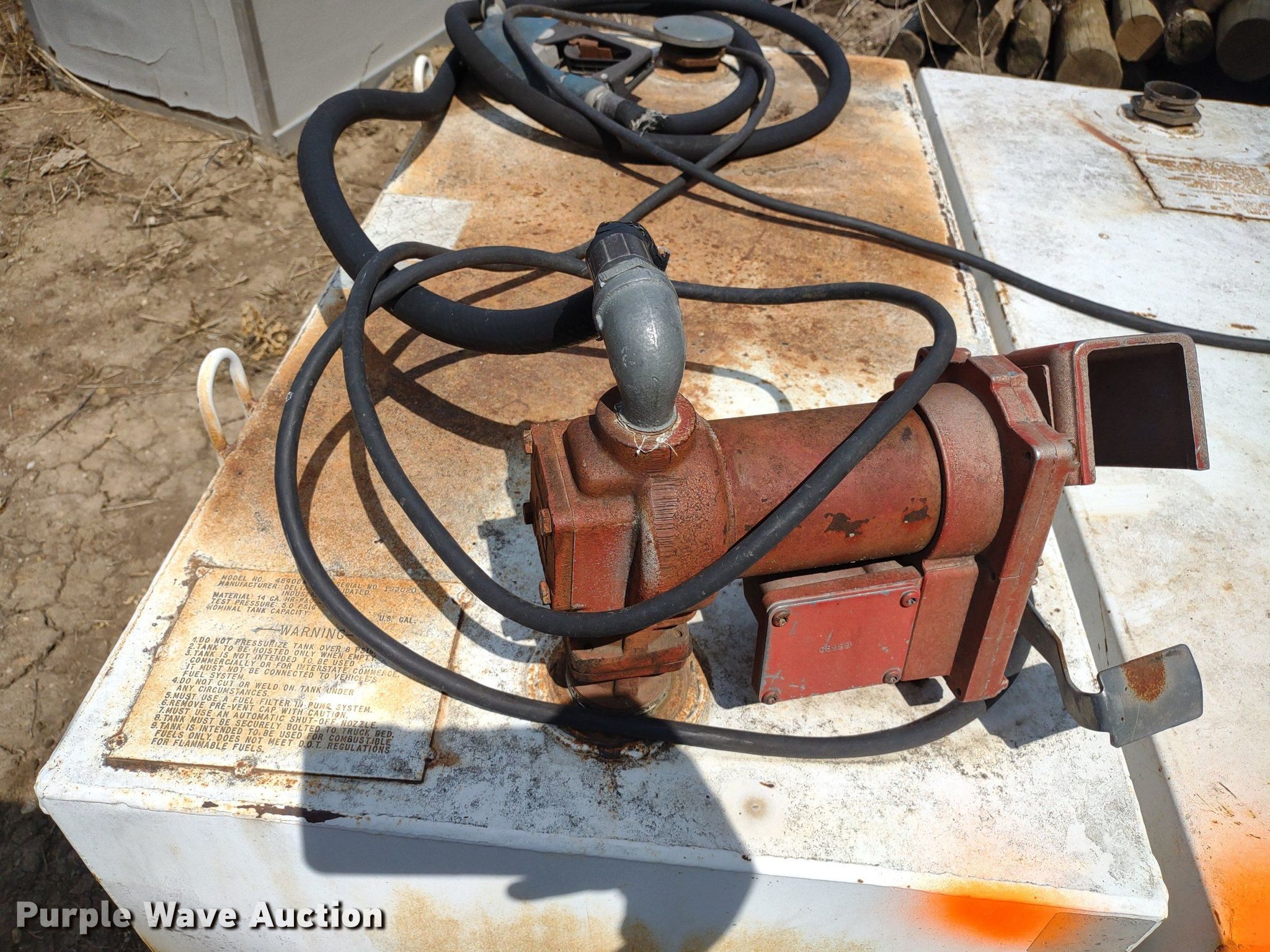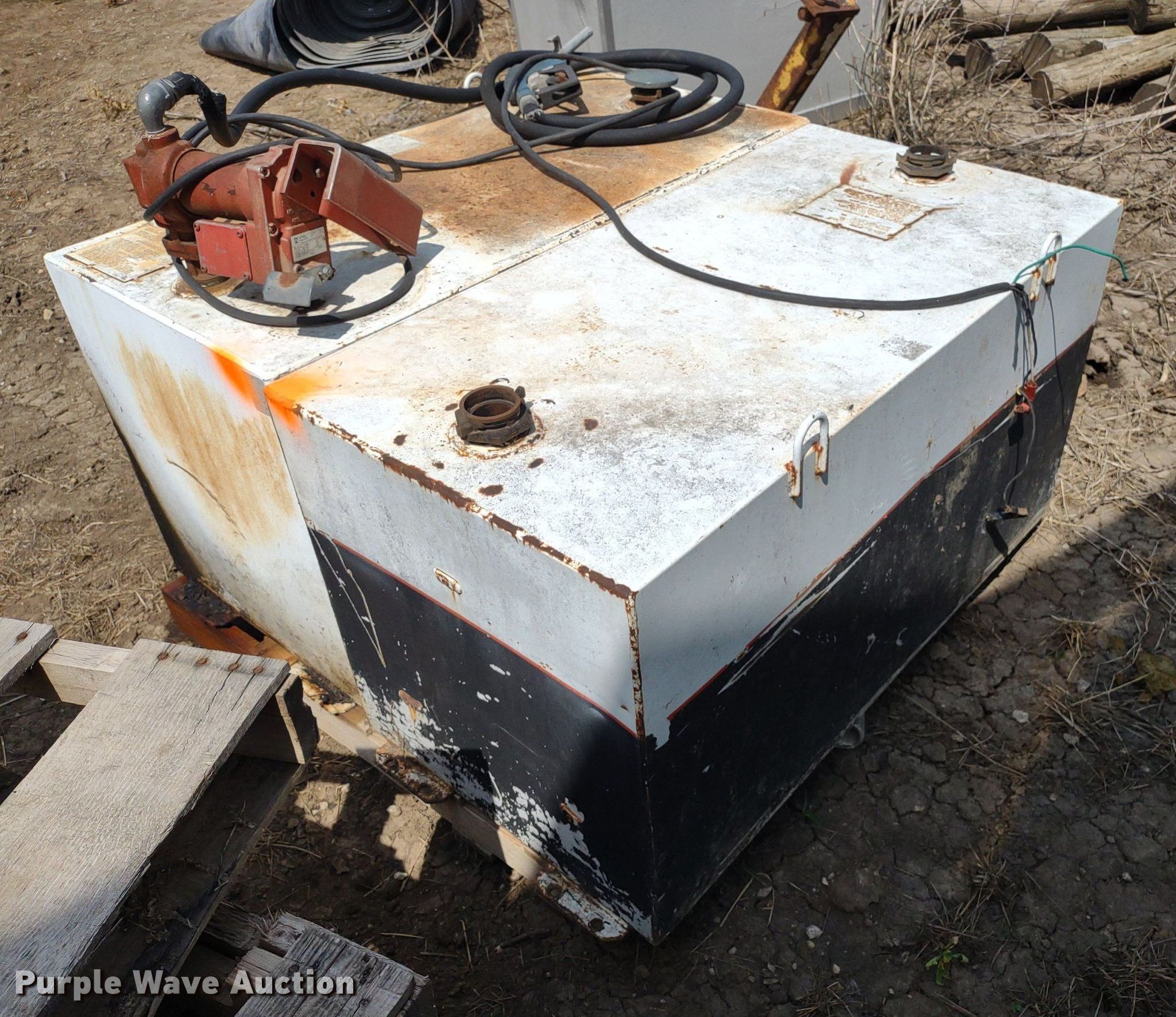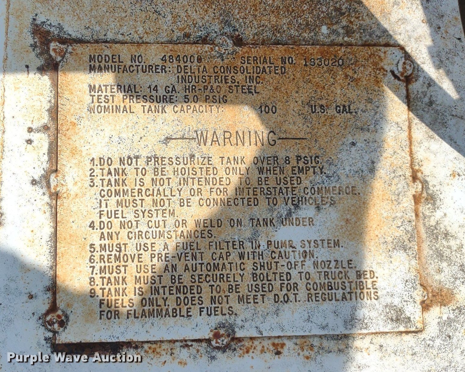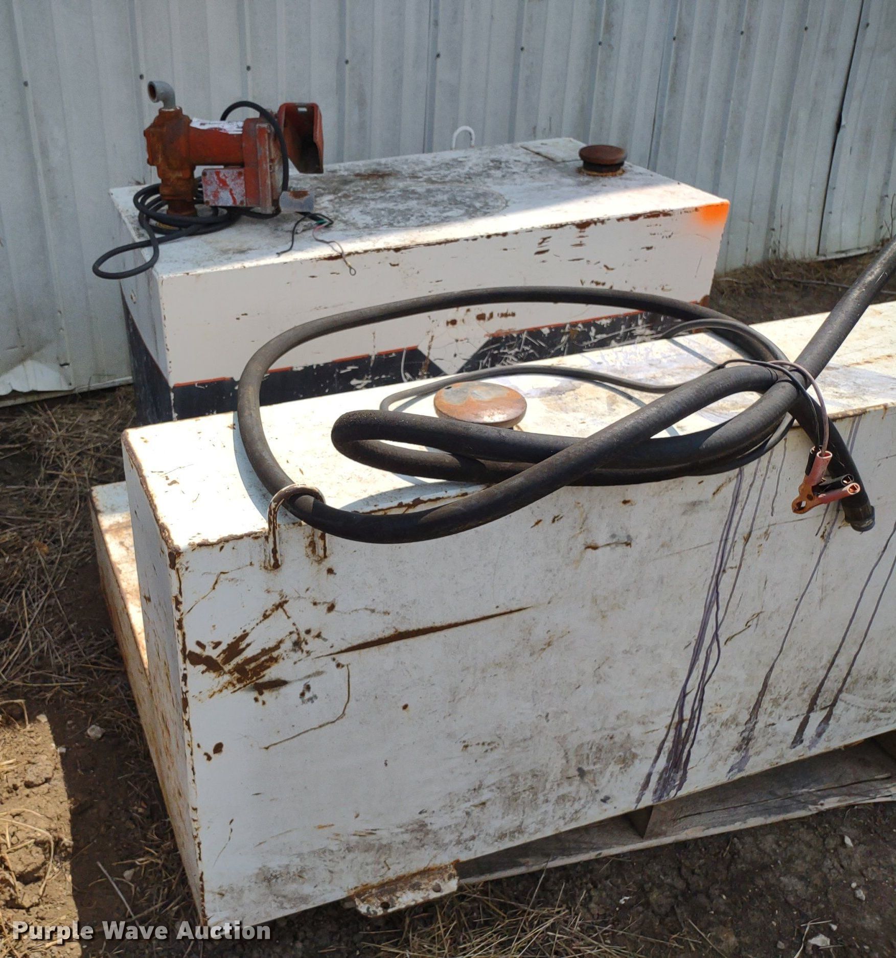 Purple Wave is selling a used Other Attach. or Equip. in Kansas. This item is a (4) Delta auxiliary fuel tanks with the following: (3) Capacity: 100 gallons, (2) Fill-Rite pumps, Capacity: 105 gallons, Fill-Rite pump, Previously used for off-road diesel