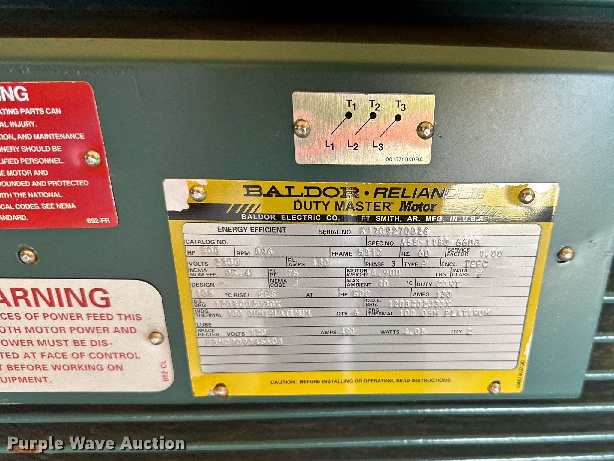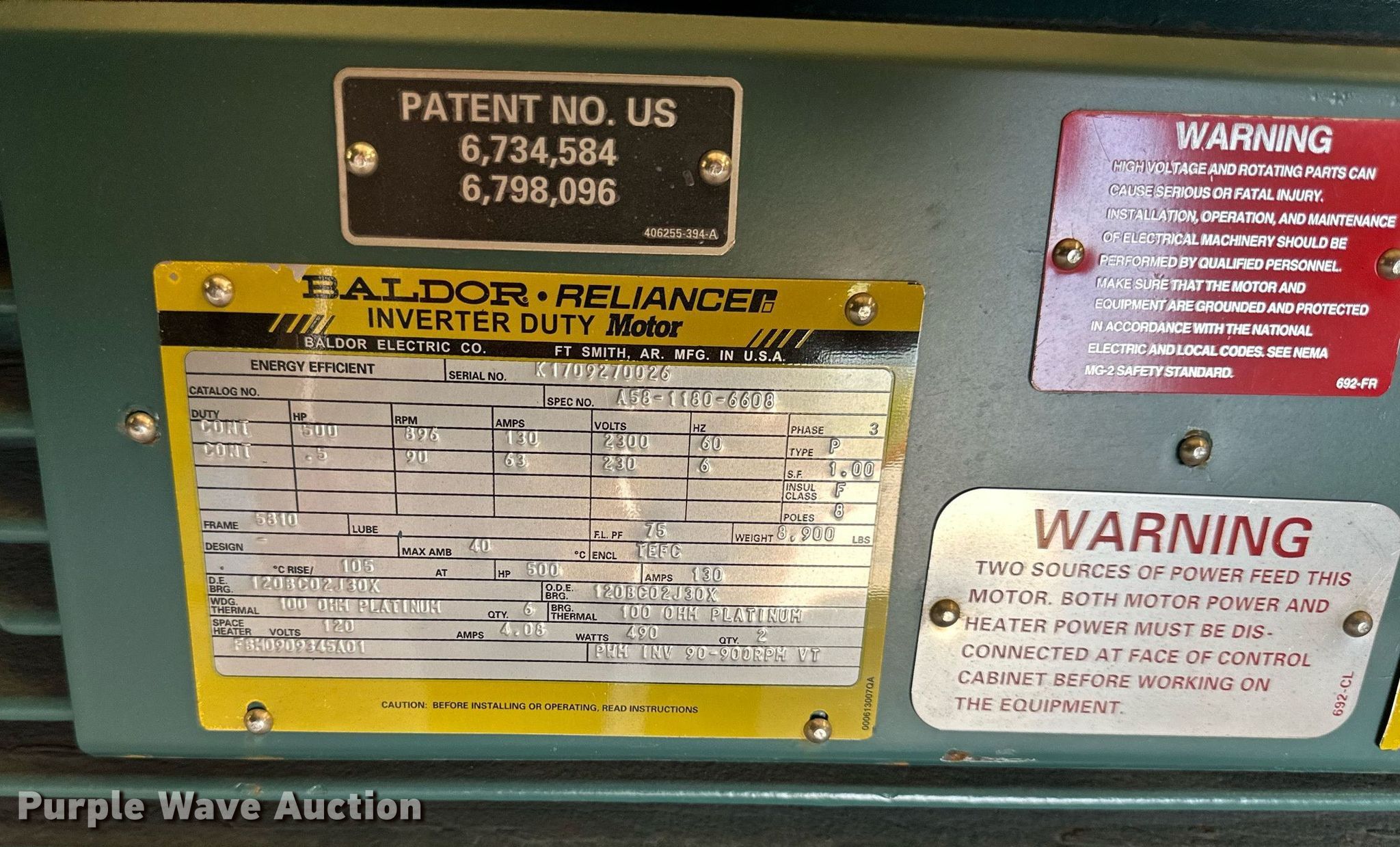 Purple Wave is selling a used Electric Motor in Kansas. This item is a Baldor Reliancer electric motor with the following: Height: 81", HP: 500, Volts: 2300, Phase: Three