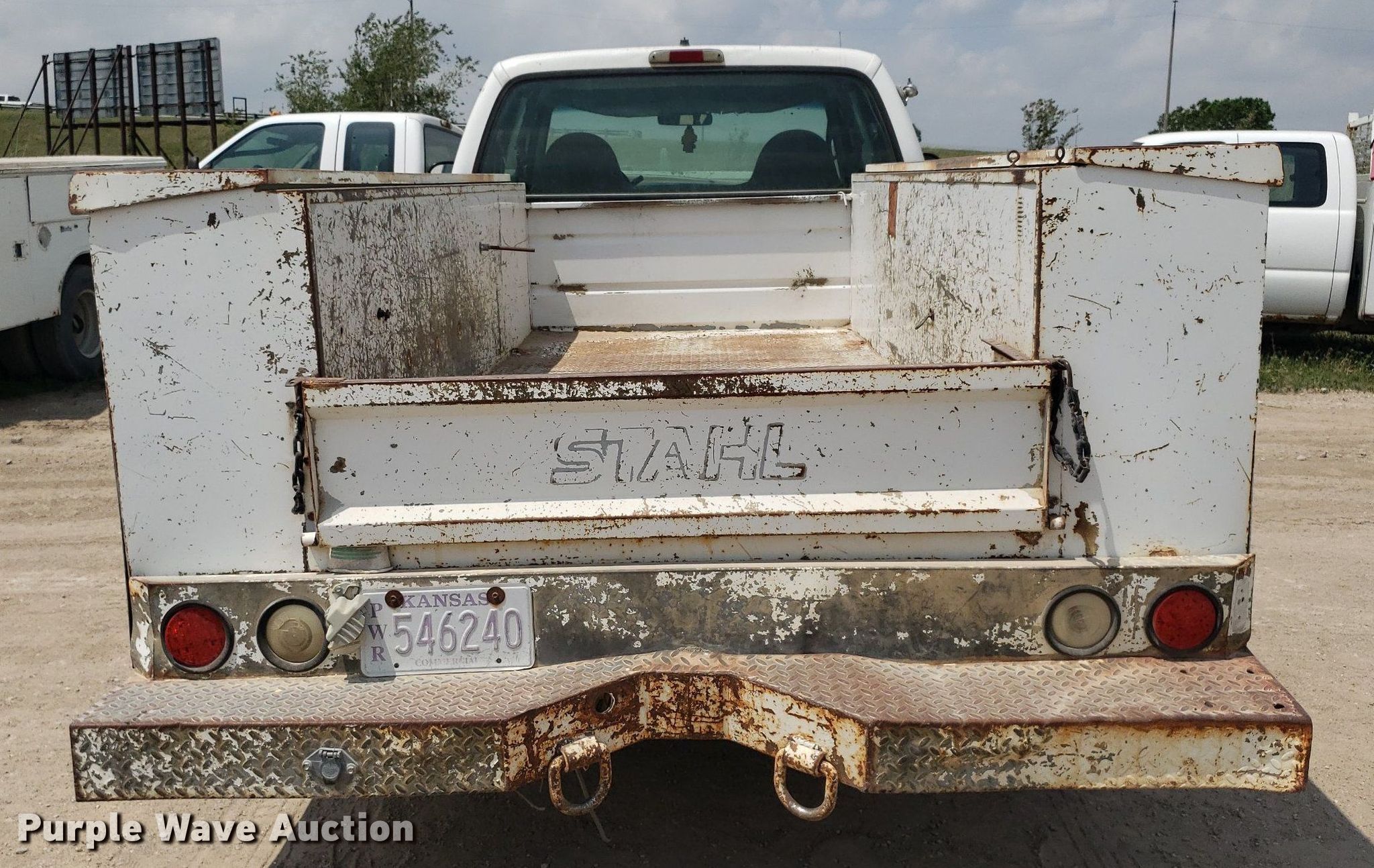 1999 Ford F350 Super Duty SuperCab utility bed pickup truck. Miles: 301,584 on odometer, VIN: 1FDSX34F6XEE74841. Engine Displacement: 7.3L V8 OHV, Cylinders: 8, Fuel type: Diesel. Transmission Automatic. Interior AC, Heat, Cruise control. Features Utility bed Stahl, 10' L x 79" W. Tires Size: 265/75R16. Notes Flat tire, Dead battery, Non-operational unit. Kansas title. Kansas Paving. 4880 North Broadway Street. Wichita, KS 67219