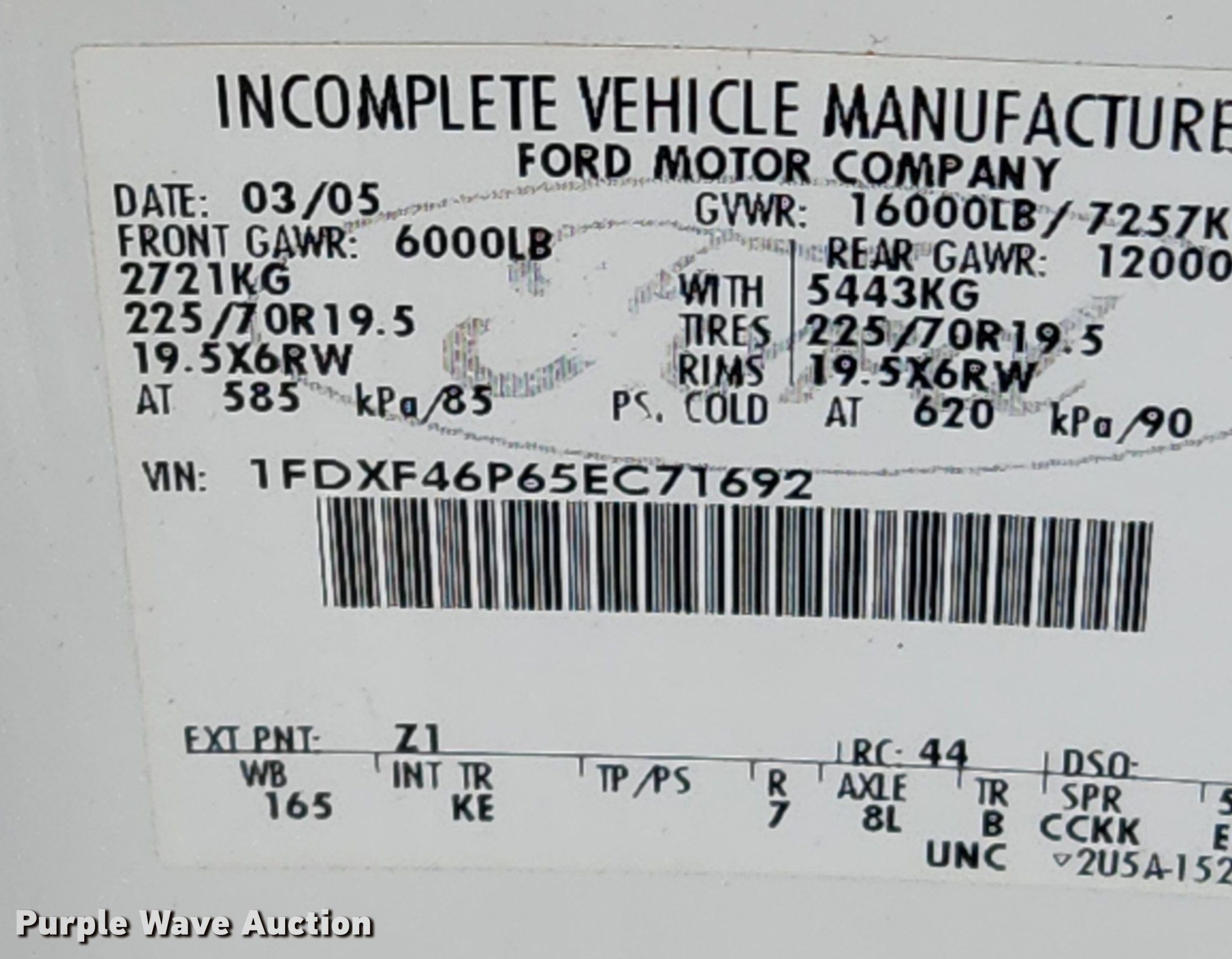 2005 Ford F450 Super Duty XL utility / service truck. Miles: 126,933 on odometer, VIN: 1FDXF46P65EC71692. Engine Displacement: 6.0L, Cylinders: 8, Fuel type: Diesel. Transmission Automatic. Chassis Axles: Single, Suspension: Spring, Brakes: Hydraulic. Interior AC, Heat. Features Bed Reading, 11' L x 96" W. Tires Size: 225/70R19.5. Notes Dead battery. Ohio title. Seller is a Missouri licensed motor vehicle dealer. Title will be assigned and distributed by the dealer. Please contact the seller for distribution questions. Title distribution may be delayed up to 30 days from verification of funds. Fruendly Auto Source Inc.. 110 Raceway Park Dr. Moscow Mills, MO 63362