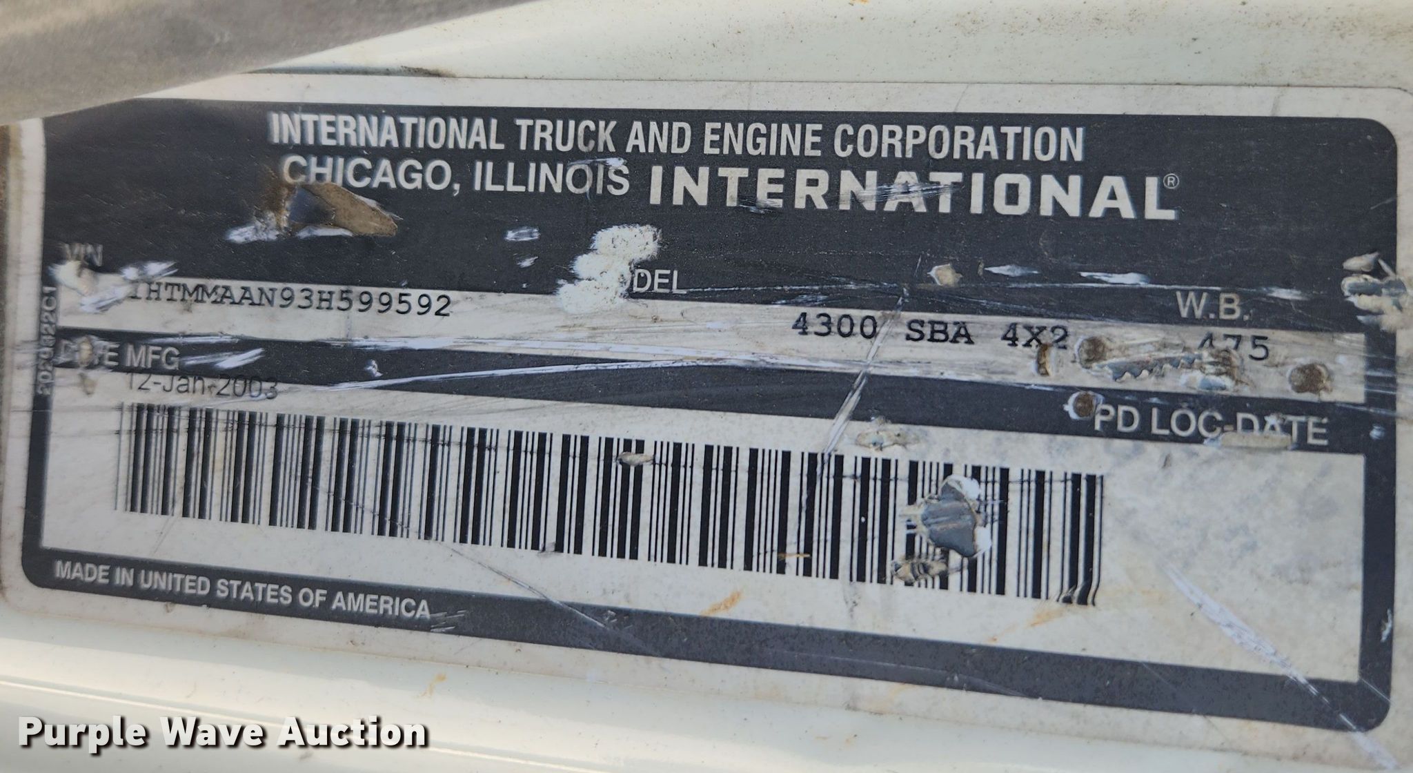 Purple Wave is selling a used Truck Chassis in Missouri. This item is a 2003 International 4300 truck cab and chassis with the following: Miles: 137,479 on odometer, Hours: 12,141 on meter, VIN: 1HTMMAAN93H599592