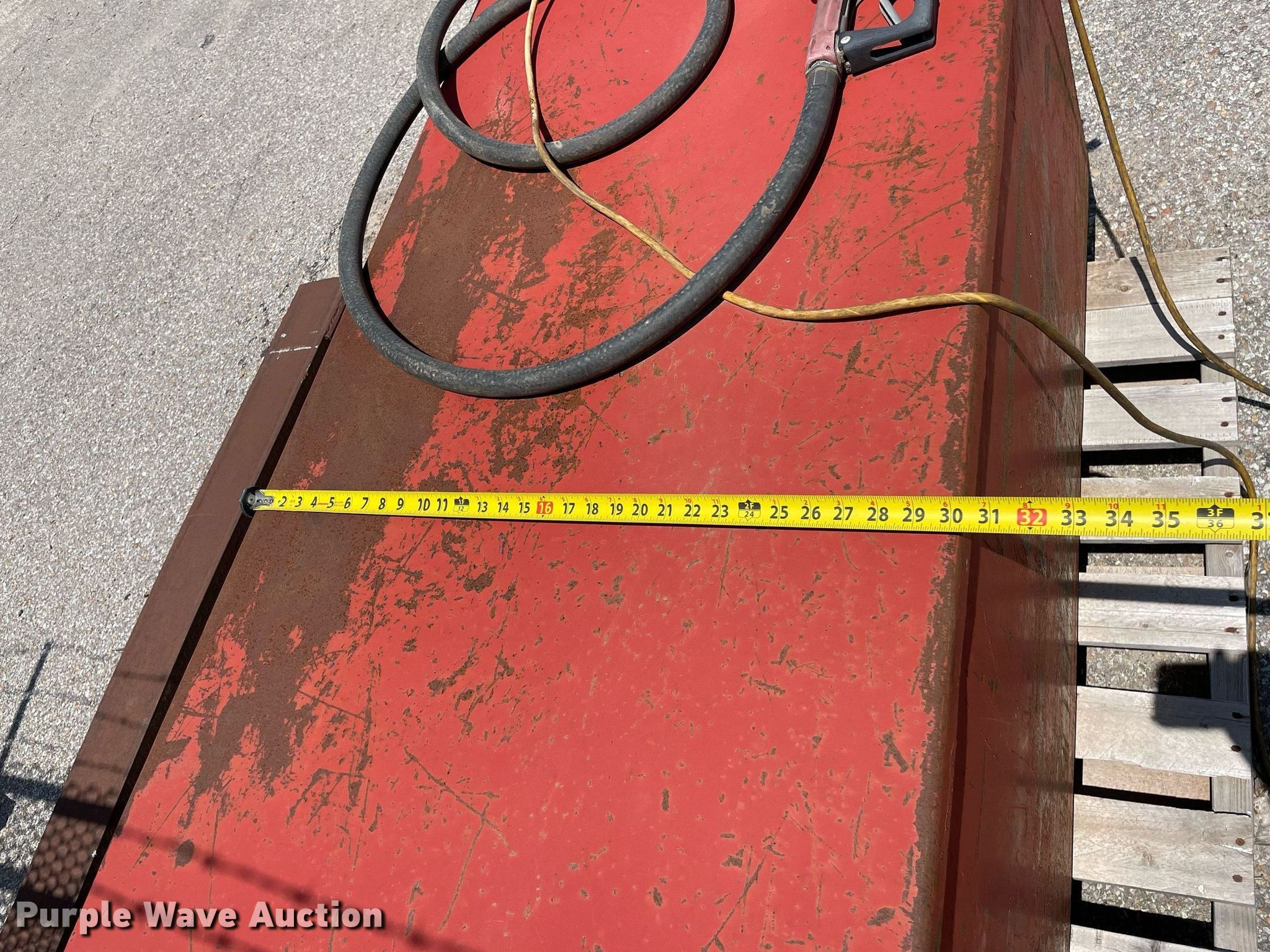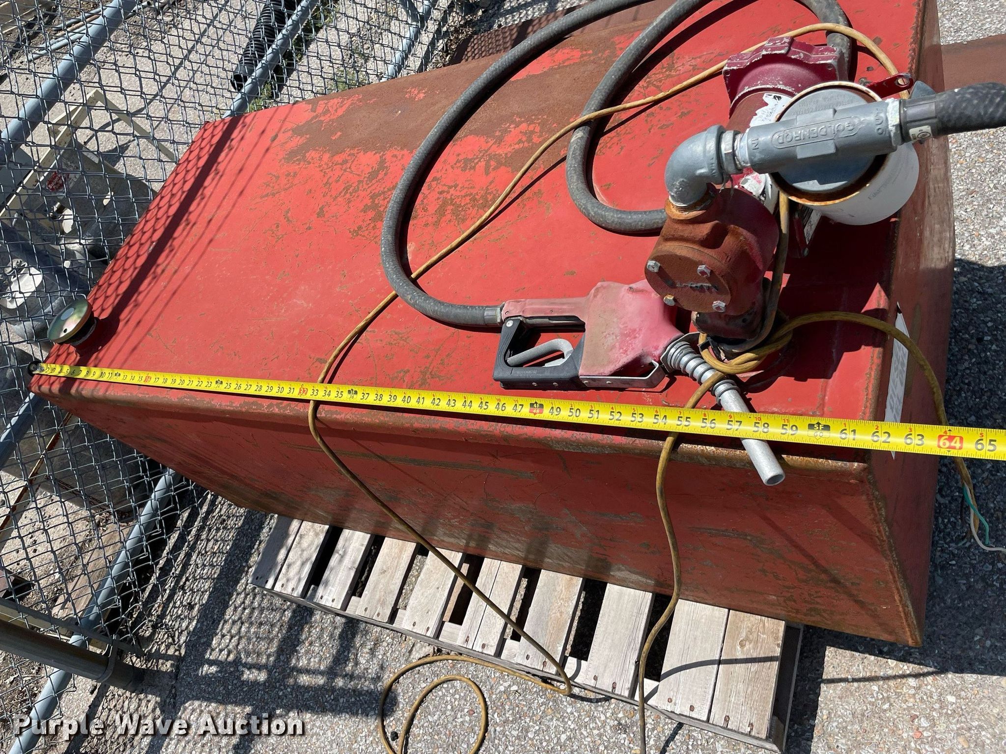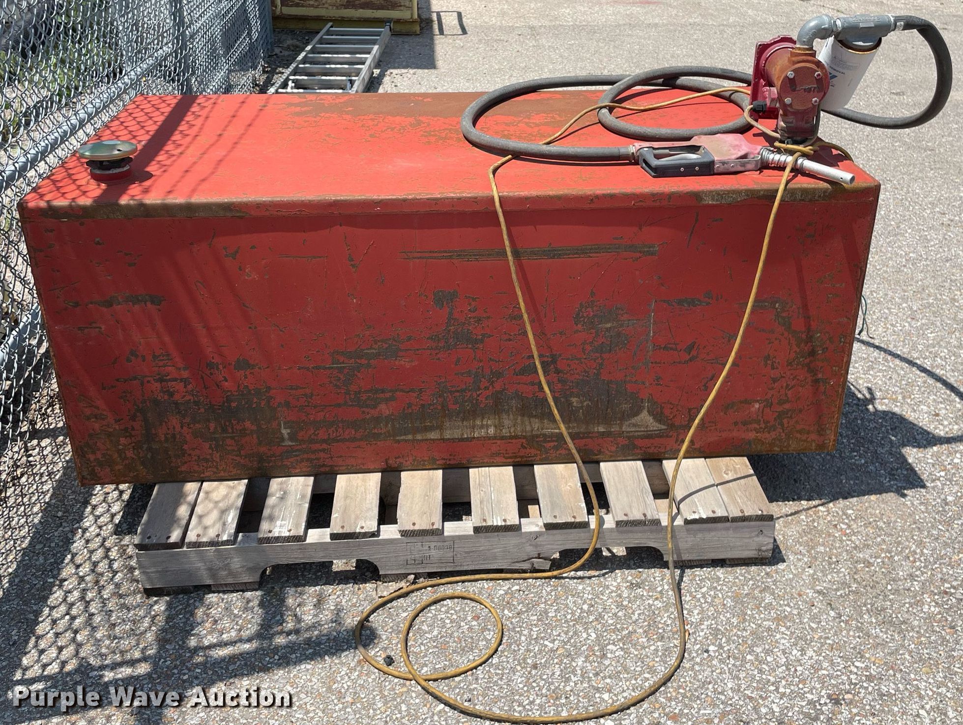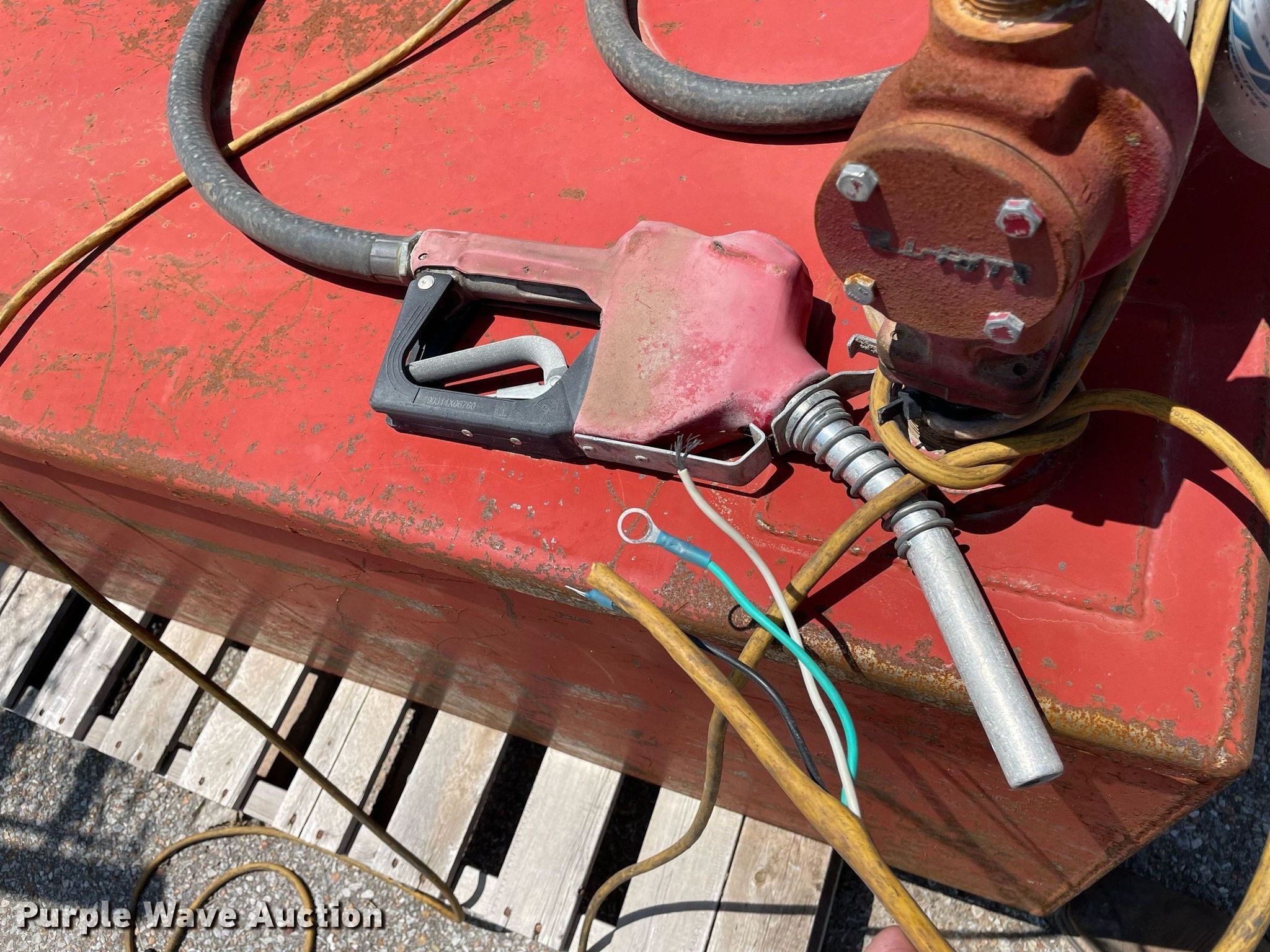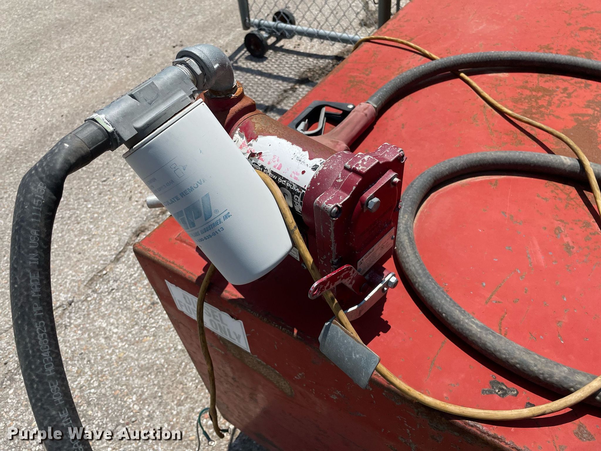 Purple Wave is selling a used Fuel and Lube in Kansas. This item is a Auxiliary fuel tank with the following: 62" L x 30" W x 24" H, Fill-rite pump, Tuthill 12V electric motor, Hose, Nozzle