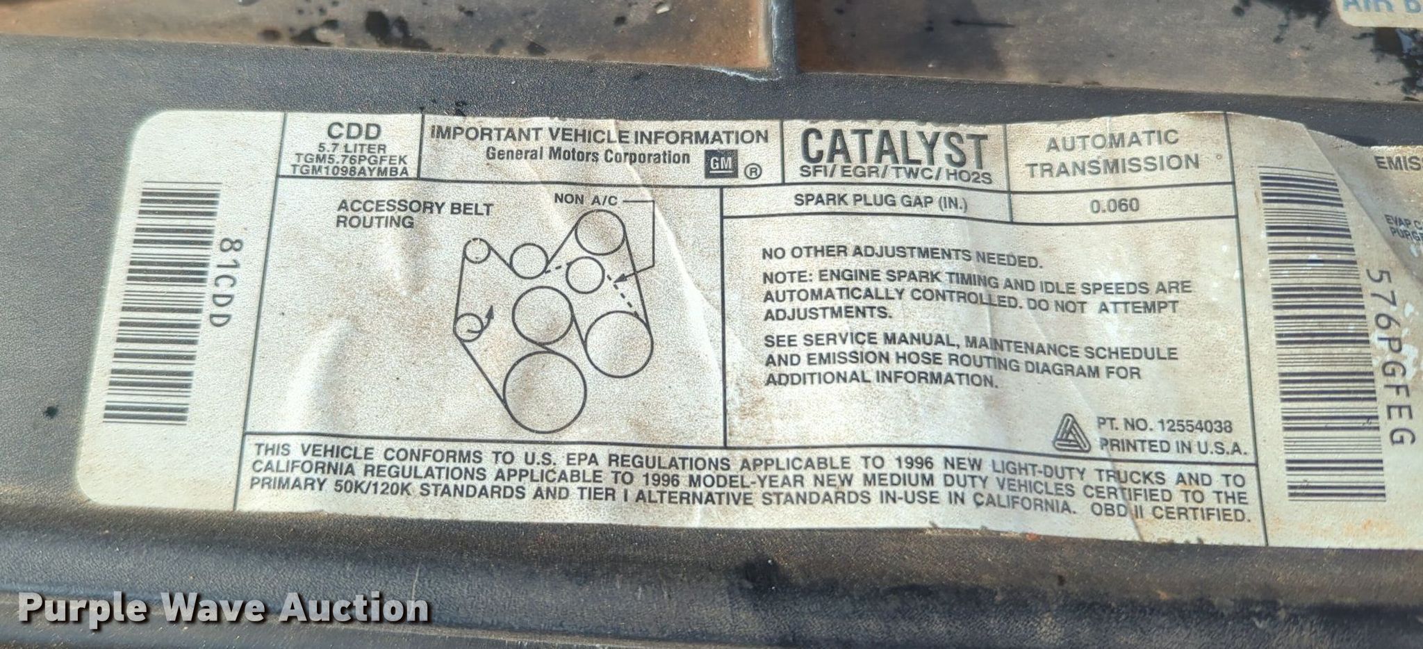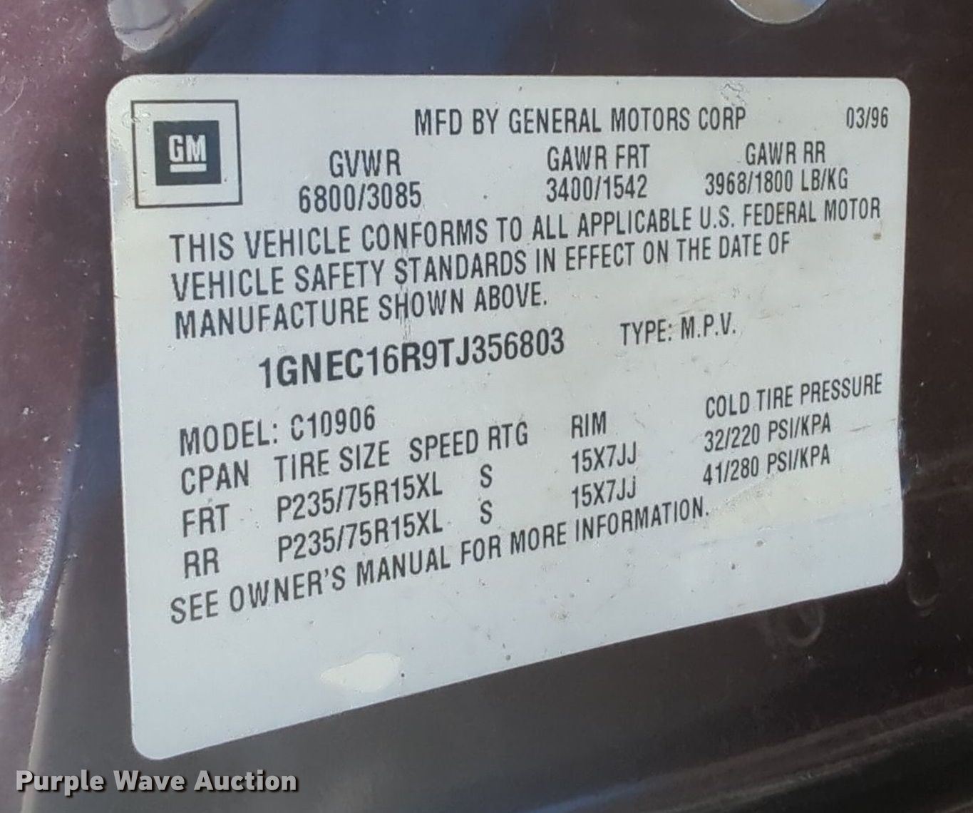 Purple Wave is selling a used Passenger Vehicle in Oklahoma. This item is a 1996 Chevrolet Suburban SUV with the following: Miles: 338,071 on odometer, VIN: 1GNEC16R9TJ356803
