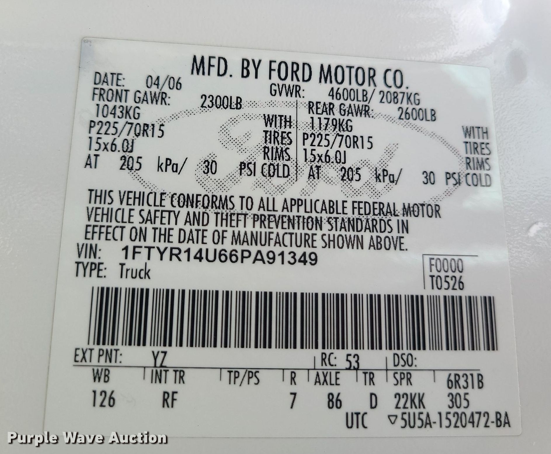2006 Ford Ranger SuperCab pickup truck. Miles: 229,140 on odometer, VIN: 1FTYR14U66PA91349. Engine Displacement: 3.0L V6 OHV, Cylinders: 6, Fuel type: Gas. Transmission Automatic. Interior AC, Heat. Tires Size: 225/70R15. Missouri title. Seller is a Missouri licensed motor vehicle dealer. Title will be assigned and distributed by the dealer. Please contact the seller for distribution questions. Title distribution may be delayed up to 14 days from verification of funds. Bossert Service & Body Shop. 434 NE 32nd St. Kansas City, MO 64116