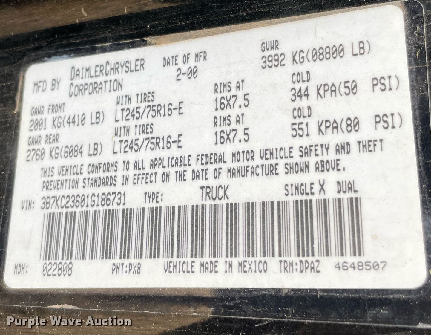 Purple Wave is selling a used 3/4 or 1 Ton Pickup or Van in Oklahoma. This item is a 2001 Dodge Ram 2500 Quad Cab pickup truck with the following: Miles: Unknown, VIN: 3B7KC23601G186731