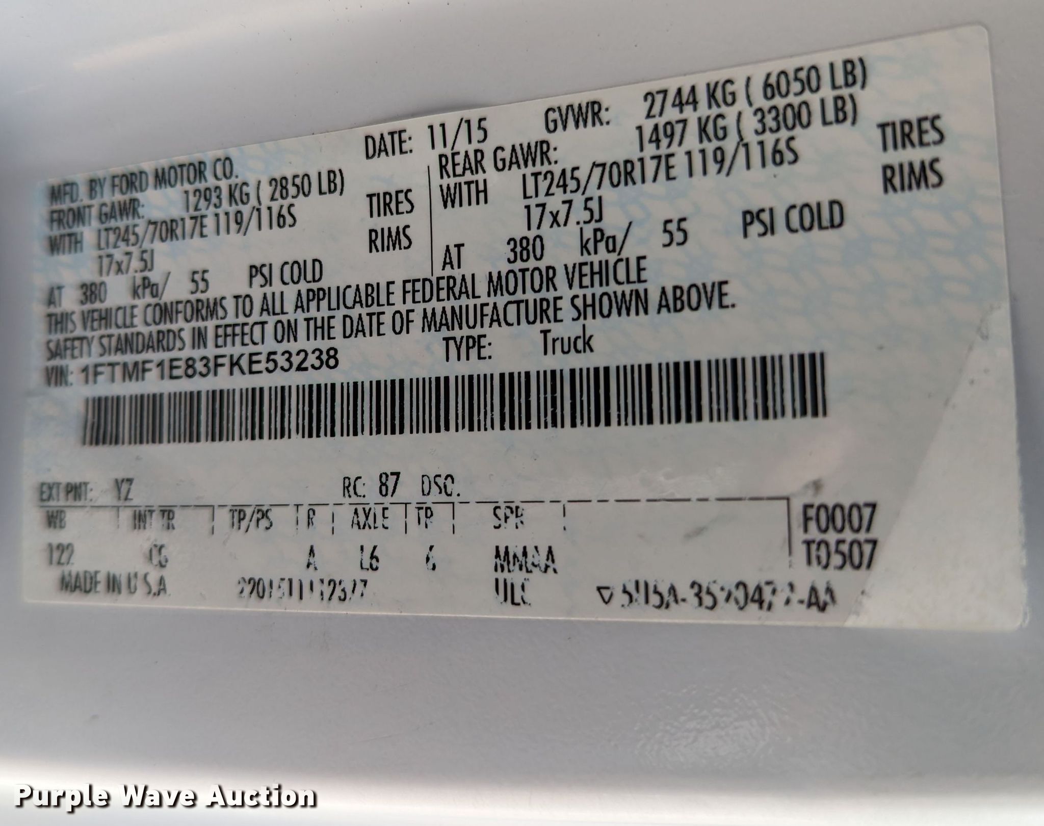 2015 Ford F150 pickup truck. Miles: 131,816 on odometer, VIN: 1FTMF1E83FKE53238. Engine Displacement: 3.5L V6 DOHC, Cylinders: 6, Fuel type: Gas. Transmission Automatic, Four wheel drive. Interior AC, Heat, Power windows, Power locks, Cruise control. Tires Size: 275/62R18. New Hampshire title. Title distribution may be delayed up to 30 days from verification of funds. L&R Auto Brokers, LLC. 14555 W Frisco Dr. Yukon, OK 73099