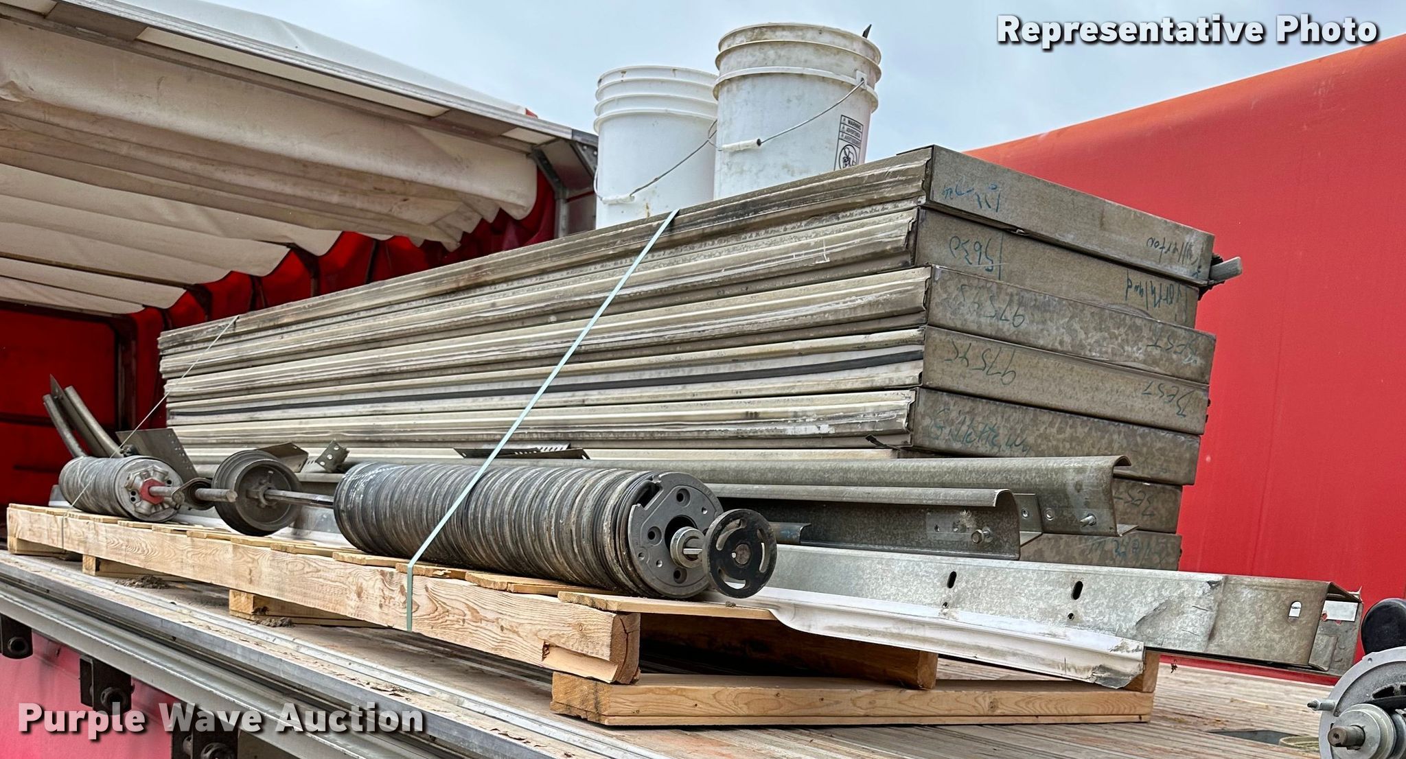 Purple Wave is selling a used Building Materials in North Dakota. This item is a Garage door with the following: 20'2" x 18'3", Tracks, Motor, Unit has been disassembled