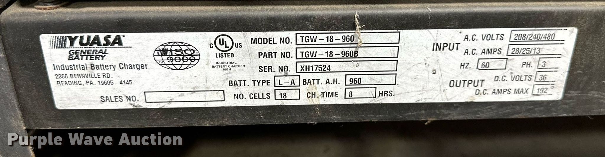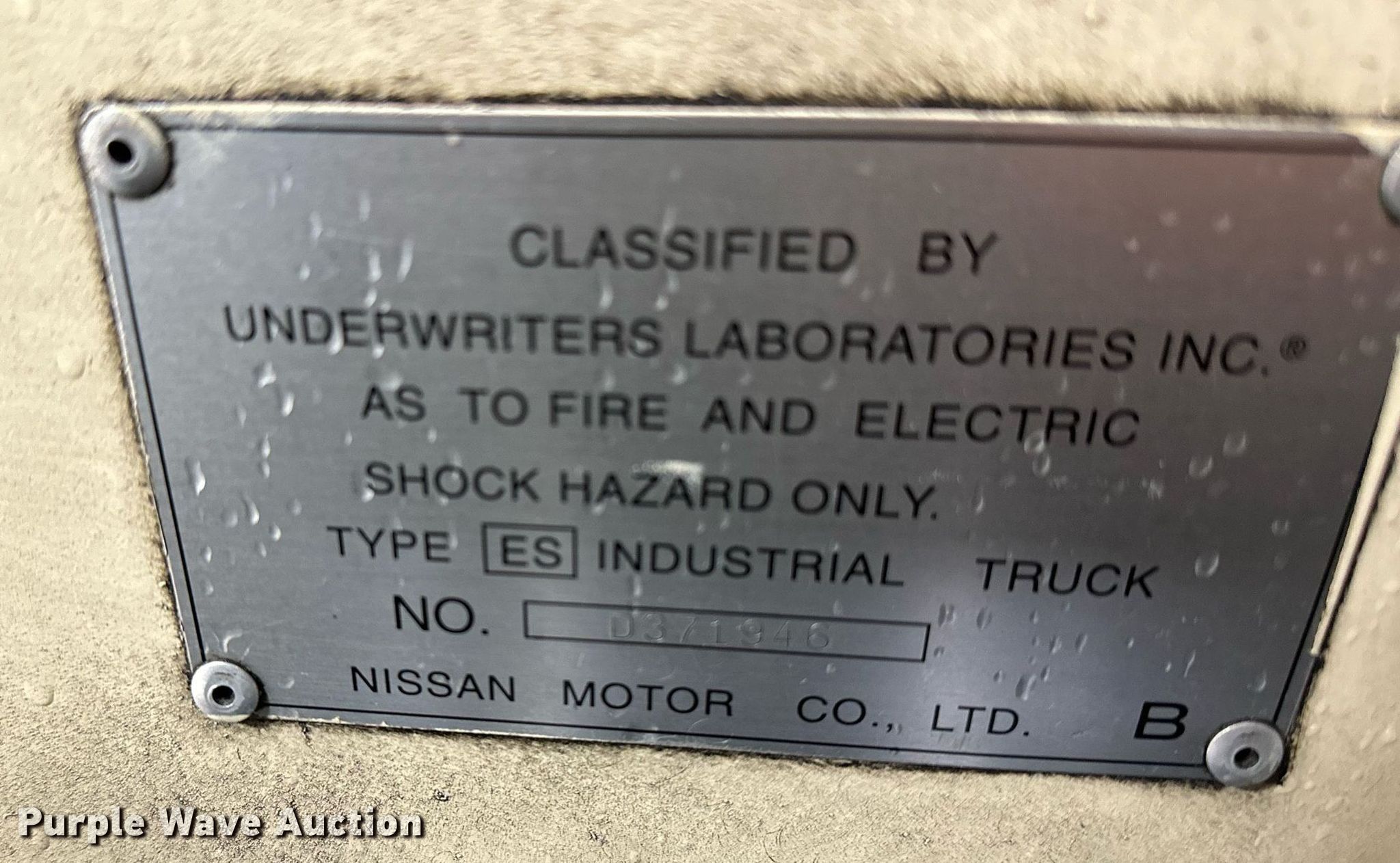 Nissan 50 forklift. Hours: 12,782 on meter, Serial: CWPO-9C1456. Electric Motor Underwriters Laborties Inc, Volts: 36, Phase: Three, Charger: Three phase. Transmission Powershift. Operators station OROPS. Features Maximum lift capacity: 3,150 lbs, Maximum lift height: 188", Mast stages: 3, Side shift, Mast tilt, Fork length: 36". Tires Front: 21x7x15, Solid. Ryan Lawn & Tree. 2301 North Beech Avenue. Broken Arrow, OK 74012