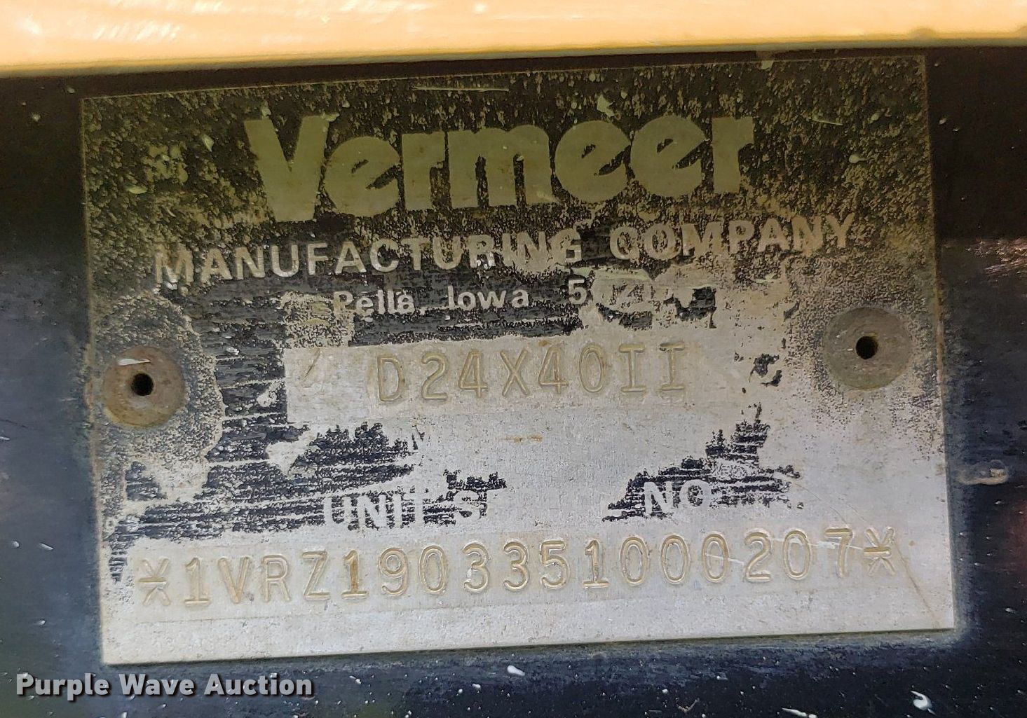 2005 Vermeer D24X40 Series II Navigator directional boring unit. Hours: Unknown, Serial: 1VRZ1903351000207. Engine John Deere, Cylinders: 4, Fuel type: Diesel. Features Drill stems On drill: 51, Drill stem length: 10' 2 3/8 FS1 stems, Auto rod loader, Rear hydraulic stabilizers, Hydraulic stake down. Tracks Width: 16", Steel. Notes Stake down auger hydraulic leak, Possible auto rod loader issues, leaks. Source: HDD. 1816 E. Wasp Road. Hutchinson, KS 67501