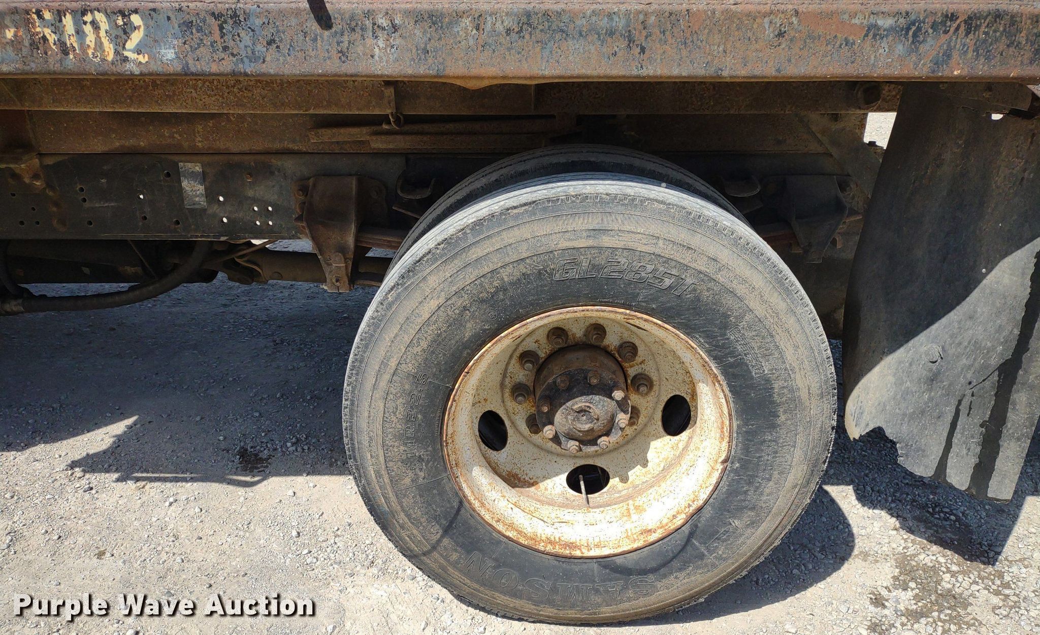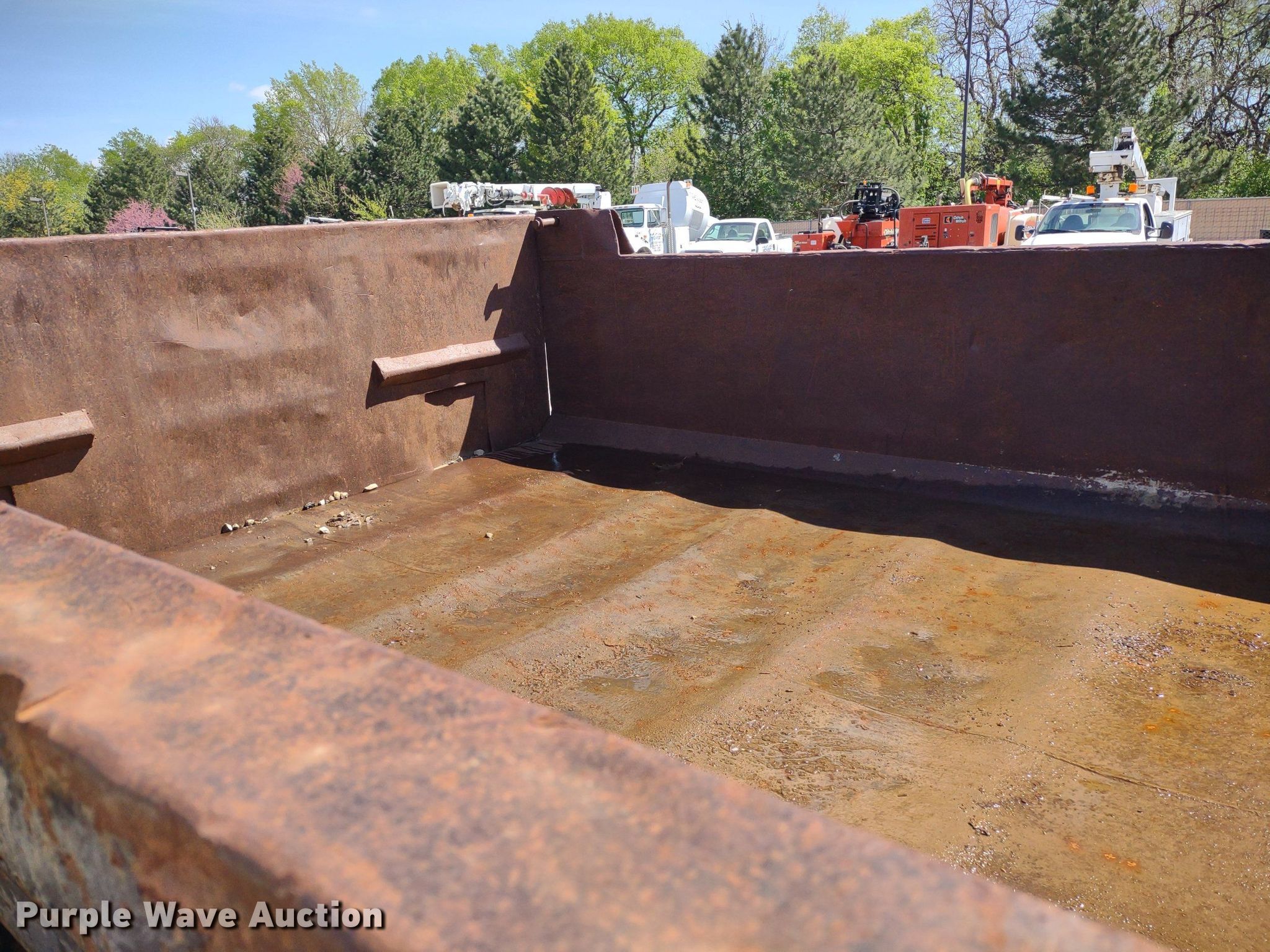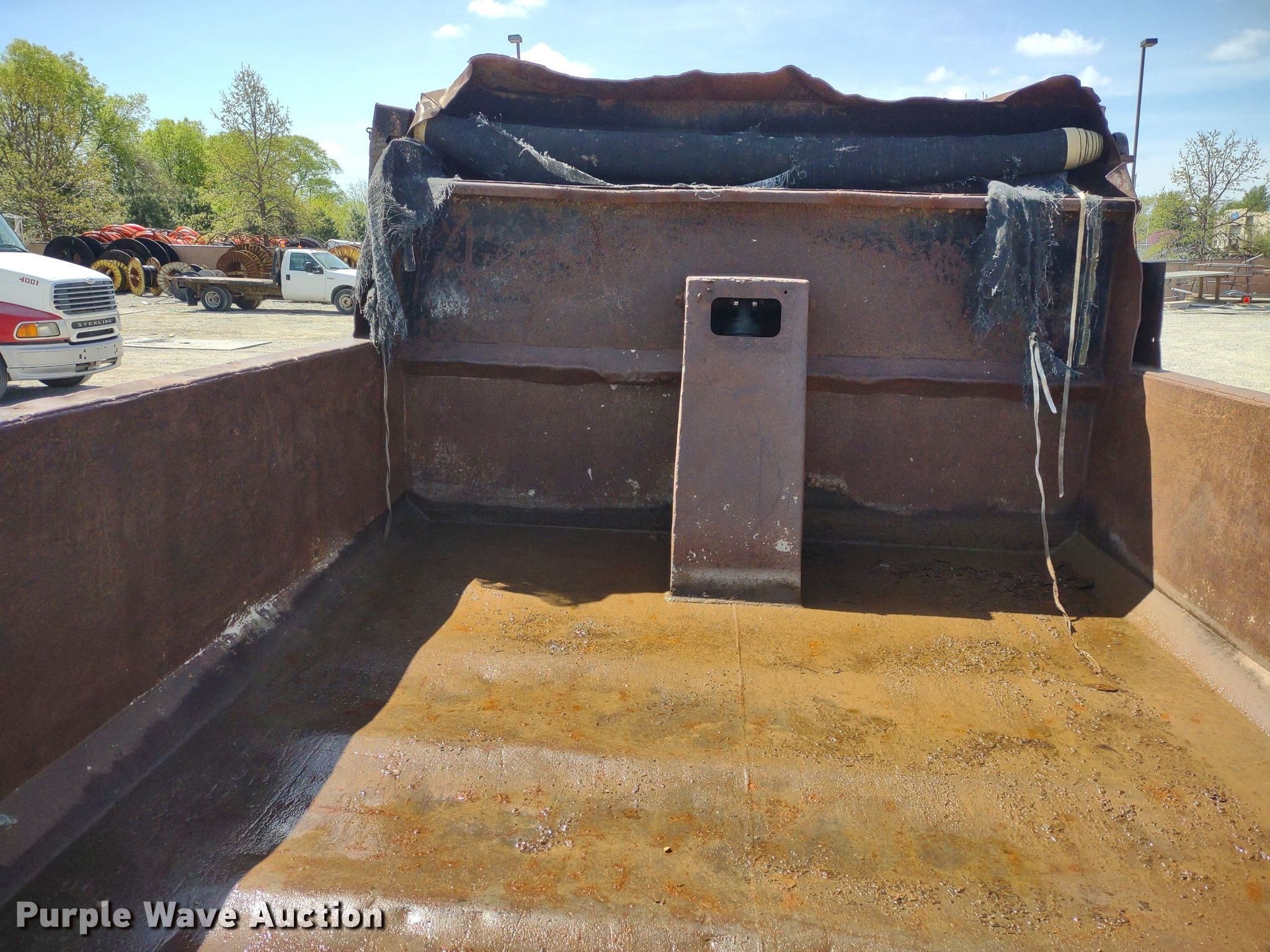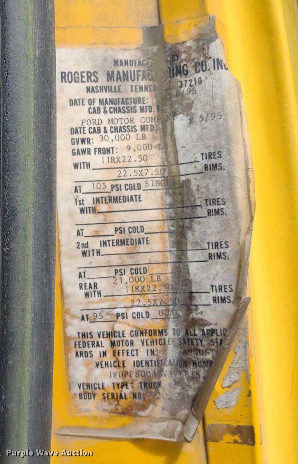 1995 Ford F800 dump truck. Miles: 105,403 on odometer, Hours: 7,834 on meter, VIN: 1FDPF80C1SVA76818. Engine Cummins B5.9-175, Displacement: 5.9L, Cylinders: 6, Fuel type: Diesel. Transmission Manual, Speed: 6. Chassis Double frame, Axles: Single, Suspension: Spring, Brakes: Hydraulic, PTO, GVWR: 30,000 lbs FAWR: 9,000 lbs, RAWR: 21,000 lbs. Interior Heat, Brake controller. Features Dump bed Rogers Manufacturing, 10' L x 8' W, Side height: 25", Bed type: Steel, Roll tarp, Ram: Single , End gate: Manual. Tires Size: 11R22.5. Notes Dash warning indicator: Brake. Kansas title. Heartland Midwest LLC. 15795 South Mahaffie Street. Olathe, KS 66062