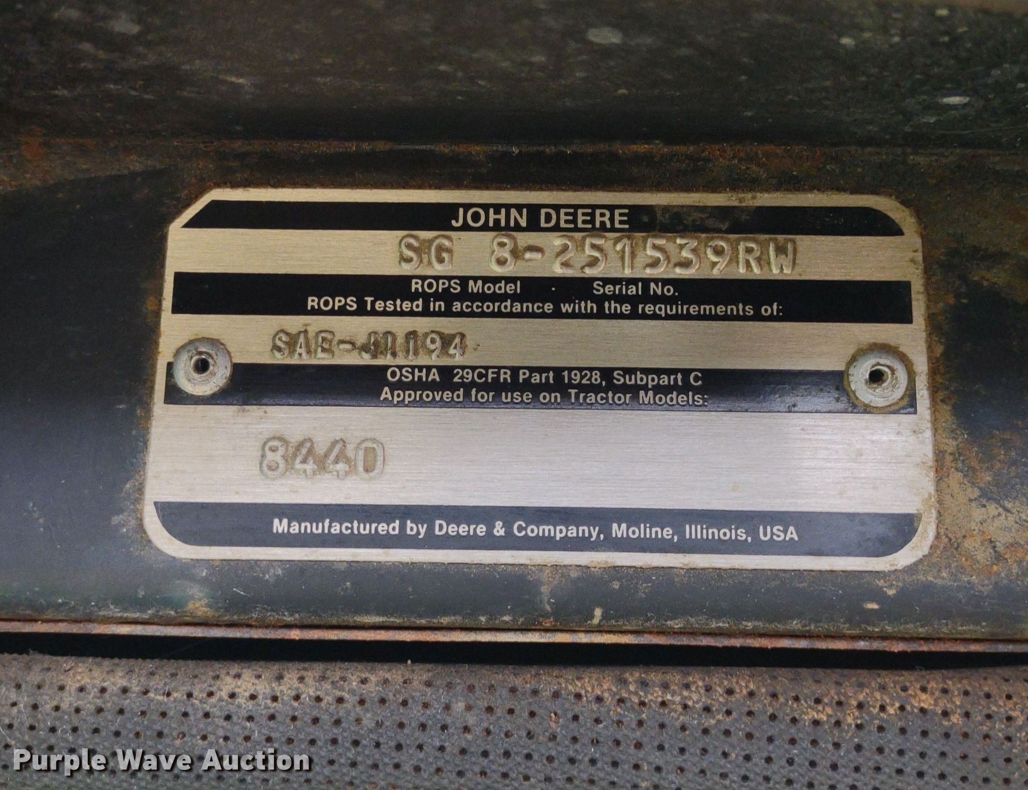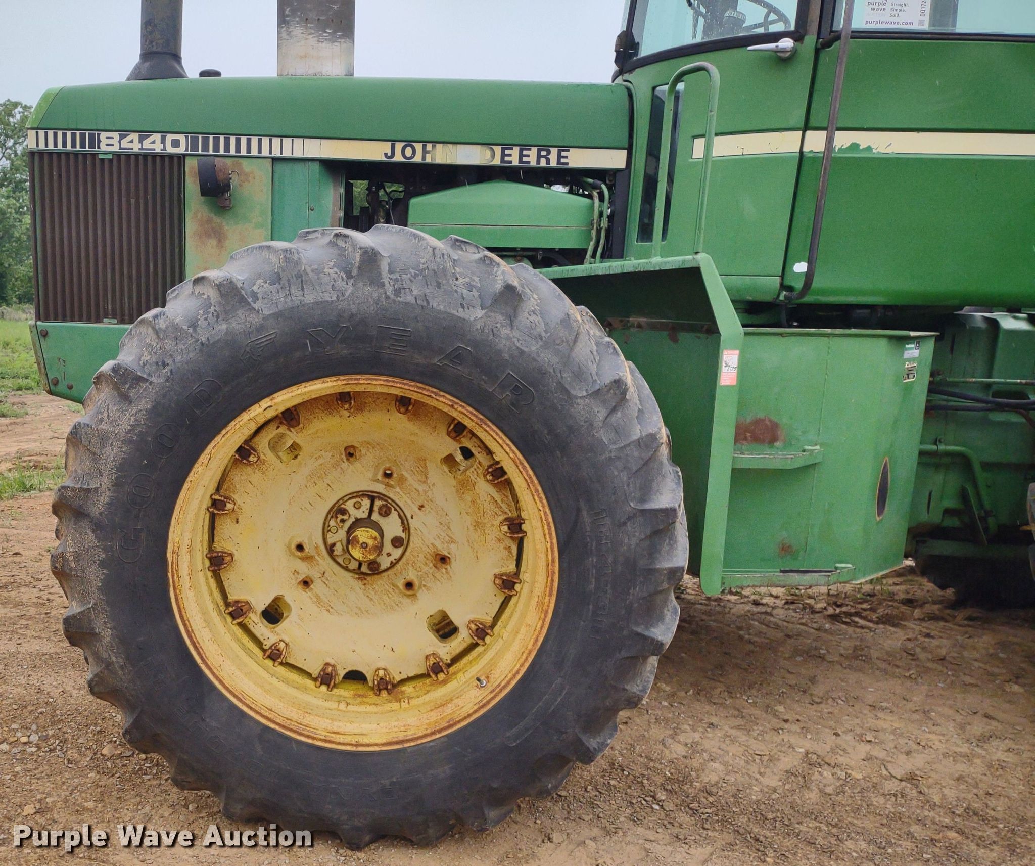 John Deere 8440H 4WD tractor. Hours: 9,935 on meter, Serial: 003216R. Engine John Deere, Displacement: 7.6L, Cylinders: 6, Fuel type: Diesel. Transmission Quad-range, 16F - 6R, Differential lock. Operators station AC, Heat. Features Three point, Hydraulic remote sets Rear: 2. Tires Size: 18.4-38. Liberal, MO 64762