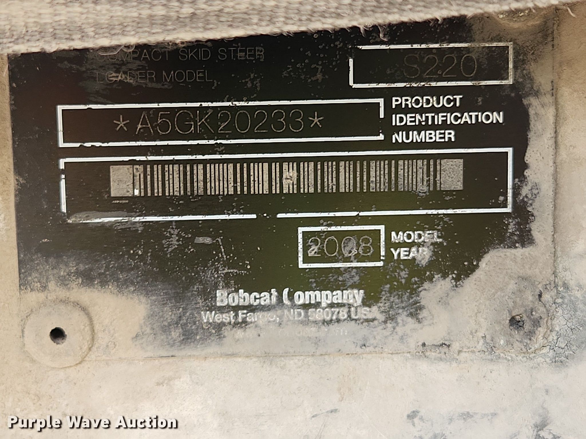 Purple Wave is selling a used Skid Steer Loader in Illinois. This item is a 2008 Bobcat S220 skid steer loader with the following: Hours: 5,993 on meter, Serial: A5GK20233
